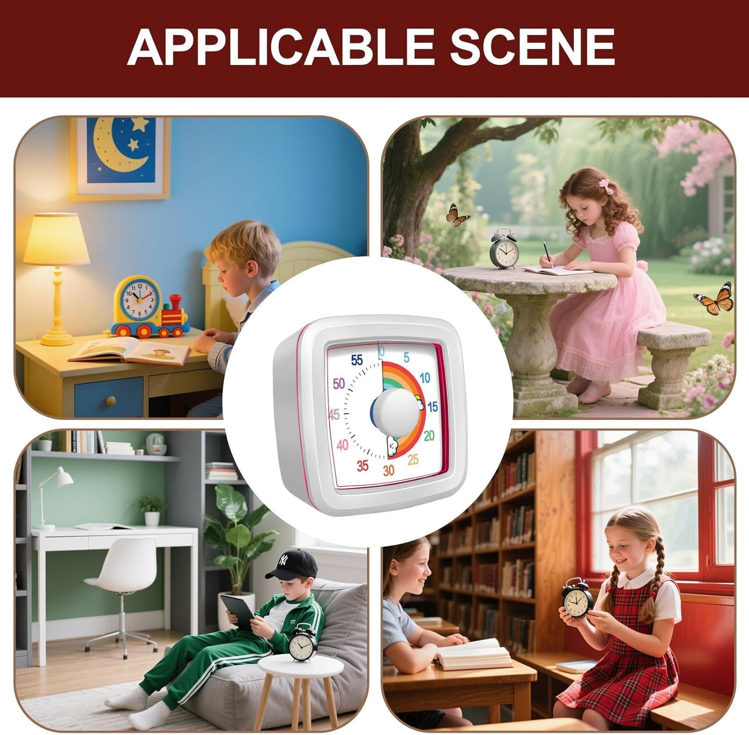 Apprendimento interattivo: combina temi animali giocosi per catturare l'attenzione dei bambini e motivarli a esplorare e sviluppare un interesse precoce per le attività legate al tempo. Apprendimento attraverso la visibilità: questo timer visivo mostra un vibrante anello di avanzamento insieme a un intuitivo schermo digitale Rainbow Disk Visual Timer. Questo timer visivo evidenzia efficacemente il passare del tempo, supporta attività educative autoguidate e migliora la capacità di mantenere compiti per una migliore comprensione pratica del tempo. Ampia applicazione: adatto per i compiti e la lettura, questo timer rafforza le capacità visive dei minuti, fornisce suoni di feedback divertenti e gestisce le durate del gioco in modo efficiente con le funzioni di conto alla rovescia e di allarme. Utilizzo semplice: la grande manopola e i pulsanti grafici consentono impostazioni di accensione/spegnimento e dell'ora senza soluzione di continuità, eliminando la necessità di impostazioni complicate e riducendo la dipendenza dalla guida dei genitori. Concentrazione. Strumento di miglioramento: elimina i tradizionali ticchettii a 0 decibel per un tempismo silenzioso, ideale per concentrare il processo di apprendimento e aiuta i bambini a concentrarsi completamente durante le attività senza distrazioni