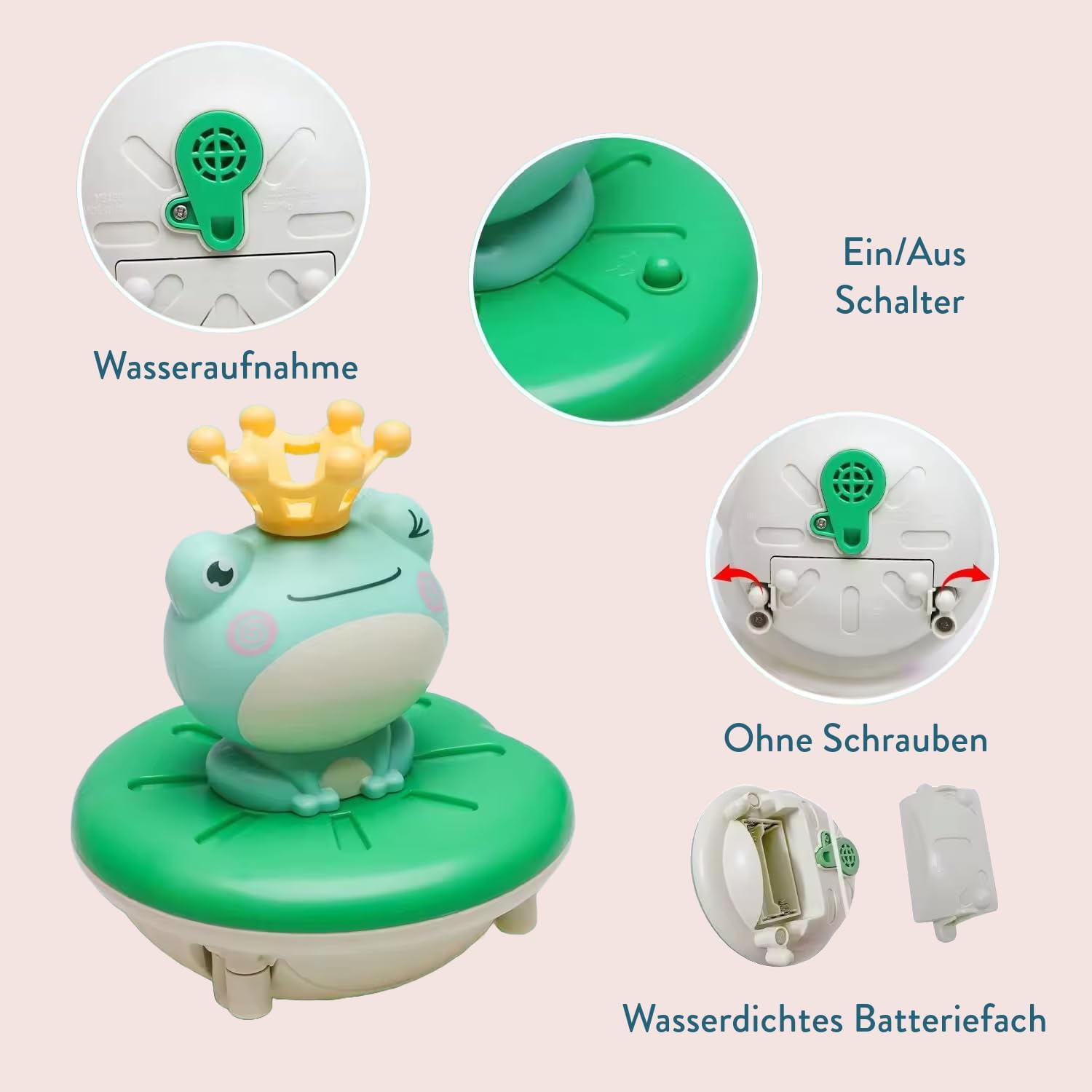 La rana da bagno rende il bagno emozionante e divertente per i bambini piccoli! Con il getto d'acqua a spruzzo e gli attacchi spray rimovibili, ogni vasca da bagno diventa un'avventura. Perfetto per ragazzi e ragazze dai 18 mesi in su: è anche un fantastico gioco acquatico per la piscina! Trasforma ogni momento del bagno in un'avventura vivace con il giocattolo da bagno di SPITZER TOYS ✔︎ GIOIA DI BAGNARE: la rana sulla ninfea crea un getto d'acqua alto fino a 15 cm. Grazie ai vari effetti spray forniti dagli ugelli inclusi, l'attenzione del tuo bambino viene stimolata in modo giocoso e il bagno diventa divertente. ✔︎ MATERIALE SICURO E ADATTO AI BAMBINI: Realizzato in BPA e materiale ABS senza piombo che non presenta angoli o bordi taglienti. Ideale per le mani piccole e sicuro per il tuo bambino. La rana è alimentata da 3 batterie AAA (non incluse). Il vano batteria impermeabile protegge dall'umidità e garantisce un nuoto sicuro. Il giocattolo è conforme agli standard sui giocattoli EN71 e ha superato tutti i test di sicurezza. ✔︎ FACILE DA USARE: Con quattro accessori spray rimovibili, tra cui un uccello rotante, una foglia di trifoglio, un cappello con foglie di loto e una corona con una palla, è possibile creare diversi effetti spray. ✔︎ DIVERTIMENTO CON LA SPRUZZATURA: due velocità di spruzzo, premi l'interruttore una volta per la velocità di spruzzo standard o ancora per un getto d'acqua più forte - per un divertimento ancora più intenso! ✔︎ REGALO PERFETTO: ideale per baby shower, feste di compleanno o Natale. La rana da bagno è il regalo perfetto per i bambini che vogliono divertirsi di più mentre fanno il bagno! ✔︎ NOTA: Si prega di notare che la rana da bagno deve essere utilizzata in una bacinella con acqua sufficiente. Non appena la piccola camera sul fondo si è riempita d'acqua, la rana bagnante inizia a spruzzare acqua.