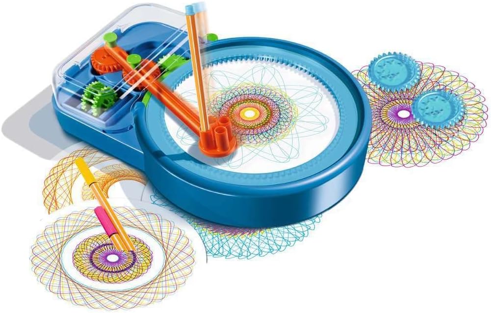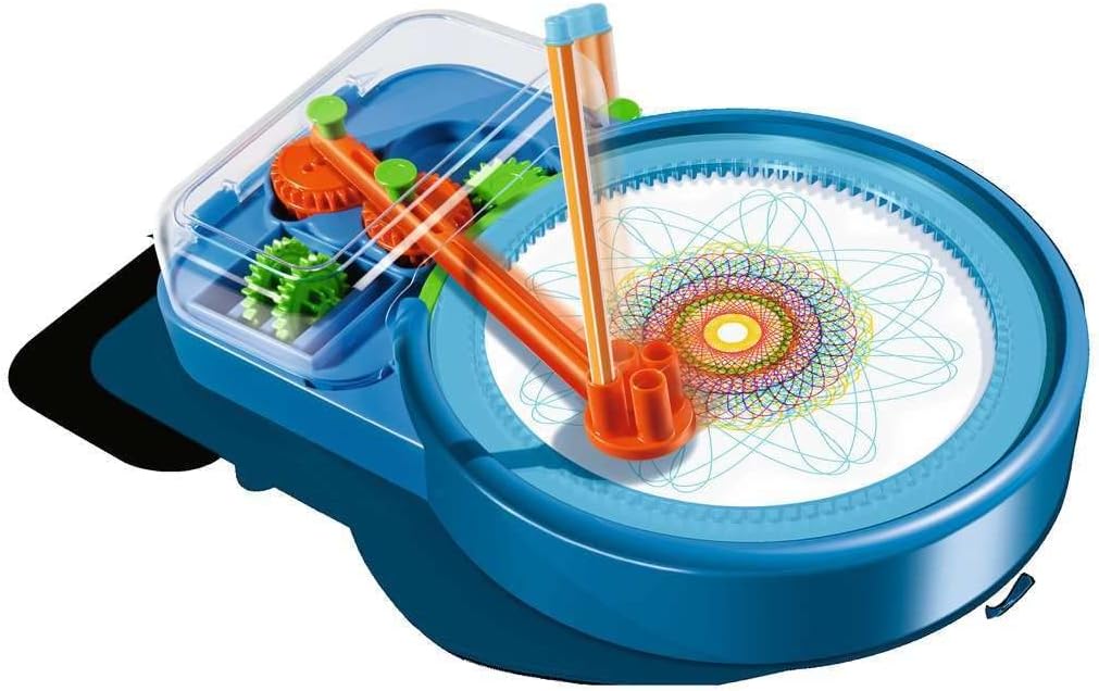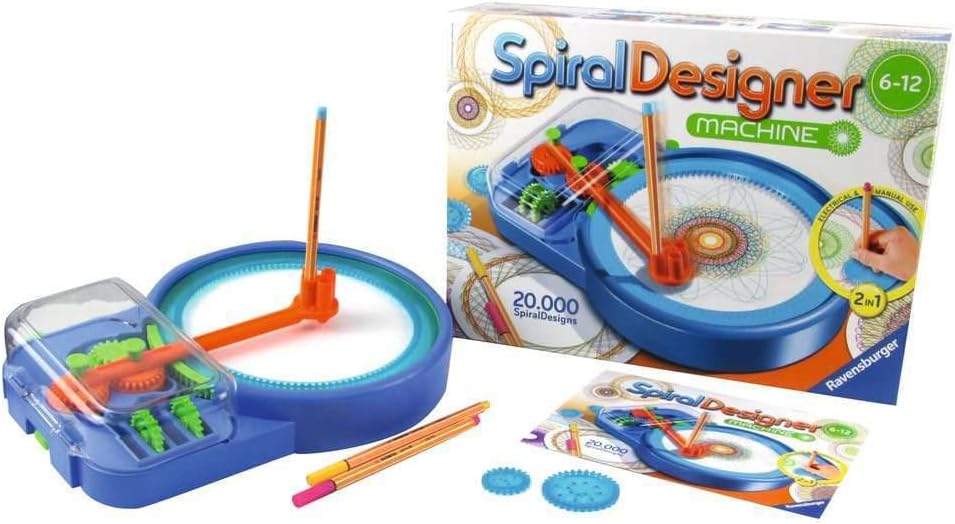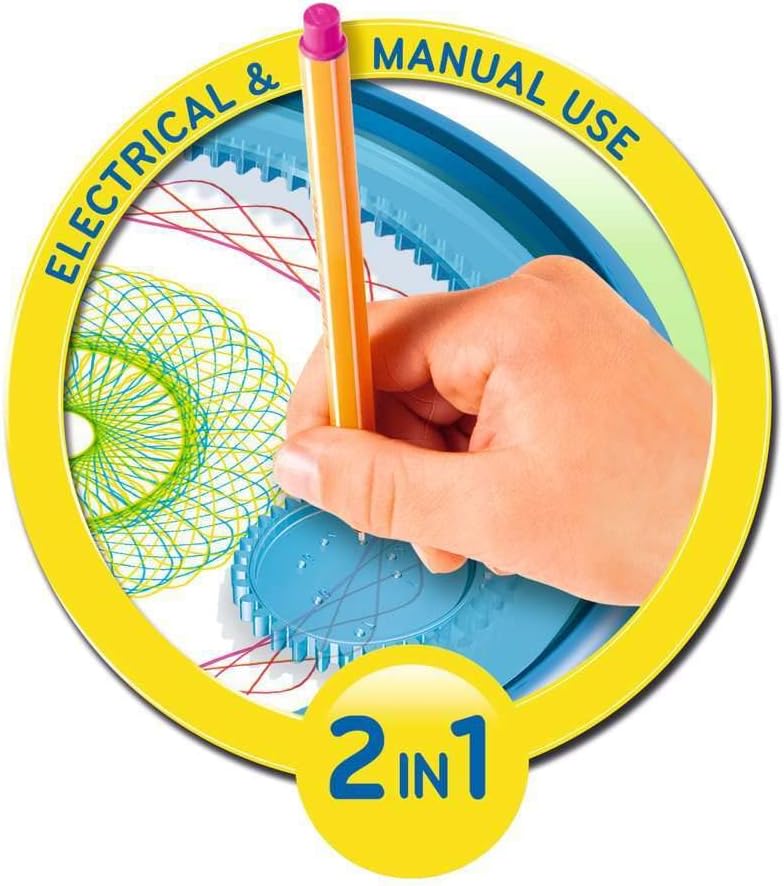 Gioco creativo per disegnare è una macchina "2 in 1" per creare, a mano o in modo automatico, più di 20000 diversi disegni a spirali, ellissi e altre creazioni Funzionamento: inserire un foglio di carta, aggiungere gli ingranaggi colorati e montare il braccio da disegno; premendo il pulsante, la macchina comincia a disegnare in autonomia; le diverse ruote possono essere riposizionate più volte per combinazioni e fantasie sempre nuove; le ruote trasparenti permettono di disegnare e abbellire le proprie creazioni a mano libera Per ottenere uno speciale effetto multicolore, è possibile disegnare contemporaneamente anche con 4 pennarelli; il dispositivo elettrico è facile da usare e si adatta perfettamente a maschi e femmine a partire dai 6 anni La macchina Spiral Designer offre innumerevoli possiblità, esercita la concentrazione, la destrezza manuale ed è ottimalmente compatibile con i prodotti della serie Midi e mini; il divertimento è assicurato