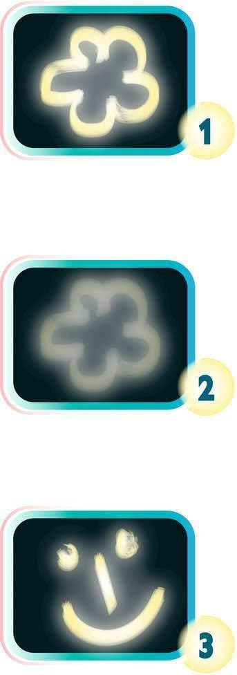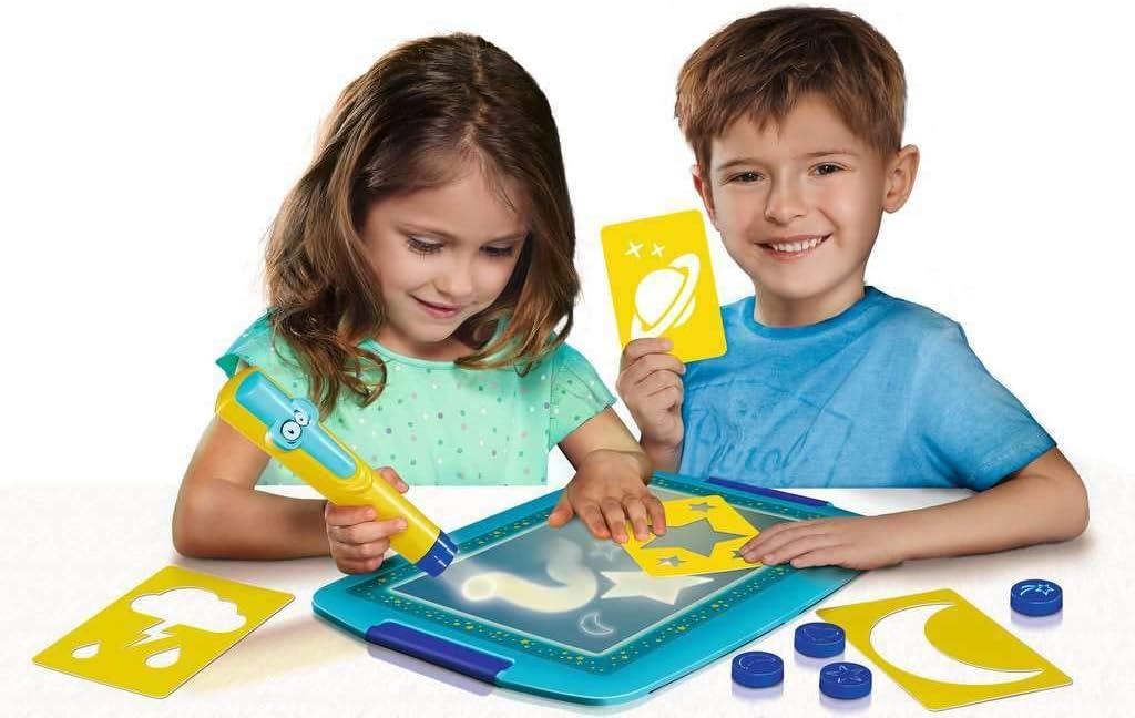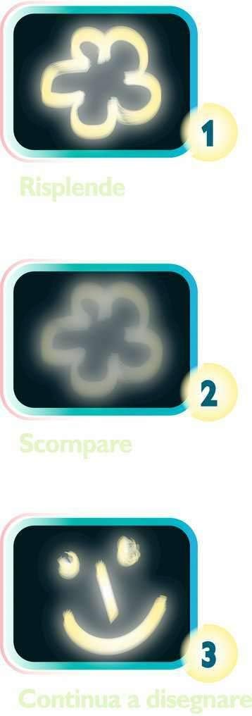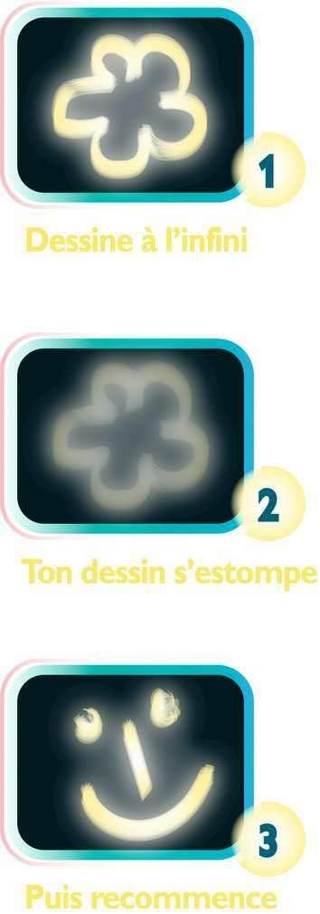 Una tavoletta per disegnare con la luce al buio, disegni che scompaiono come per magia Contenuto: 1 torcia elettrica, 4 timbri sagomati, una tavoletta con doppia superficie fronte/retro riflettente la luce, 4 stencil, istruzioni dettagliate Età minima: 3 anni Dimensioni confezione: 37,3 x 27,3 x 5,5 cm