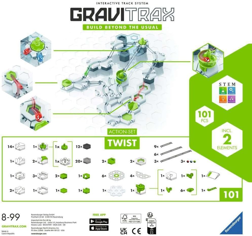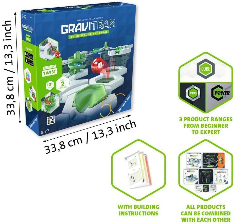 GraviTrax è il sistema di cuscinetti interattivo ed estensibile flessibile per bambini da 8 anni. Con GraviTrax puoi creare interi goffi. Tutti i prodotti GraviTrax delle linee GraviTrax Core, GraviTrax PRO e GraviTrax Power possono essere combinati tra loro. Un regalo di compleanno ideale per ragazzi e ragazze. GraviTrax Core libera lo spirito creativo e offre infinite possibilità oltre l'immaginazione. Gli elementi versatili consentono un'introduzione giocosa all'universo GraviTrax e offrono molto spazio per la creatività e la costruzione libera. Tutti possono iniziare immediatamente e creare tracce straordinarie! Il gioco d'azione GraviTrax Twist 50 Year Edition offre infinite possibilità. Gli elementi versatili offrono molto spazio per la creatività e la costruzione libera. Tutti possono iniziare immediatamente e creare tracce straordinarie! Più di 100 elementi di traccia di marmo sono inclusi in questo set, tra cui piastre inferiori esagonali, curve e binari. Gli elementi di azione a spirale e trampolino lo rendono un vero punto culminante e portano dinamismo e molto slancio alla pista. Il set comprende 6 istruzioni di montaggio per lavori in difficoltà "semplice", "medio" e "difficile". In questo modo è possibile un ingresso giocoso e creativo nell'universo GraviTrax.