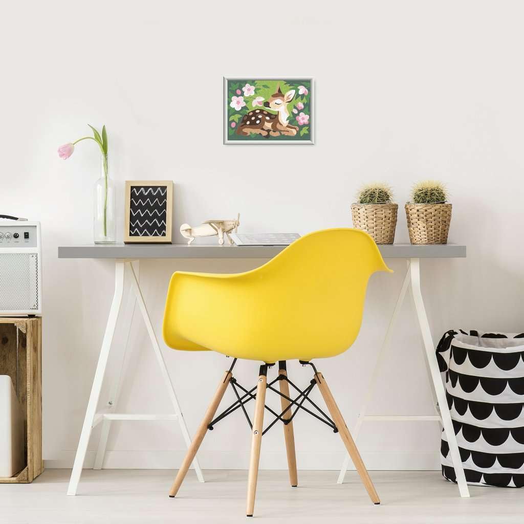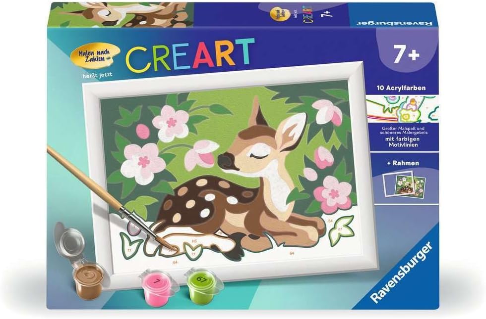 Apri la confezione e inizia a dipingere: il set da pittura è adatto per artisti dai 7 anni in su; dipingere con i numeri ora si chiama CreArt – la confezione può differire dall'immagine Le linee colorate del motivo rendono invisibili i piccoli errori, facilitano la colorazione e garantiscono così un risultato finale più bello Grande divertimento da colorare con i motivi preferiti dei bambini: il simpatico cervo fa brillare gli occhi dei bambini ed è quindi il regalo ideale per artisti grandi e piccini Grazie alla cornice in dotazione, dipingere con i numeri è ideale anche come decorazione nella cameretta dei bambini Il set da pittura contiene 10 colori acrilici adatti ai bambini in vasetti chiudibili e numerati, un tavolo da disegno stabile in formato 13 cm x 18 cm, una cornice abbinata e un pennello. Le vernici acriliche premium si asciugano rapidamente, sono a base d'acqua, inodore e non richiedono detergente per pennelli