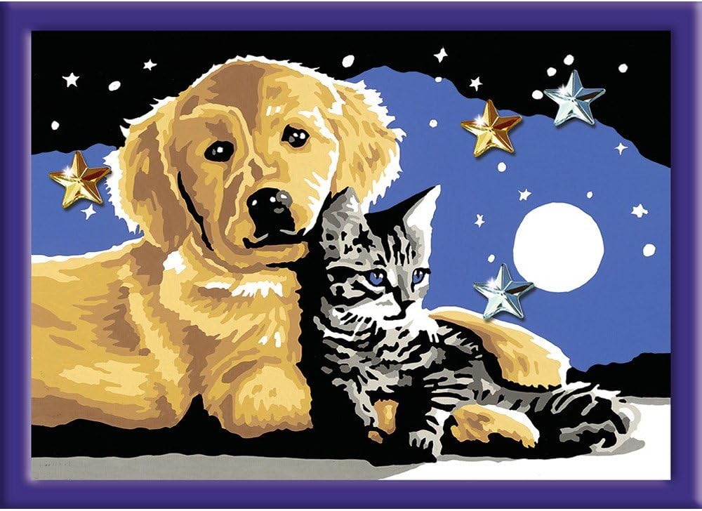 Set fai da te per bambini: con questo set di pittura creativa di Ravensburger Paint by Numbers dai 9 anni in su, i più piccoli possono iniziare a dipingere e creare vere e proprie opere d'arte appena fuori dalla scatola. Attività creativa per i bambini: le linee colorate del motivo rendono invisibili gli errori più piccoli, facilitano la colorazione e garantiscono così un risultato finale più bello. Idea regalo: il tenero cane con il simpatico gatto fa illuminare gli occhi dei bambini ed è quindi un ottimo regalo per ragazze e ragazzi - sia come regalo di Natale, Pasqua o come regalo di compleanno nella cameretta dei bambini Decorazione: Grazie alla cornice inclusa, dipingere con i numeri è anche una meravigliosa decorazione nella cameretta dei bambini, in modo che il bambino possa essere orgoglioso della sua opera d'arte per molto tempo a venire. Il set da pittura contiene 10 colori acrilici in contenitori richiudibili e numerati, un tavolo da pittura di 18 x 13 cm, una cornice e un pennello. Le vernici si asciugano rapidamente, sono a base d'acqua, inodore e non necessitano di detergente per pennelli