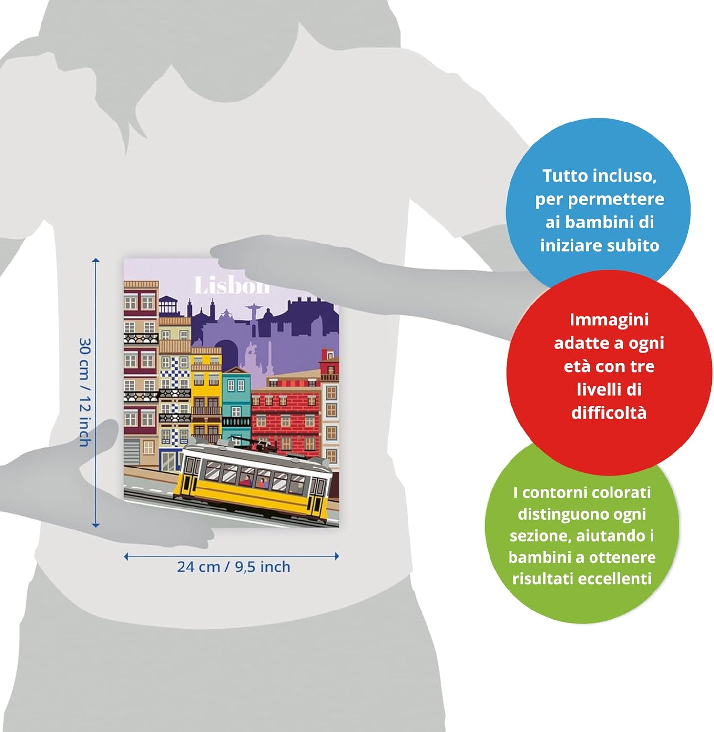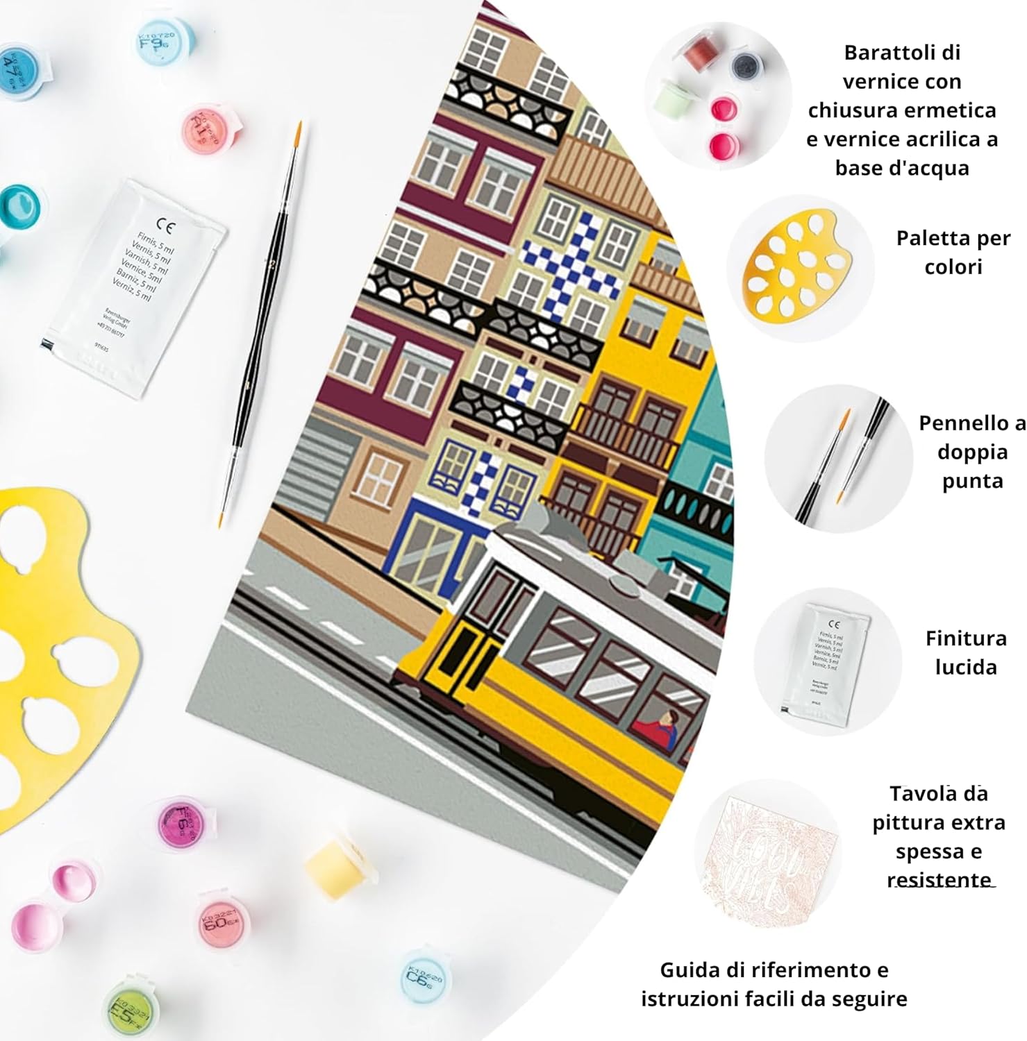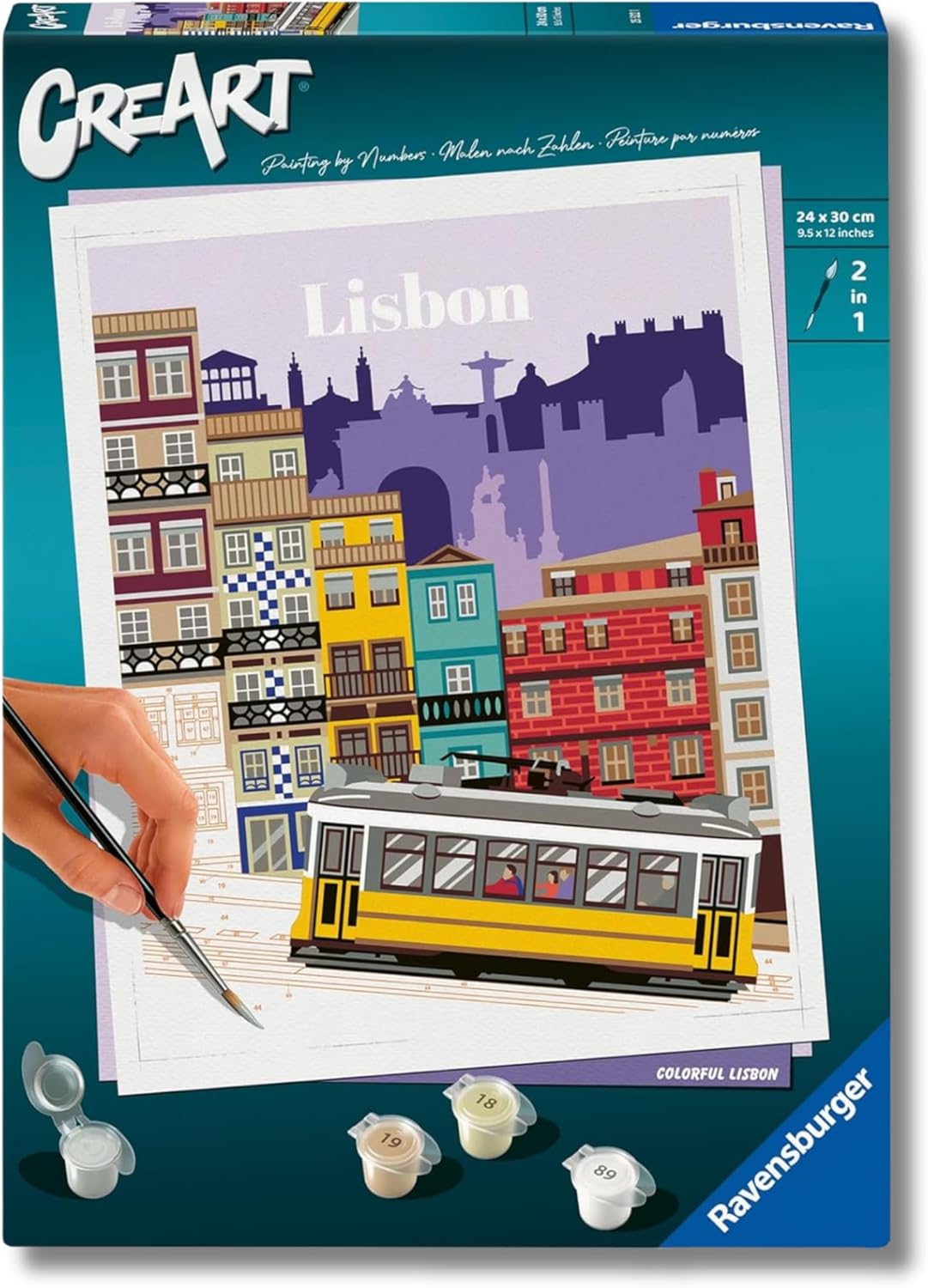 REGALI CREATIVI: il regalo ideale per chi ama dipingere e vuole creare dei piccoli capolavori su tela; basta rilassarsi, prendere in mano il pennello, aprire i barattoli con i colori già pronti all'uso ed iniziare a colorare KIT DI PITTURA A TEMA LISBONA: il kit comprende la tavola prestampata, i colori acrilici a base d’acqua in vaschette richiudibili e un porta tempere; il pennello e un foglio di controllo con campi numerati sono inclusi LIBERA LA FANTASIA: CreArt è il kit di pittura educativo per gli artisti più piccoli e rilassante per i più grandi che aiuta a esercitare la manualità e la motricità, stimola la fantasia e migliora la concentrazione PICCOLI CAPOLAVORI DI QUALITÀ: il kit completo di pittura CreArt garantisce sicurezza e qualità, grazie a una tavola da dipingere resistente e a colori a base d'acqua facilmente lavabili, rendendo l'arte accessibile e divertente; dipingere con i numeri non è mai stato così semplice SCOPRI IL MONDO CREART: puoi scegliere tra tantissimi soggetti e diversi livelli di difficoltà a seconda dei gusti e dell’età; il gioco creativo che permette ai bambini di decorare le loro camerette e agli adulti di rilassarsi colorando