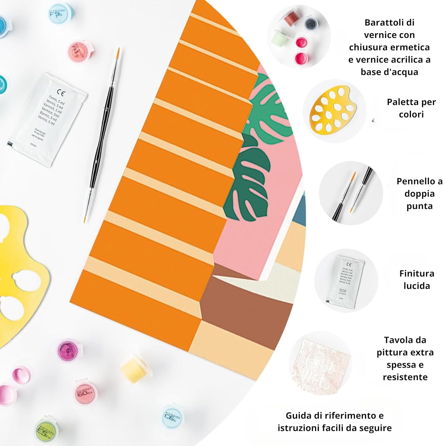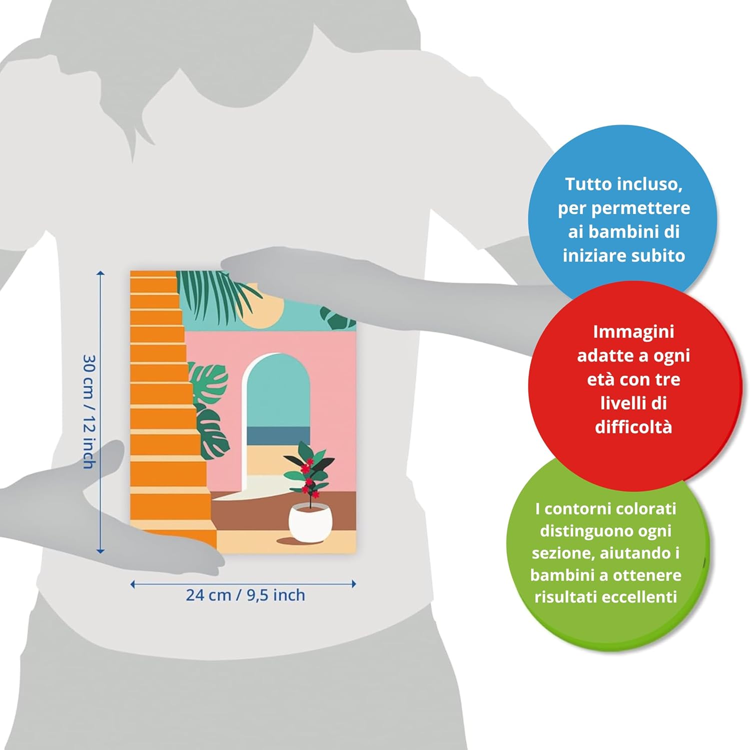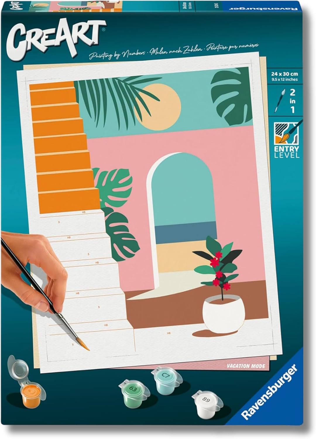REGALI CREATIVI: il regalo ideale per chi ama dipingere e vuole creare dei piccoli capolavori su tela; basta rilassarsi, prendere in mano il pennello, aprire i barattoli con i colori già pronti all'uso ed iniziare a colorare KIT DI PITTURA A TEMA VACANZA: il kit comprende la tavola prestampata, i colori acrilici a base d’acqua in vaschette richiudibili e un porta tempere; il pennello e un foglio di controllo con campi numerati sono inclusi LIBERA LA FANTASIA: CreArt è il kit di pittura educativo per gli artisti più piccoli e rilassante per i più grandi che aiuta a esercitare la manualità e la motricità, stimola la fantasia e migliora la concentrazione PICCOLI CAPOLAVORI DI QUALITÀ: il kit completo di pittura CreArt garantisce sicurezza e qualità, grazie a una tavola da dipingere resistente e a colori a base d'acqua facilmente lavabili, rendendo l'arte accessibile e divertente; dipingere con i numeri non è mai stato così semplice SCOPRI IL MONDO CREART: puoi scegliere tra tantissimi soggetti e diversi livelli di difficoltà a seconda dei gusti e dell’età; il gioco creativo che permette ai bambini di decorare le loro camerette e agli adulti di rilassarsi colorando