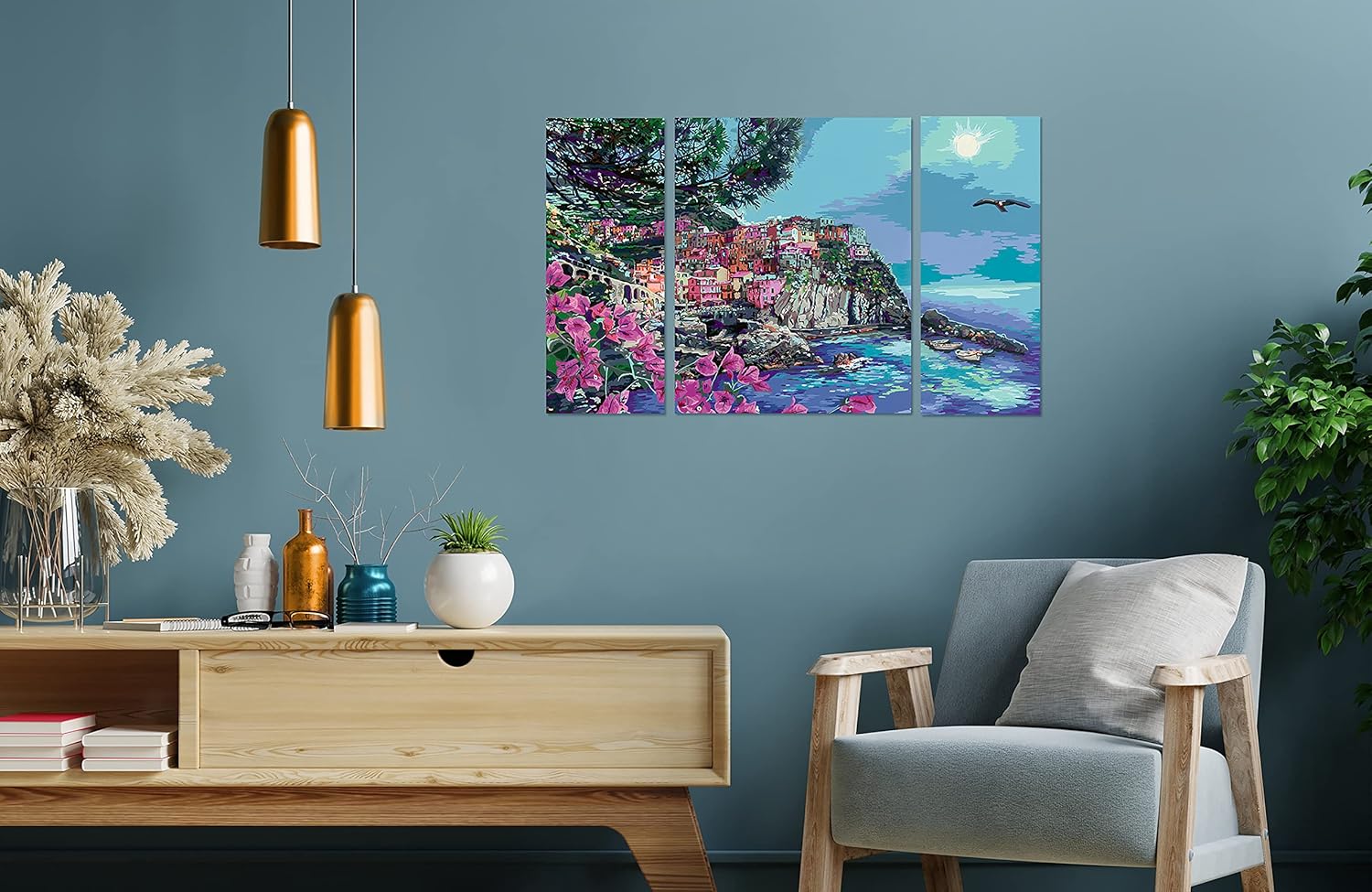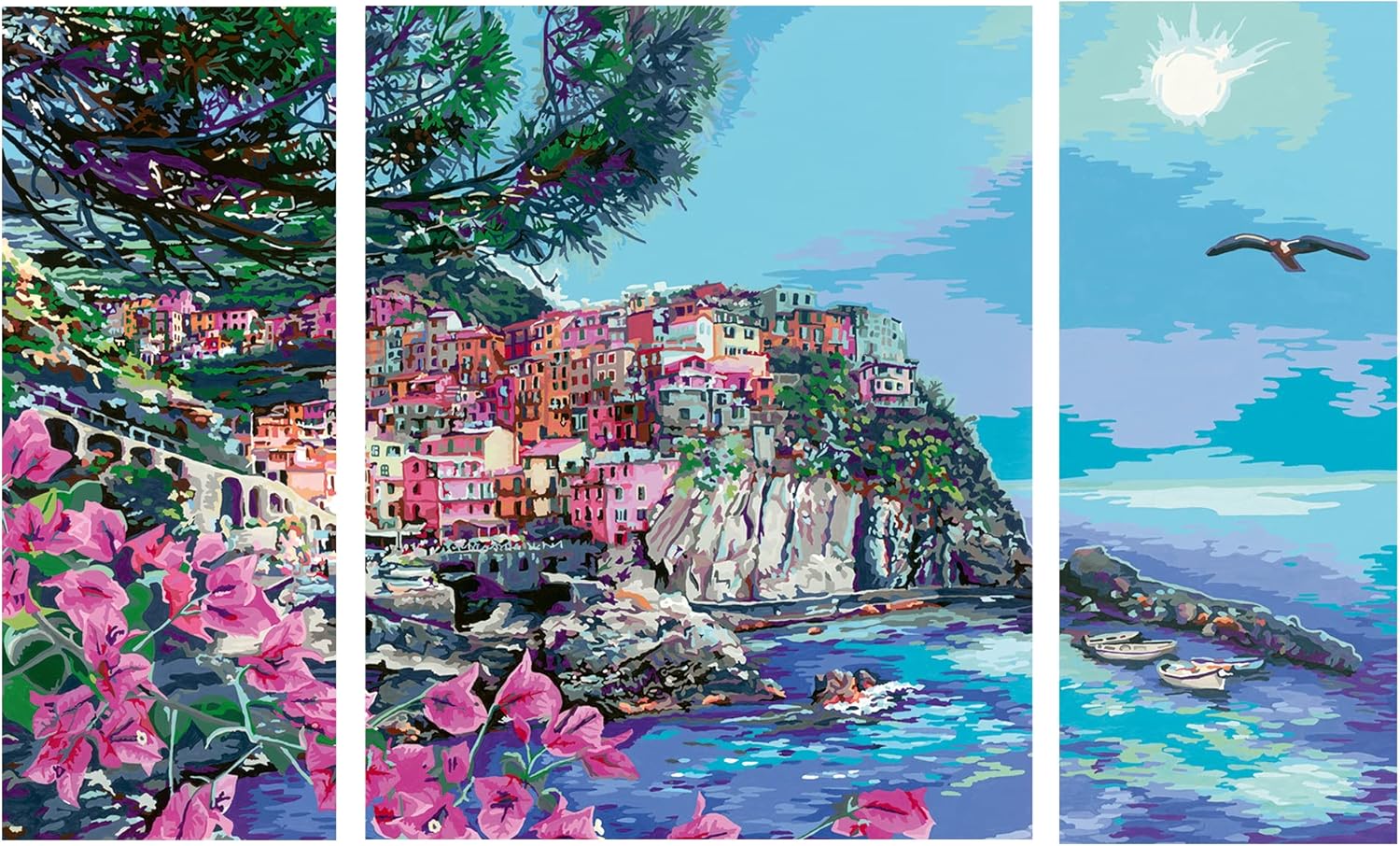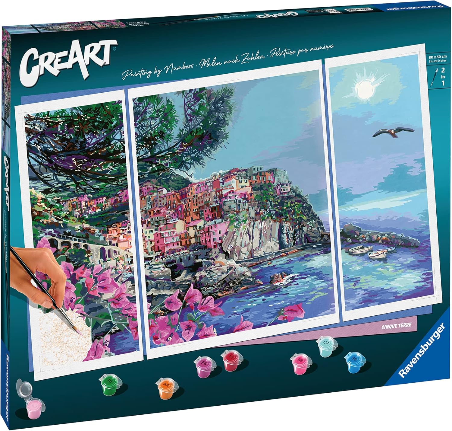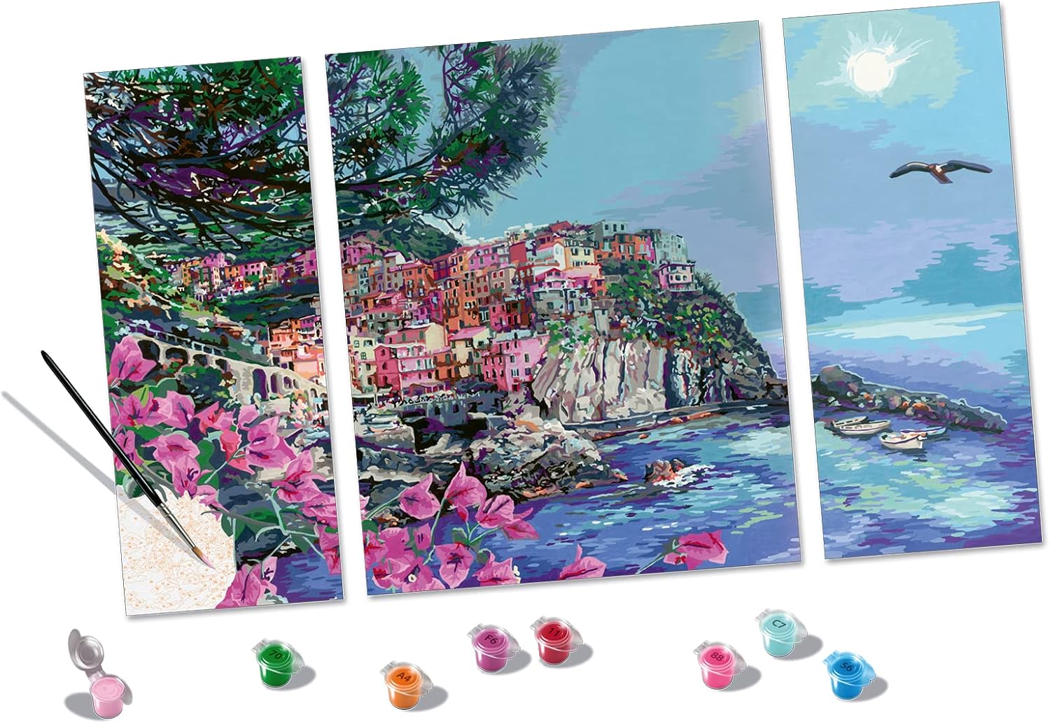 Ravensburger - CreArt Trittico, Le Cinque Terre, Italia, Kit per Dipingere con i Numeri, Contiene 3 Tavole Prestampate, Pennello, Colori e Accessori, Gioco Creativo e Relax per Adulti 14+ Anni