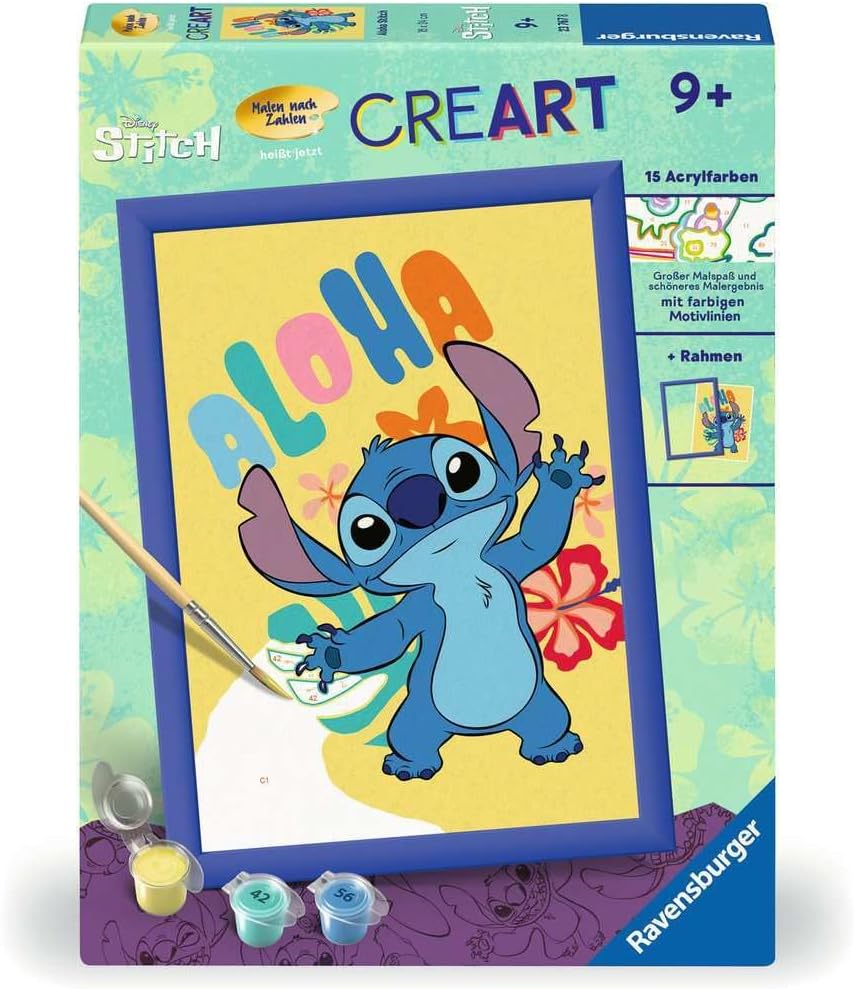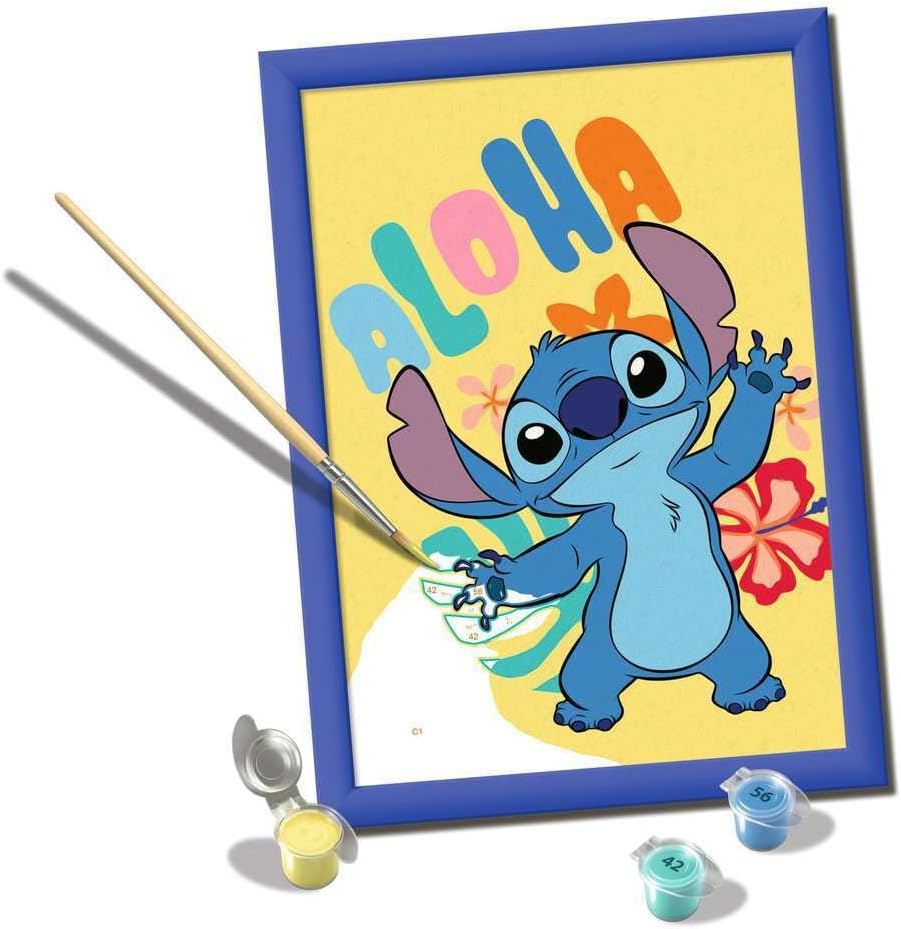 Disimballare e dipingere: il set da pittura è adatto per artisti a partire dai 9 anni in su Le linee colorate rendono invisibili piccoli errori, facilitano la colorazione e garantiscono così un risultato finale più bello Grande divertimento con i motivi preferiti dei bambini: Disney Stitch illumina gli occhi dei bambini ed è quindi il regalo ideale per piccoli e grandi artisti Grazie alla cornice in dotazione, la pittura con i numeri è perfetta anche come decorazione nella cameretta dei bambini Il set da pittura contiene 15 colori acrilici adatti ai bambini in ciotole richiudibili e numerate, una robusta lavagna da disegno in formato 18,00 cm x 24,00 cm, una cornice abbinata e un pennello. I colori acrilici di alta qualità si asciugano rapidamente, sono a base d'acqua, inodore e non richiedono un detergente per pennelli