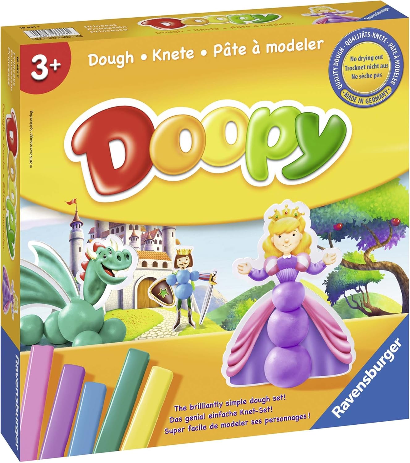 Doopy vereint Knete mit Spielfiguren. Die Knete ist nicht so weich wie Kleinkindknete und nicht so hart wie Schulknete, daher ideal, um etwas haltbarere Figuren zu formen, ohne dabei am benötigten Kraftaufwand zu verzweifeln. Zudem trocknet sie nicht schnell ein, die Farben sind kräftig und sehr schön. Sie ist laut Hersteller gesundheitlich unbedenklich und unter Aufsicht auch für jüngere Kinder geeignet, sonst erst ab 3 (verschluckbare Kleinteile, sprich: Knete). Das Besondere am Paket ist, dass Pappfigurenteile mitgeliefert werden. Diese werden mithilfe von Knetkugeln zu Figuren ergänzt, die stehfähig sind - nur der Prinz hat wohl etwas zu tief ins Glas geguckt, er ist ziemlich wackelig. Kein Wunder, schließlich trank man im Mittelalter durchschnittlich 1,3 Liter Wein am Tag (plus Bier). Aber wenn man die Beine in einem bestimmten Winkel feststeckt, hält auch er relativ gut das Gleichgewicht. Die Pappteile sind, wie bei Ravensburger gewohnt, in Stanztafeln, aus denen sie leicht rausgedrückt werden können. Die Qualität ist gut, feste Pappe, schöne Bilder, nichts wirkt billig. Zusätzlich gibt es 3 beidseitig bedruckte Tafeln, auf denen genau abgebildet ist, was man für den Bau der Figuren benötigt und wie die Knet-Stücke (mit dem beiliegenden Plastikmesser) abzuschneiden sind, damit die Kugeln die richtige Größe haben. Dabei sind die Knetstücke blöderweise ein kleines Stück zu lang. "Super, da hat man noch Knete übrig", könnte man denken. Aber kleine Kinder kapieren nicht, dass sie da noch mal etwas abschneiden müssen, weil es nicht eingezeichnet ist. Und das, was übrig ist, ist auch nicht wirklich verwendbar, da es so wenig ist (okay, bei uns bekam der Drache dann ein rosa Bein, die Kutsche ein buntes Rad usw. Kreativität geht immer). Für jede der 6 Figuren sind ein paar Knetkugeln zu formen. Das ist für die Kleinen gar nicht so leicht. Leider geht es nicht wie gedacht direkt auf der Pappe, weil Knete kleben bleibt. Am besten funktioniert es mit den Handflächen, das benötigt aber einiges an Koordination und bei den großen Kugeln sind die Kleinen überfordert. Daher rollen sie diese am besten auf einem Tisch mit Plastiktischdecke. Dann werden die Figuren zusammengesteckt und schon kann das Spiel losgehen. Den Ritter/Prinz musste ich dabei immer wieder zusammenstecken, das Schloss als Kulisse war uninteressant, der Drache verlor natürlich auch manchmal seinen Schwanz, er kann aber mit einem Zahnstocher gesichert werden. Das Set verbindet somit Kneten mit Rollenspiel. Man kann die Figuren natürlich auch einfach nur hinstellen. Schade finde ich, dass alles Kneten sich auf Kugeln beschränkt. Für die Dreijährigen ist das zwar motorisch schon eine ganz schöne Leistung, aber prinzipiell könnte man z. B. den Drachen doch auch ganz anders formen. Klar geht das auch ohne Anleitung, aber eine Rolle als Schwanz wäre schon drin gewesen oder Räder für die Kutsche statt Kugeln. Insgesamt ist das Set schön für Kinder, die im Anschluss mit den Figuren spielen. Wer hauptsächlich kneten möchte, dem würde ich es aufgrund des Preises im Vergleich zu reiner Knete nicht empfehlen. Die Fotos zeigen zum einen die Teile für den Bau der Prinzessin auf der Bauplatte, zum anderen alle fertiggestellten Figuren inkl. kreativen Abänderungen wie rosa Fuß des Drachen (der ist aber hinter den anderen Figuren versteckt).