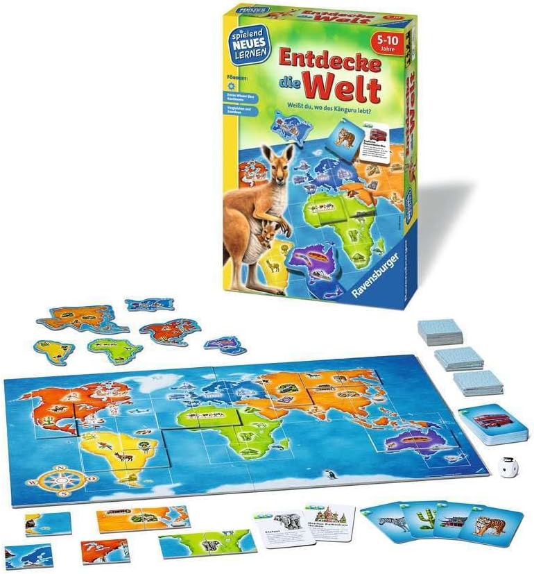 Divertimento geografico per bambini: dove vivono zebra ed elefante? Chi conosce la Statua della Libertà e chissà dove sono le piramidi? Molte immagini invitano i bambini a scoprire la terra e ad assegnare gli animali ai continenti I giocatori confrontano le carte con il piano di gioco e trovano i luoghi dei motivi raffigurati. Successivamente, i bambini completano queste immagini di animali o attrazioni, guadagnando così il maggior numero di punti Questo bellissimo gioco da tavolo promuove: prima conoscenza dei continenti, confrontando e assegnando Il gioco educativo è adatto per 2-4 giocatori e porta tensione in ogni cameretta. Il regalo ideale per compleanno o Natale. Un'occupazione utile per i più piccoli, per imparare anche a casa e divertirsi allo stesso tempo Giocare nuovo apprendimento supporta lo sviluppo dei bambini. Acquisiscono conoscenze giocose e possono sviluppare potenziali personali. Inoltre, diversi livelli di difficoltà e meccanismi di autocontrollo consentono l'apprendimento individuale e indipendente