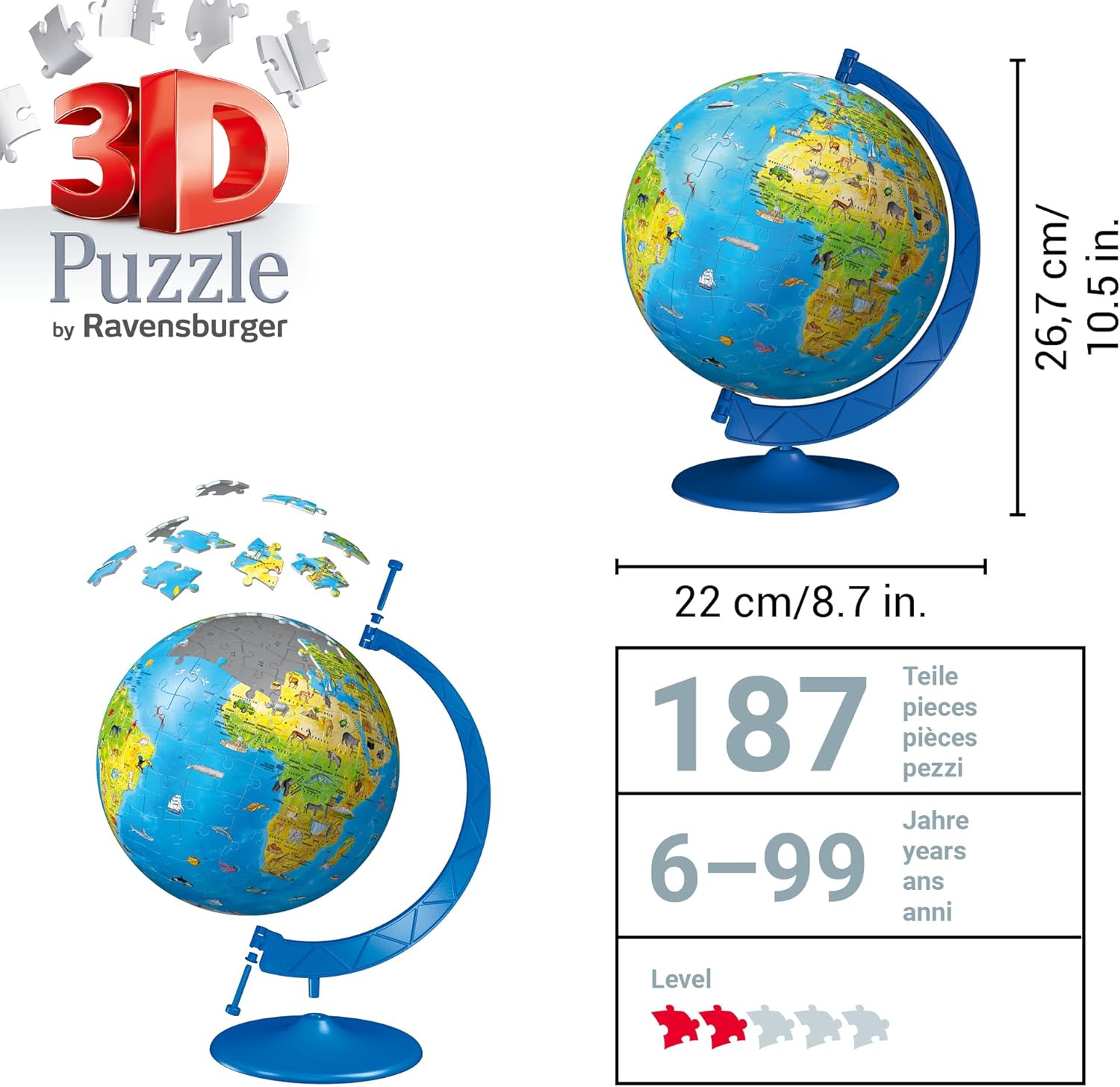 Hai sempre desiderato conquistare il mondo intero? E scoprire dove vivono esattamente tigri e leoni? O scoprire i nomi degli oceani più grandi del mondo? Puoi fare tutto questo e molto altro ancora una volta che avrai messo insieme questo globo. 180 pezzi curvi del puzzle in plastica formano un mappamondo stabile per bambini. I 180 pezzi del puzzle dalla forma individuale si incastrano perfettamente grazie alla tecnologia EasyClick e formano un globo stabile senza incollarli. Ciò significa: un divertimento puzzle unico è preprogrammato per gli amanti dei puzzle di età compresa tra 6 e 99 anni, che diventa un piacere spensierato con l'aiuto di istruzioni illustrate. Include base girevole e poster fronte-retro