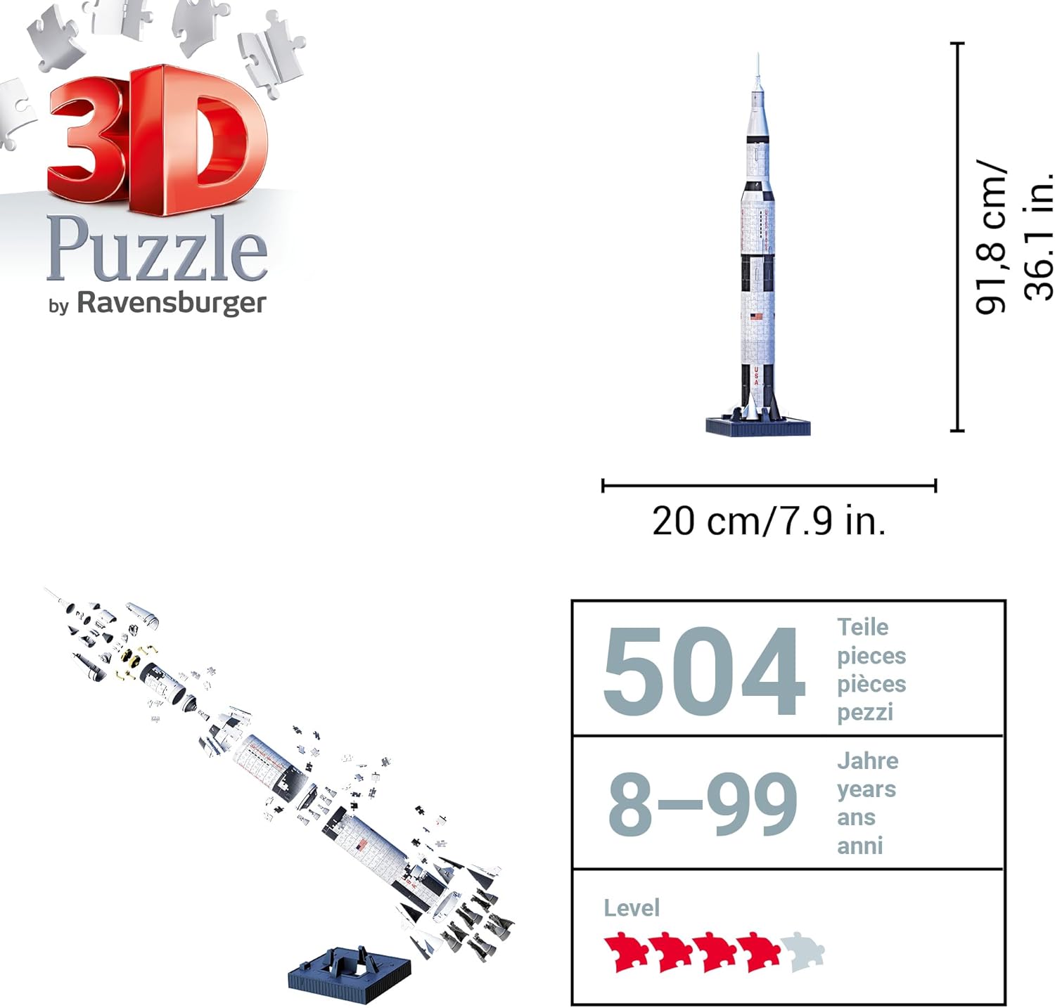 Puzzle nella terza dimensione! L'idea regalo ideale per tutti i grandi e piccoli appassionati di spazio dagli 8 anni in su: l'Apollo Saturn V in scala 1:120 come vera attrazione per ogni stanza e con valore aggiunto educativo. Il leggendario razzo Saturn V è stato creato pezzo per pezzo da 440 pezzi di puzzle in plastica di alta qualità e dalla forma tridimensionale come un impressionante puzzle 3D - grazie alla tecnologia EasyClick, stabile senza colla. Attività ideale con successo garantito - incluso materiale informativo dettagliato sulle missioni Apollo e sullo sbarco sulla Luna e sullo spettacolare razzo Saturn V. Promuove il pensiero spaziale e la motricità fine Con stadi di razzi staccabili, modulo lunare rimovibile, modulo di comando e servizio, 3 astronauti e piattaforma di lancio Contenuto: 440 pezzi di puzzle a forma tridimensionale, in totale 504 pezzi, altezza ca. 92 cm, livello di difficoltà 4/5, da 8 anni in su