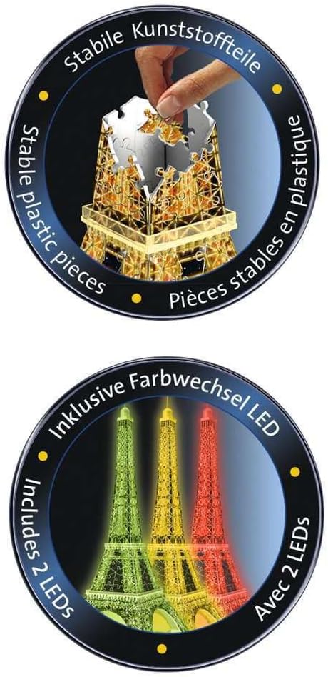 UN MONUMENTO PUZZLE 3D IPER REALISTICO composto da 216 pezzi in plastica numerati e accessori unici per completare la costruzione. Si monta facilmente seguendo l'ordine dei codici per un risultato sensazionale. Contenuto: 1 puzzle 3D da 216 pezzi, i suoi accessori finali, modulo luminoso con LED e istruzioni dettagliate ILLUMINA LA TORRE EIFFEL Semplice da montare, questa superba riproduzione 3D dell'emblematica Torre Eiffel delizierà grandi e piccini, a partire dai 10 anni! Grazie alla sua base luminosa, questo puzzle tridimensionale si illumina e può trasformarsi in una vera lampada! Si accende e si spegne con un semplice interruttore. Funziona con 3 batterie LR03 non incluse. ALTA QUALITÀ: La tecnologia Easyclick e la qualità del taglio dei pezzi permettono una perfetta integrazione e garantiscono così la solidità del puzzle 3D, il tutto SENZA la minima COLLA! Il montaggio è semplice grazie alle istruzioni illustrate e ai pezzi del puzzle numerati. Larghezza: 18 cm, Altezza: 47 cm UN REGALO IDEALE per tutti gli appassionati di puzzle! Questo puzzle 3D può essere assemblato da soli o insieme ad altri per condividere un momento di convivialità in famiglia o con gli amici. Un regalo perfetto da collezionare o regalare per qualsiasi altra occasione: Natale, un compleanno o semplicemente per divertimento. L'oggetto ideale e originale per decorare i tuoi interni! AMBIENTE: Prodotto in Europa, questo puzzle è realizzato con materiali provenienti da foreste certificate FSC ben gestite, materiali riciclati e materiali provenienti da altre fonti controllate (FSC-C111262; FSC: organizzazione senza scopo di lucro che protegge, controlla e incoraggia la gestione sostenibile delle foreste).