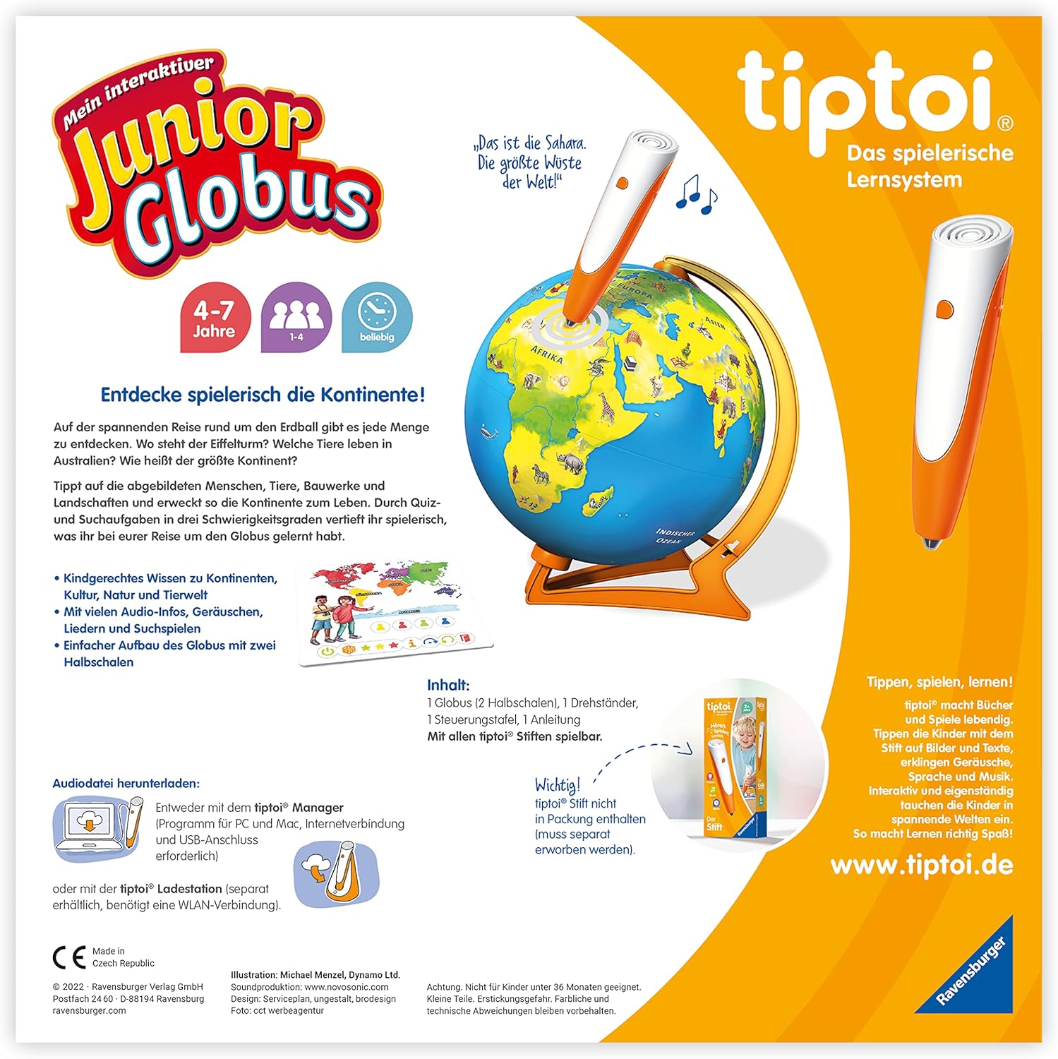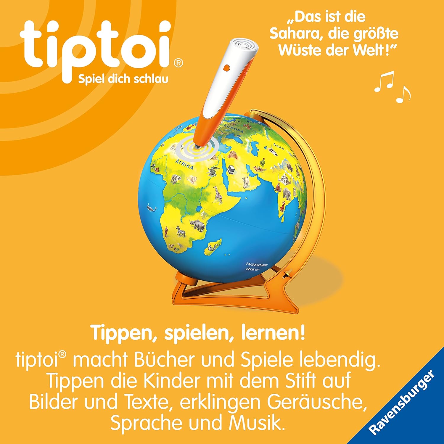 Dov'è la Torre Eiffel? Quali animali vivono in Australia? Qual è il nome del continente più grande? Ci sono molte cose interessanti da scoprire in un emozionante viaggio intorno al mondo. Il sistema di apprendimento audio-digitale tiptoi fornisce conoscenze a misura di bambino su tutti i continenti e sui paesaggi, le attrazioni, le culture e gli animali rappresentati. Il mappamondo interattivo per bambini dà vita al tema della geografia con suoni e canzoni adatti. Un fantastico regalo per i bambini che vogliono esplorare il mondo. Quiz e compiti di ricerca in tre livelli di difficoltà aiutano ad approfondire ciò che hanno imparato in modo giocoso. Il mappamondo junior è composto da due semigusci (diametro ca. 23 cm), sono inclusi anche un supporto girevole e un pannello di controllo. penna tiptoi non inclusa. Deve essere acquistato separatamente