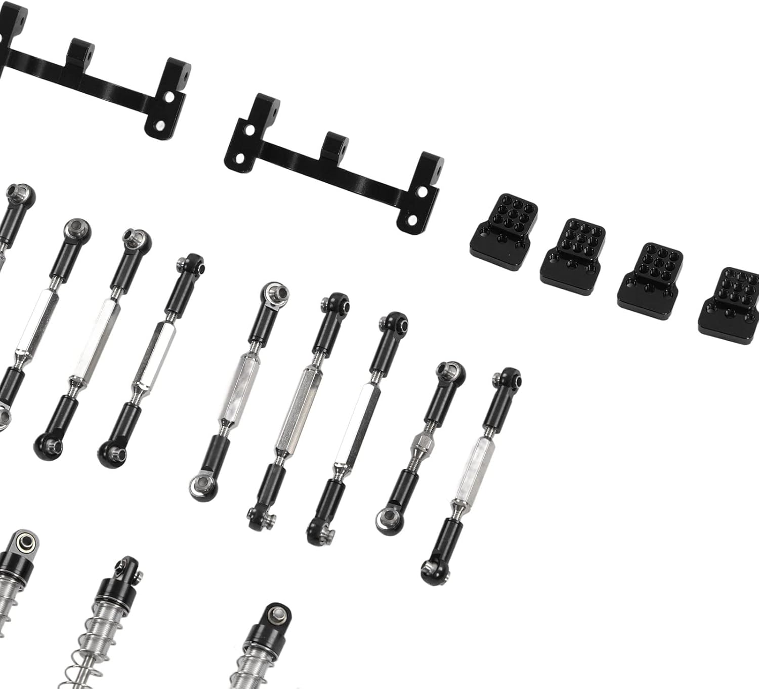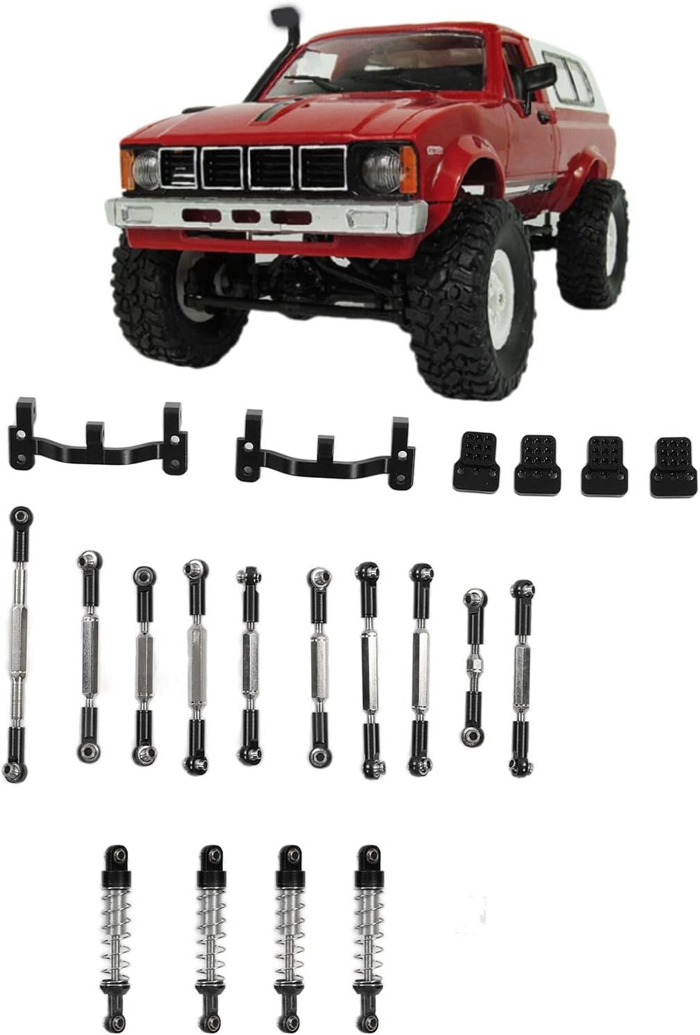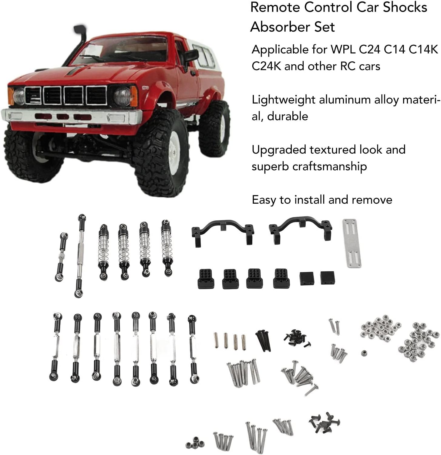 Resistenza della lega: l'aggiornamento dell'auto RC è realizzato in una lega di alluminio di eccellente qualità, fornendo una miscela di struttura leggera e hatacità duratura. Questa scelta di materiale non solo garantisce longevità ma migliora anche le prestazioni generali del tuo veicolo Aggiornamento estetico: vantando un design innovativo e una meticolosa lavorazione artigianale, il kit in metallo migliora l'aspetto della tua auto RC. Il suo aspetto migliorato e strutturato lo fa risaltare, unendo prestazioni superiori con un'estetica accattivante Adatto al fai da te: l'installazione e la rimozione sono semplici e si rivolgono agli appassionati del fai da te che apprezzano la facilità e la praticità. La natura intuitiva di questo kit metallico in lega di alluminio incoraggia modifiche personalizzate e tocchi personali Compatibilità artigianale: progettato con precisione, questo kit di aggiornamento in metallo si adatta perfettamente ai modelli C24, C14, C14K e C24K. È la scelta ideale per coloro che desiderano migliorare contemporaneamente le prestazioni e l'estetica del proprio veicolo telecomandato Kit completo: il pacchetto viene fornito completo di tirante, sede del tirante, ammortizzatore, staffa dell'ammortizzatore, piastra della staffa, staffa a parete, cilindro della vite, dado e vite. Questa vasta collezione ti garantisce di avere tutto ciò di cui hai bisogno per un aggiornamento completo, migliorando sia la funzionalità che l'aspetto