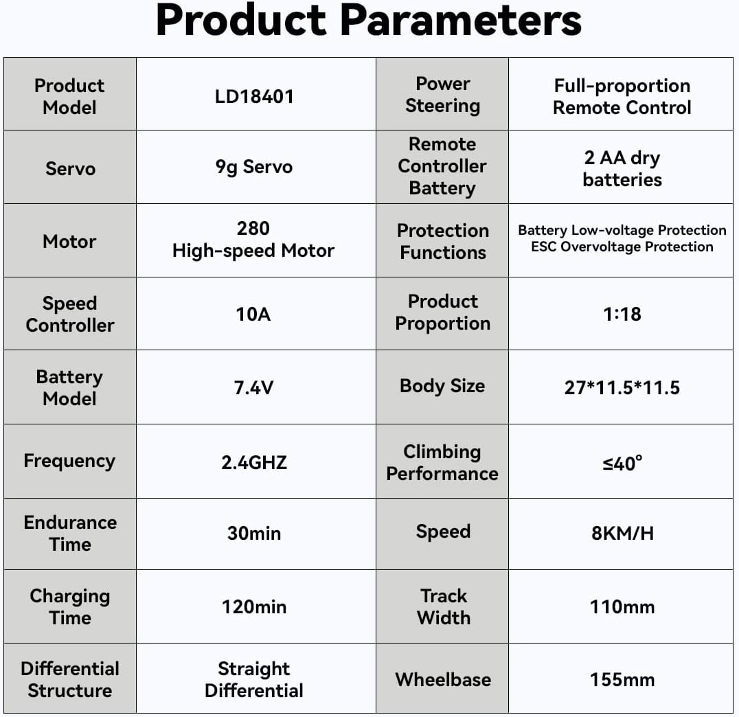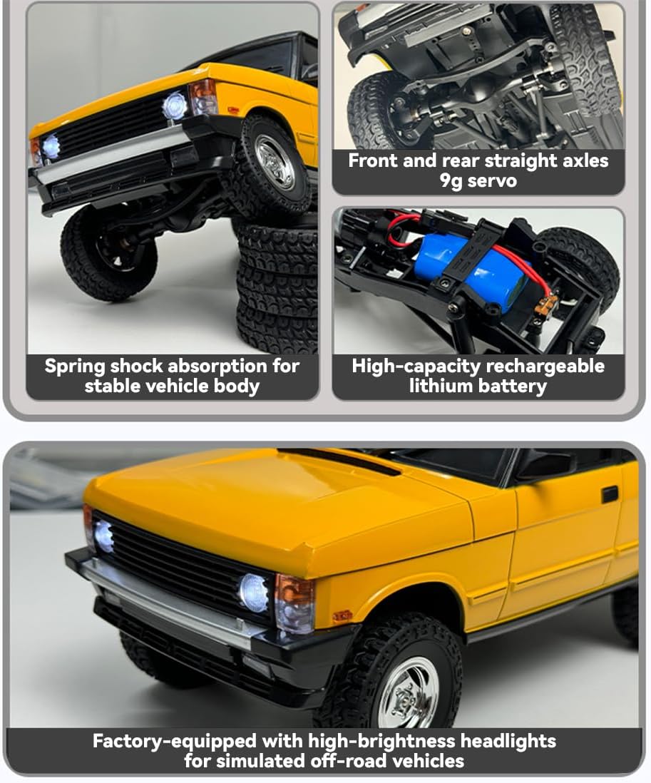 Modello RC Urban SUV altamente dettagliato: questo modello RC progettato con precisione replica l'aspetto iconico di un classico SUV urbano con dettagli notevoli. Ideale per collezionisti e appassionati di modellini in scala che cercano autenticità e prestazioni Telaio resistente con design realistico: costruito su un robusto telaio di livello ingegneristico, il modello presenta una scocca altamente realistica e pneumatici in gomma morbida che offrono una presa superiore. Progettato per rispecchiare la struttura e la forma dei veri veicoli fuoristrada Eccezionale capacità fuoristrada: progettata per terreni accidentati, offre una generosa altezza da terra, una posizione aggressiva e un ampio profilo della carrozzeria. Linee audaci e proporzioni realistiche offrono una forte presenza e prestazioni fuoristrada Sistema 4WD con ingranaggi in metallo e sospensione a 8 maglie: Dotato di solidi assi anteriori e posteriori, ingranaggi interni in metallo e sistema di sospensione a 8 maglie con ammortizzatori a molla. Gli pneumatici in gomma morbida offrono un eccellente assorbimento degli urti e una sensazione di vera strada per un controllo di lunga durata Elettronica affidabile e protezioni di sicurezza: dispone di un sistema remoto a 2,4 GHz, servo sterzo 7,9 g ad alta precisione, cambio 280 realistico e acceleratore e sterzo proporzionali. Goditi fino a 30 minuti di guida con protezioni integrate contro lo stallo del motore, il sovraccarico, la scarica eccessiva e la bassa tensione. Portata operativa fino a 20 metri con accoppiamento automatico