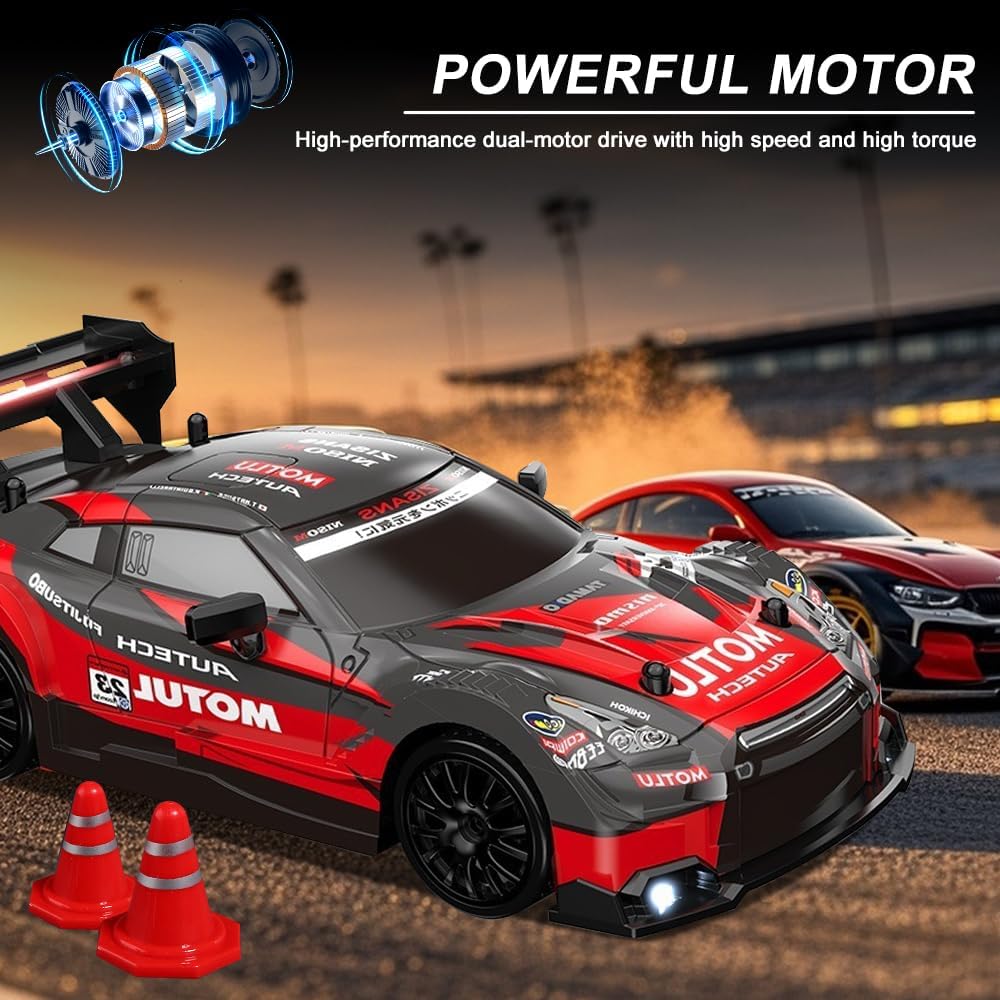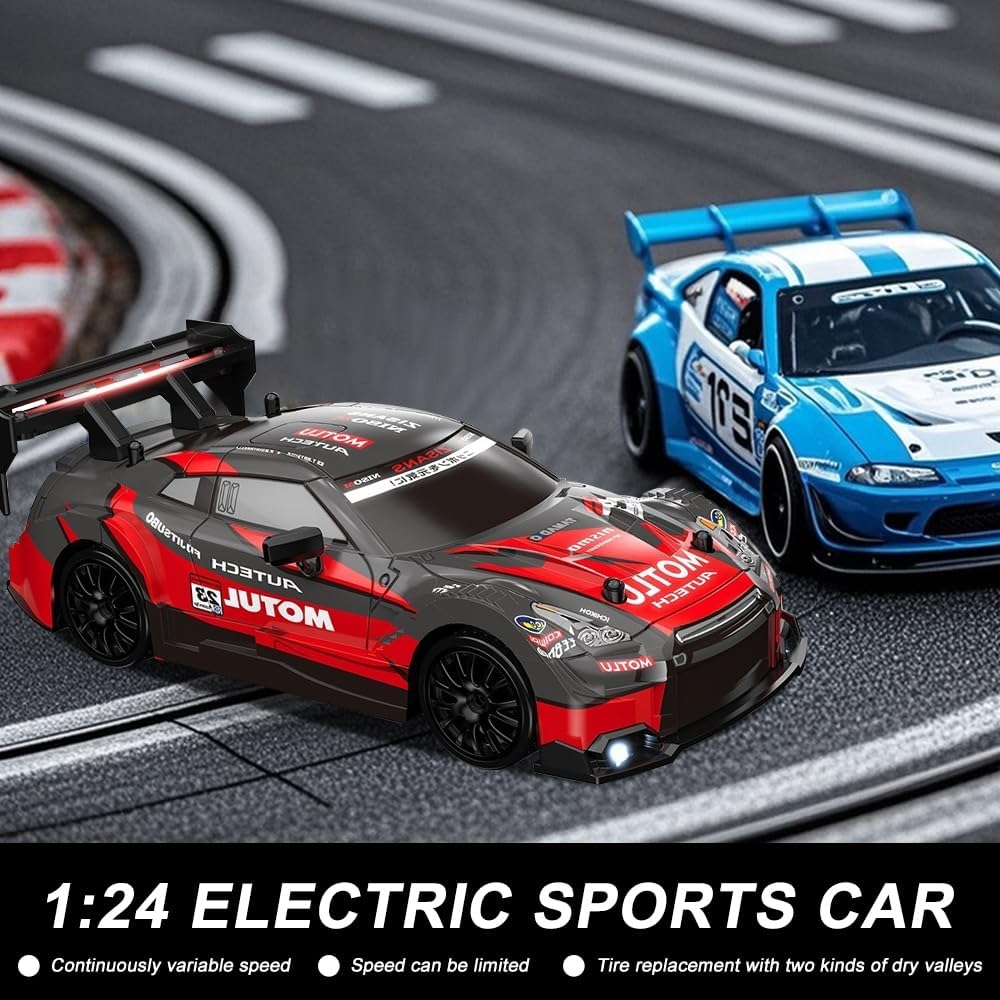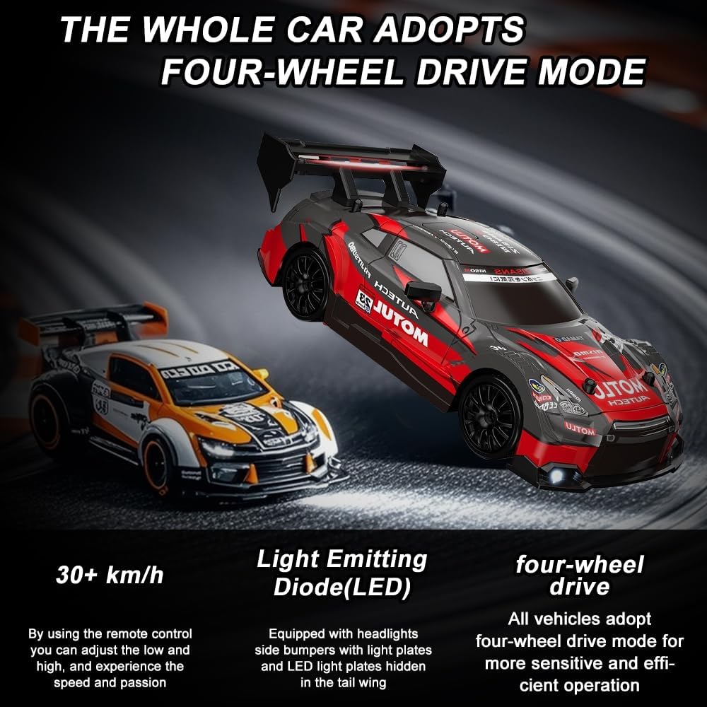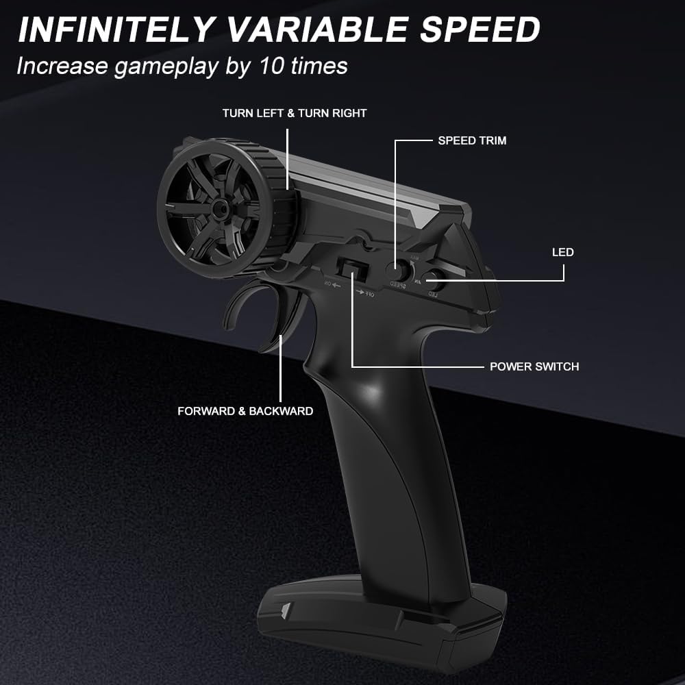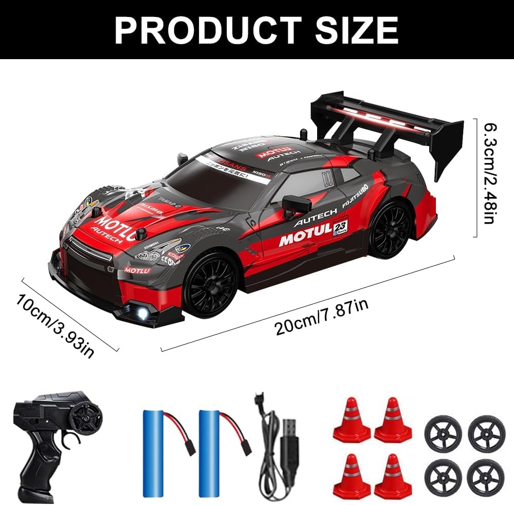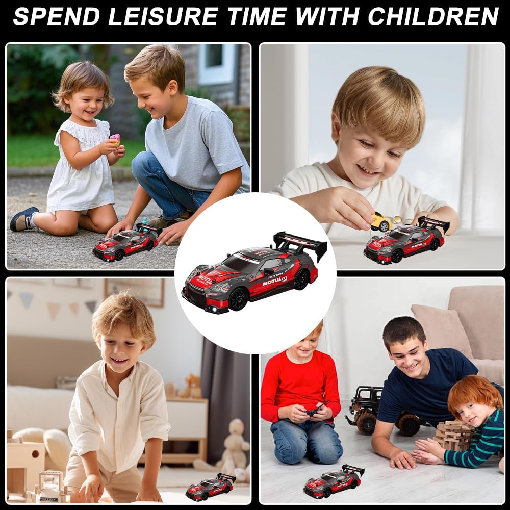 【Auto da Drift ad Alta Velocità Telecomandata】Questa 1:24 mini macchina telecomandata drift è piccola, leggera e in scala 1:24, ha un aspetto accattivante e realistico e può raggiungere una velocità di 30 km/h. Questa RC drift car telecomandata è dotata di un sistema di trazione integrale, distribuisce le forze in modo sensato durante il processo di stampaggio e genera una coppia maggiore. Che si acceleri in rettilineo o in curva, è facile da controllare e offre ai bambini un divertimento assicurato 【Controllo di Precisione a 2,4 GHz】L'RC drift car è dotata di un telecomando con impugnatura a pistola che utilizza una tecnologia integrata a 2,4 GHz stabile e senza interferenze, supportando più auto RC per drifting e corse simultanee senza interferenze di segnale. Il telecomando portatile a forma di pistola è semplice e facile da usare, consentendo anche ai principianti di padroneggiare rapidamente e godersi la gara 【Materiali di Alta Qualità】L'1:24 mini macchina telecomandata drift è realizzata in PVC ad alta resistenza ed è resistente alle cadute e agli urti. RC drift car inoltre dotata di una scocca anticollisione rimovibile e di un telaio anticaduta per garantire che il veicolo rimanga intatto anche durante la guida intensa. Gli pneumatici sono realizzati in gomma di alta qualità, elastici e resistenti. Prevengono lo scivolamento e non presentano spigoli vivi. Garantiscono una guida fluida anche nelle curve veloci 【Luci Fantastiche】L'auto giocattolo è dotata di luci anteriori ad alta luminosità, che consentono di giocare al buio, rendendo la guida notturna più attraente e aggiungendo un ulteriore livello di realismo alle avventure di esplorazione e corsa del bambino. L'RC drift car con luci a LED è dotata di una batteria al litio da 3,7 V 500 mAh e di un cavo di ricarica USB, che offre 30 minuti di intrattenimento 【Regalo Perfetto】L'1:24 mini macchina telecomandata drift sembra un'auto sportiva simulata, permettendo ai bambini di provare il divertimento della guida. L'RC drift car è impeccabile dall'aspetto alle prestazioni ed è un regalo perfetto per innumerevoli ragazzi e bambini per compleanni, Halloween, Natale, Ringraziamento e altre festività importanti. Permette loro di sviluppare le capacità motorie e la coordinazione occhio-mano divertendosi