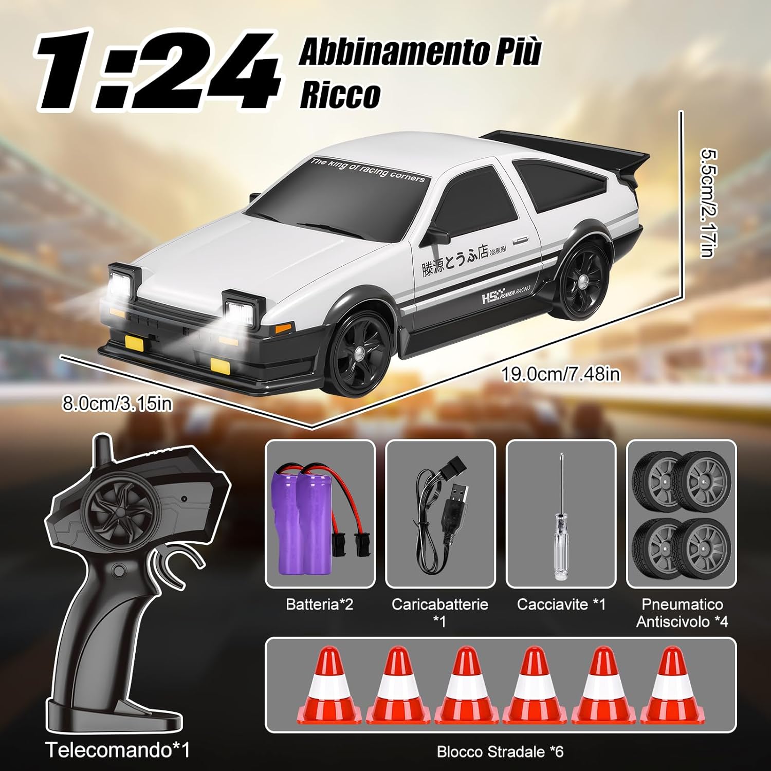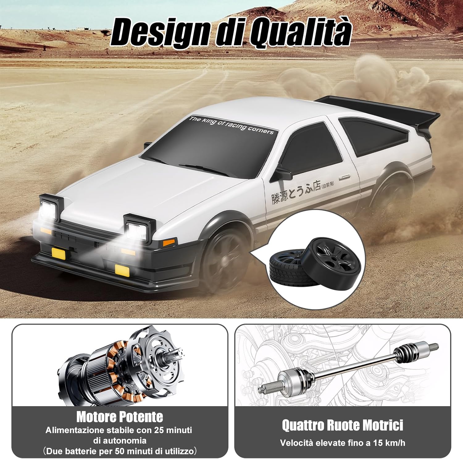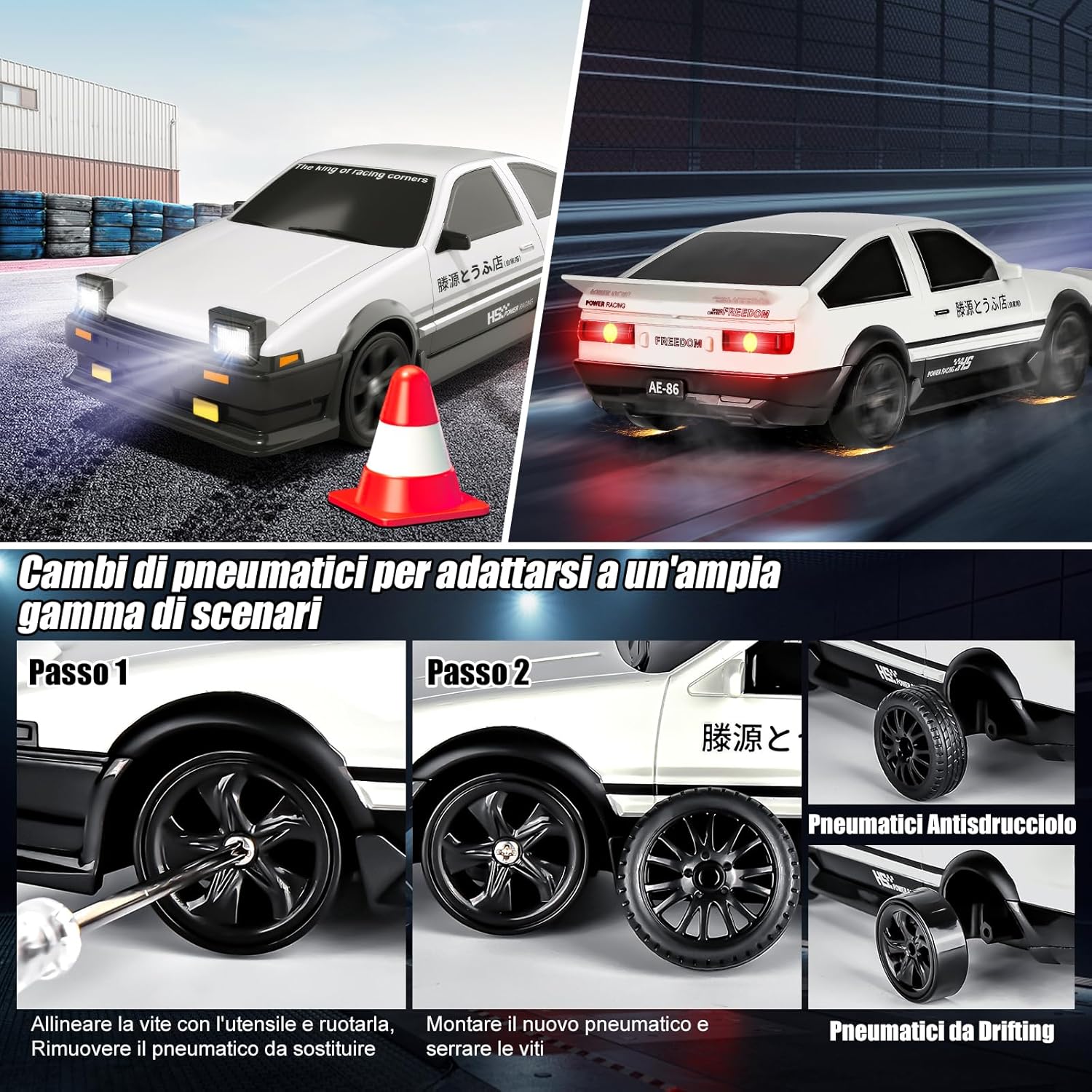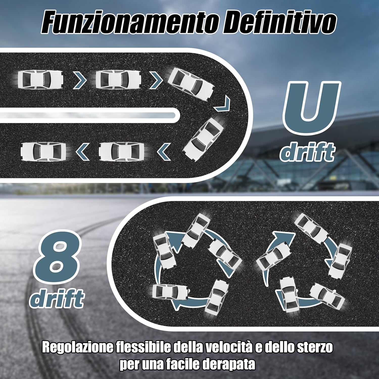 ✨【Cool Modelling】Questa mini macchina telecomandata drift riproduce la modellazione di auto da corsa in scala 1:24. La scocca è realizzata in materiale PVC, flessibile e antiurto, non facile da danneggiare con l'impatto. La vernice è liscia e sembra un vero guscio di metallo. L'auto da drift è dotata di una luce anteriore che si accende quando l'auto è in movimento. Ciò consente di individuare rapidamente l'auto RC in movimento al buio, anche quando si gioca all'aperto di notte senza alcuno stress. ✨【4 Ruote Motrici, Lunga Autonomia】Questa RC Drift Car è progettata con un sistema a 4 ruote motrici, dotato di un motore ad alta potenza, con forte potenza e trazione, la velocità può raggiungere i 18 km/h. Forniamo due batterie ricaricabili da 3.7 V per l'auto, ogni batteria può essere utilizzata per 25 minuti dopo la ricarica completa, e le due batterie possono portare 50 minuti di grande esperienza di corsa. ✨【Sistema di Controllo a 2.4 GHz】Il nostro telecomando è progettato con un'alta frequenza di 2.4 GHz, in grado di fornire un segnale stabile entro 30 metri e di supportare più persone a controllare l'auto telecomandata allo stesso tempo senza interferire l'una con l'altra. Il telecomando può controllare l'auto in avanti, indietro, a sinistra e a destra, facile da usare. Il telecomando richiede due batterie AA (non incluse). ✨【Configurazione dei Pneumatici, Facilità di Derapata】La Mini Drift Car è dotata di 4 pneumatici Speed Racer e 4 pneumatici Drift. I due pneumatici sono rimovibili e intercambiabili, si possono scegliere in base al terreno. Per ottenere l'effetto derapata, si consiglia di farlo su una superficie piana e liscia come tavole di legno o piastrelle per una migliore manovrabilità e agilità. Se il terreno è irregolare o se si gareggia con gli amici, è meglio passare ai pneumatici da corsa. ✨【Miglior Regalo】Questa auto giocattolo può essere utilizzata come regalo di compleanno, regalo per bambini o regalo di Natale. Che tu sia un adulto o un bambino di età superiore ai 6 anni, un appassionato di mini rc car o un principiante inesperto, puoi facilmente padroneggiare le abilità di guida attraverso un semplice funzionamento. I 6 blocchi stradali inclusi aggiungono nuovo divertimento al gioco della derapata. Provate il brivido delle corse ad alta velocità con la vostra i vostri amici!
