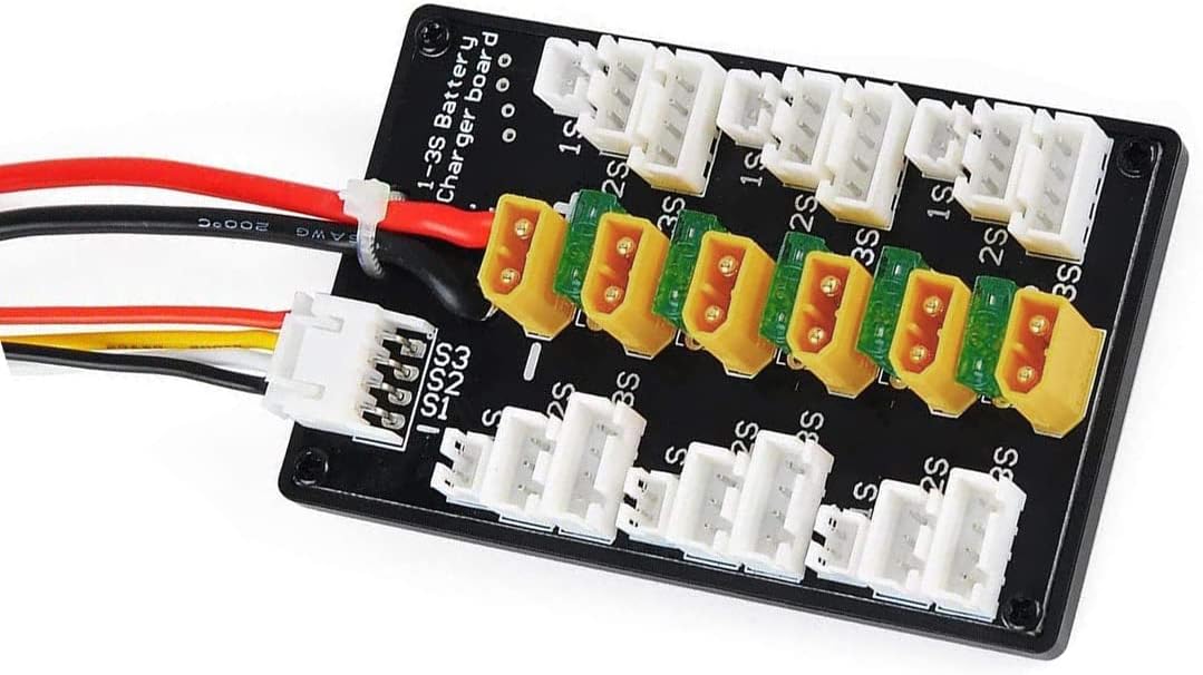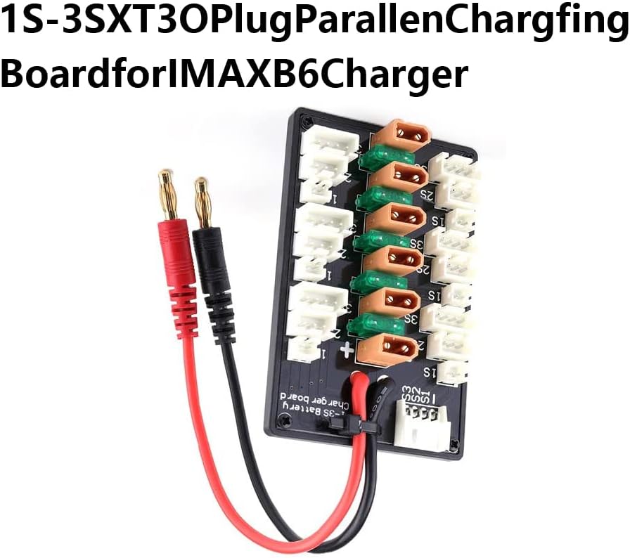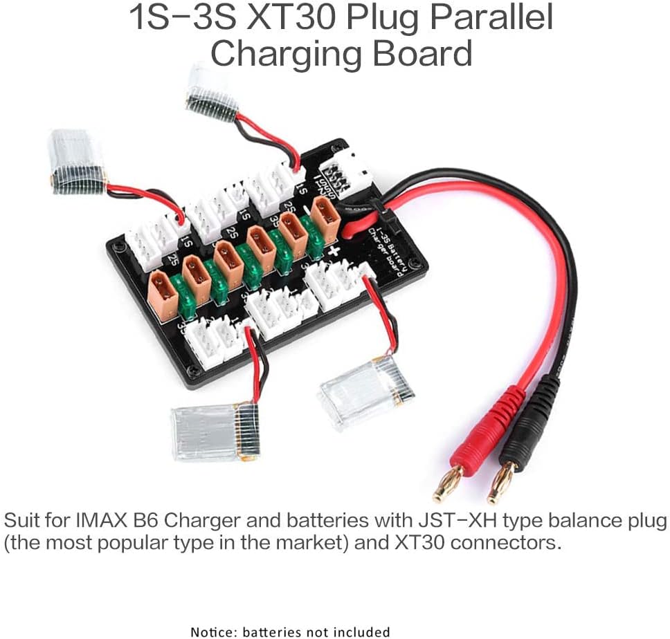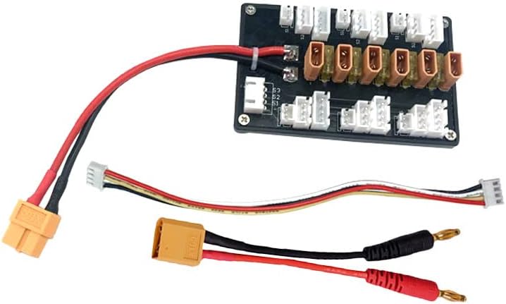 Applicazione: ricarica simultanea di 5 batterie al litio 1S 3,7 V, 6 batterie al litio 2S 7,4 V, o 6 batterie al litio 3S 11,1 V. Materiale di alta qualità: realizzato in lamina di rame PCB più spessa per una ricarica più sicura da 20 A. Comodo da usare: Plug and Play, veloce e facile da usare, comodo per caricare più batterie insieme. Parametri: supporto batteria 1-3S, peso totale: 63 g, dimensioni: 95 x 150 mm, spina di alimentazione XT60, porta di ricarica della batteria XT30. Contenuto della confezione: 1 x XT30 Parallel Charging Board 1 x Banana Plug Adapter 1 x linee bilanciate.