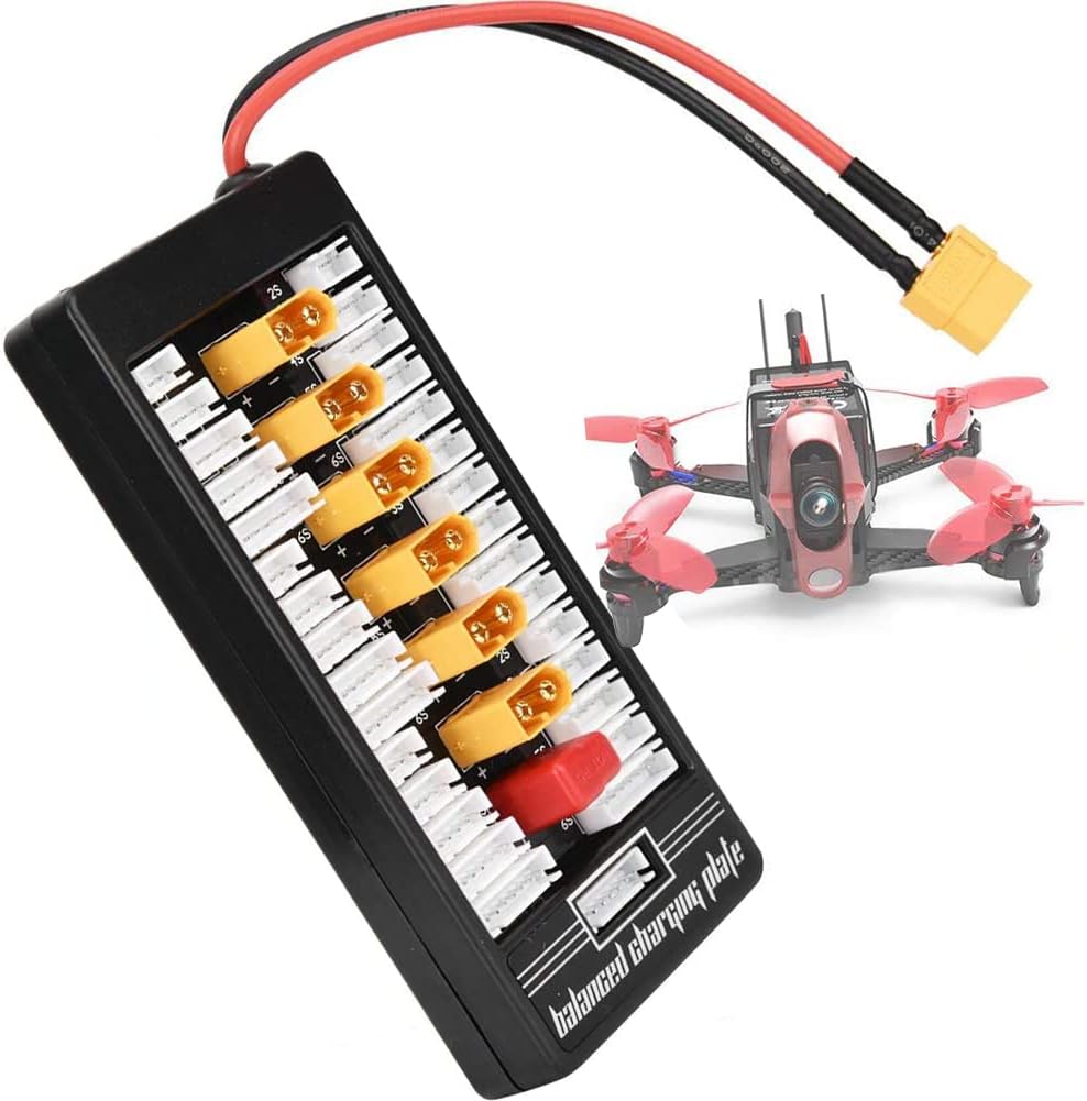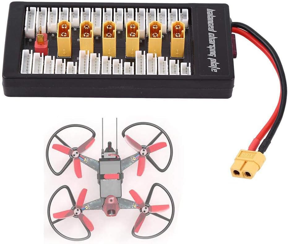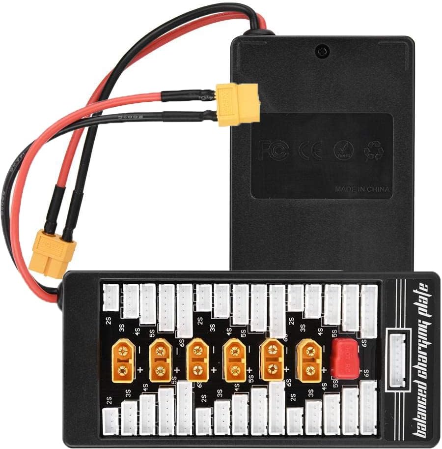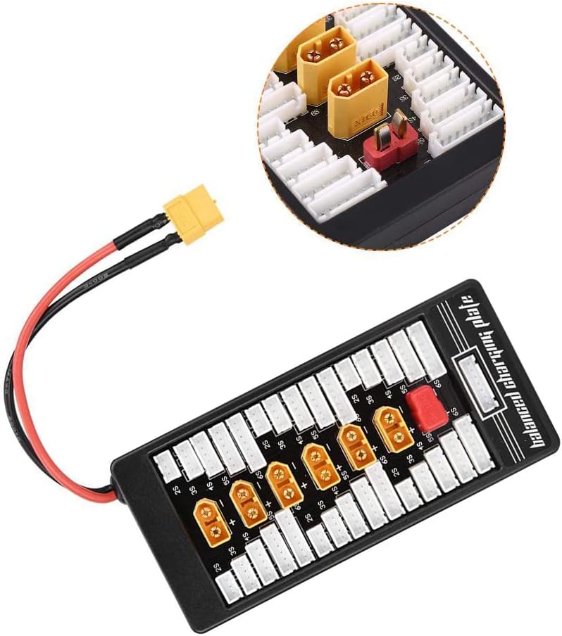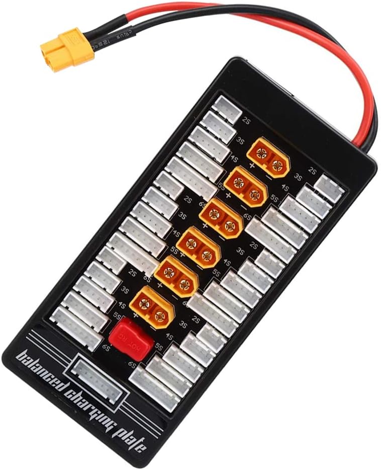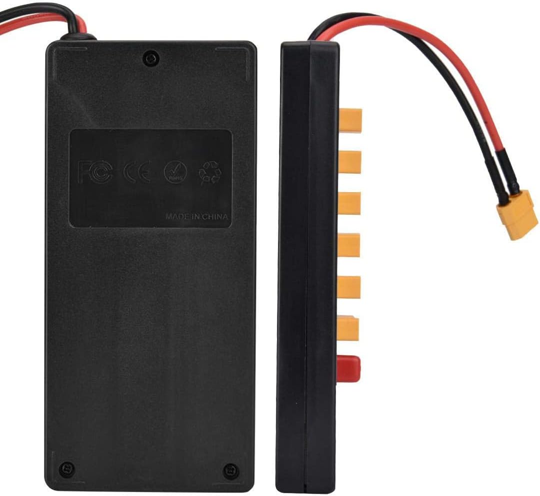 Applicazione: Può supportare 6 gruppi di 2S, o 6 gruppi di 3S, o 6 gruppi di 4S, o 6 gruppi di 5S, o 6 gruppi di 6S per la ricarica parallela. Sicurezza di ricarica: dotato di protezione di sicurezza T tappo in silicone, super protezione da cortocircuito (parte superiore con filo pericoloso da 40 A, rendendo la ricarica più sicura) Materiale di alta qualità: lamina di rame PCB ispessita (FR-4 1,6 piastra spessa 20Z spessore rame) può passare in sicurezza corrente 40A. Parametri: supporto batteria - 2-6S, spina di alimentazione - XT60, porta di ricarica batteria - XT60, calibro filo di bilanciamento - 20AWG, calibro filo di ingresso principale - 14AWG. Contenuto della confezione: 1 x Parallel Charging Board, 1 x linee bilanciate.