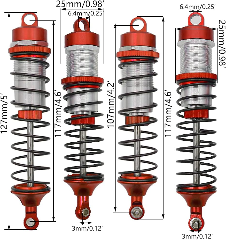 ✔ Sostituzione delle parti #ARA330550, ARA330551 ✔ Ammortizzatore RC ARRMA compatibile con ARRMA 3S e Mega550 Senton Granit Big Rock Typhon ✔ Design riempito d'olio, molla regolabile. Lunghezza regolabile Con molla extra di diametro maggiore, alesaggio maggiore, diametro 27 mm, aspetto forte e robusto ✔ Ammortizzatore anteriore: lunghezza 107 mm, diametro esterno 27 mm, corsa di compressione 27 mm, albero centrale 4 mm, ammortizzatore posteriore: lunghezza 117 mm, diametro esterno 27 mm, corsa di compressione 30 mm, albero centrale 4 mm, molla nera originale diametro 1,5 mm, molla bianca aggiuntiva diametro 1,8 mm ✔ Il materiale leggero in lega di alluminio è durevole e migliora le prestazioni complessive dell'ammortizzatore