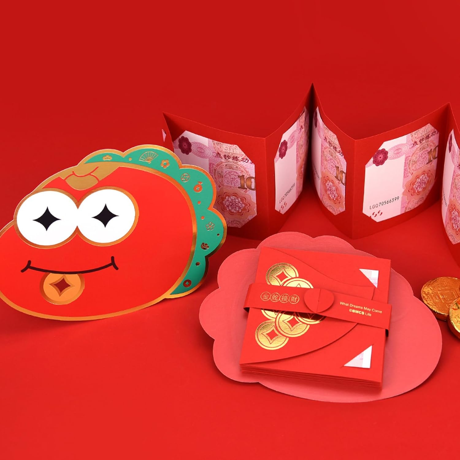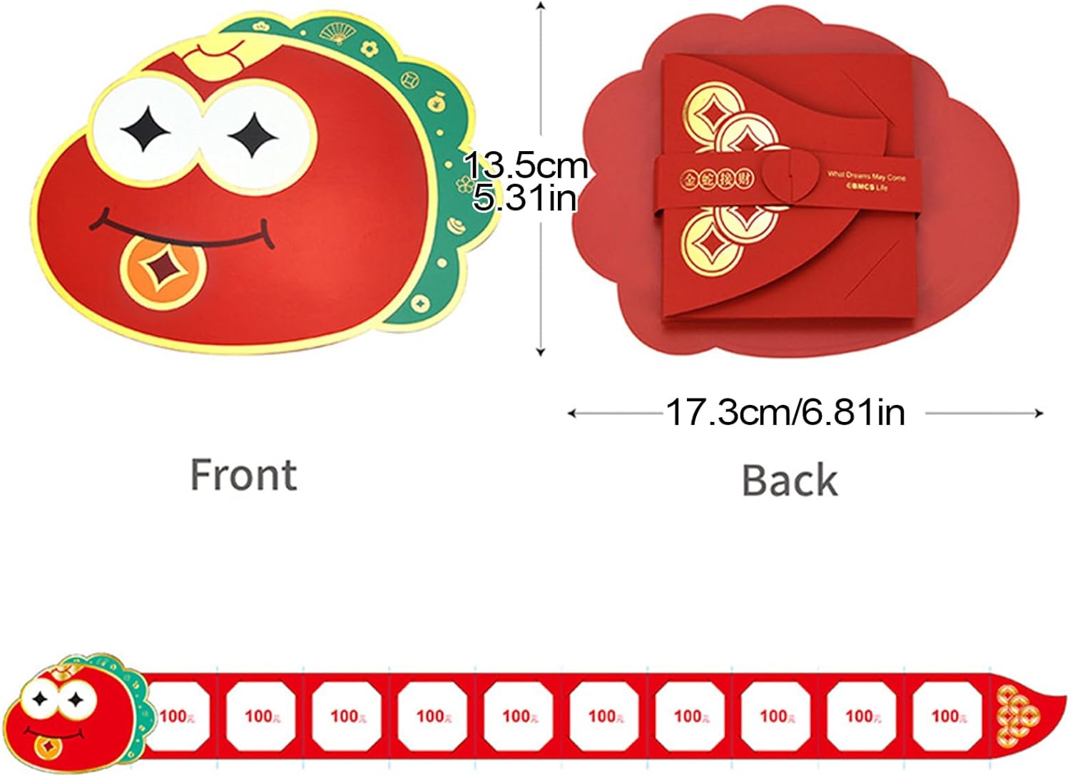 Cartoon Snake Design: Featuring a playful and vibrant snake pattern this red envelope adds a modern twist to traditional money packets making it an eye-catching accessory for festivals weddings birthdays or cultural celebrations that symbolizes good fortune and prosperity Multiple Card Slots for Convenience: Designed with several card slots inside these envelopes allow you to securely hold cash cards gift vouchers or small notes providing a practical solution for gifting money or small valuables during special occasions Traditional and Cultural Significance: Embracing the customs of the spring festival and other celebrations this red envelope respects cultural heritage while offering a stylish way to present monetary enhancing the joy and meaning behind the gesture Premium Material: Crafted from thick quality paper these red packets withstand handling and maintain their shape ensuring your stay protected while reflecting elegance and festive charm suitable for repeated use or keepsakes Secure Closure and Compact Size: Equipped with a flap closure to keep contents safe these envelopes are compact and lightweight making them easy to carry store or distribute during events adding convenience to your gifting experience