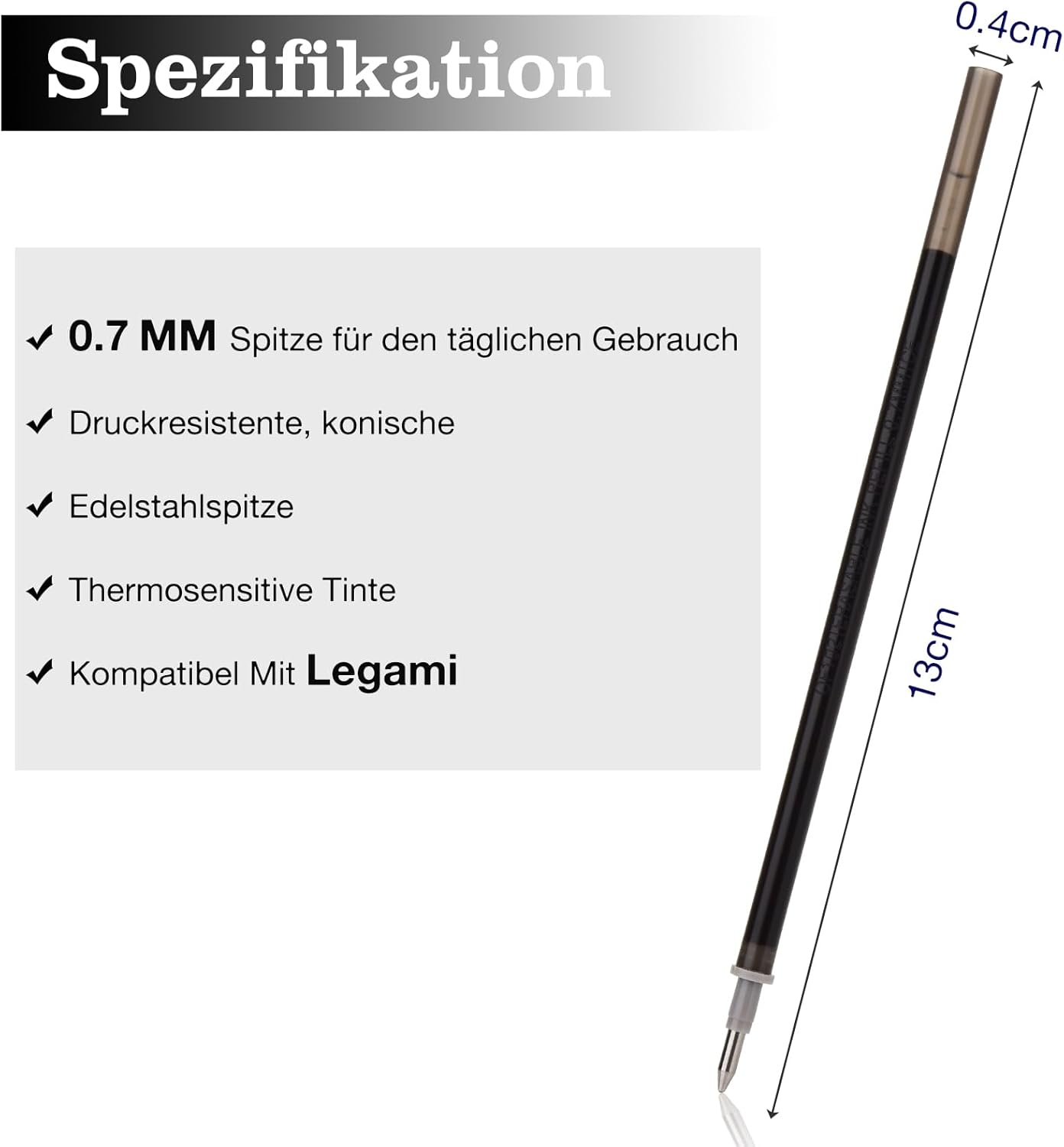 【Compatibile con Legami】 Confezione da 14 ricariche di ricambio per penne gel cancellabili, asciugatura rapida e facile da cancellare Materiali e dimensioni: inchiostro sensibile al calore di alta qualità, nero, altezza 13 cm. Diametro 4 mm, lunghezza scrittura: 170 m. 【Senza graffi】Scritto su carta sottile ecologica, è antigraffio, adatto per principianti o bambini. Regalo per la scuola di ritorno: per bambini, studenti, insegnanti, amici o colleghi, queste penne sono una buona scelta per compleanni, festa dei bambini, Natale o eventi di rientro a scuola. 【Avvertenza】 Non esporre a temperature estreme (-10 °C; +60 °C).Non adatto per documenti professionali: assegno, copia dexamen.