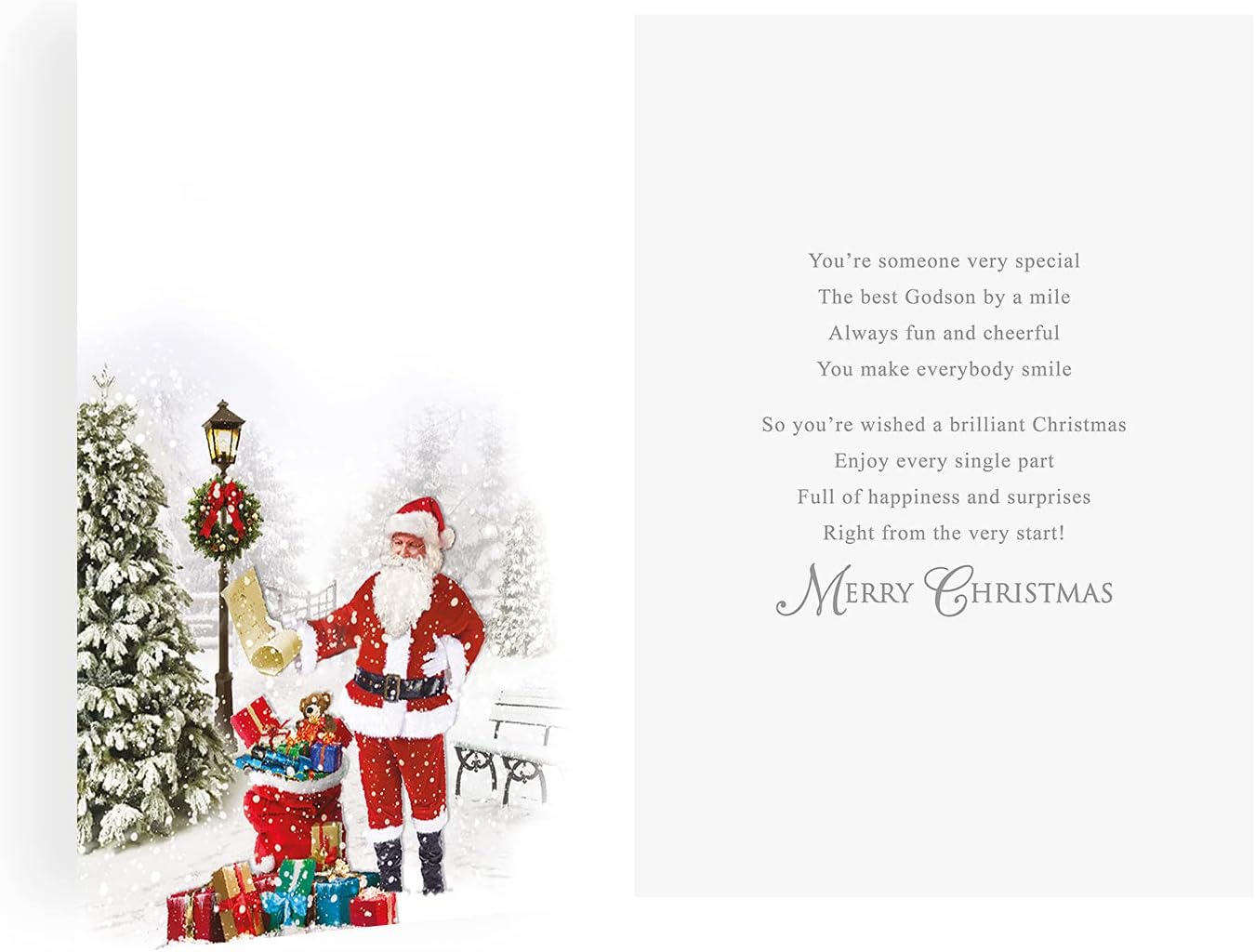 Un biglietto di auguri di Natale di alta qualità e una busta di Regal Publishing Progettato e prodotto nel Regno Unito - Supporting British Jobs Didascalia: Godson Descrizione: Babbo Natale e sacco Dimensioni: circa 9 x 6 pollici