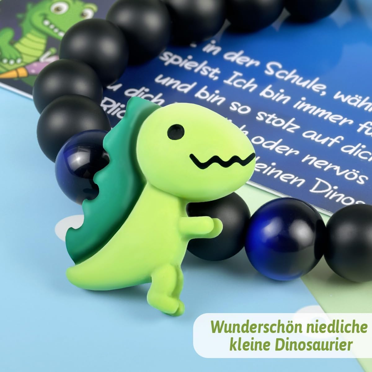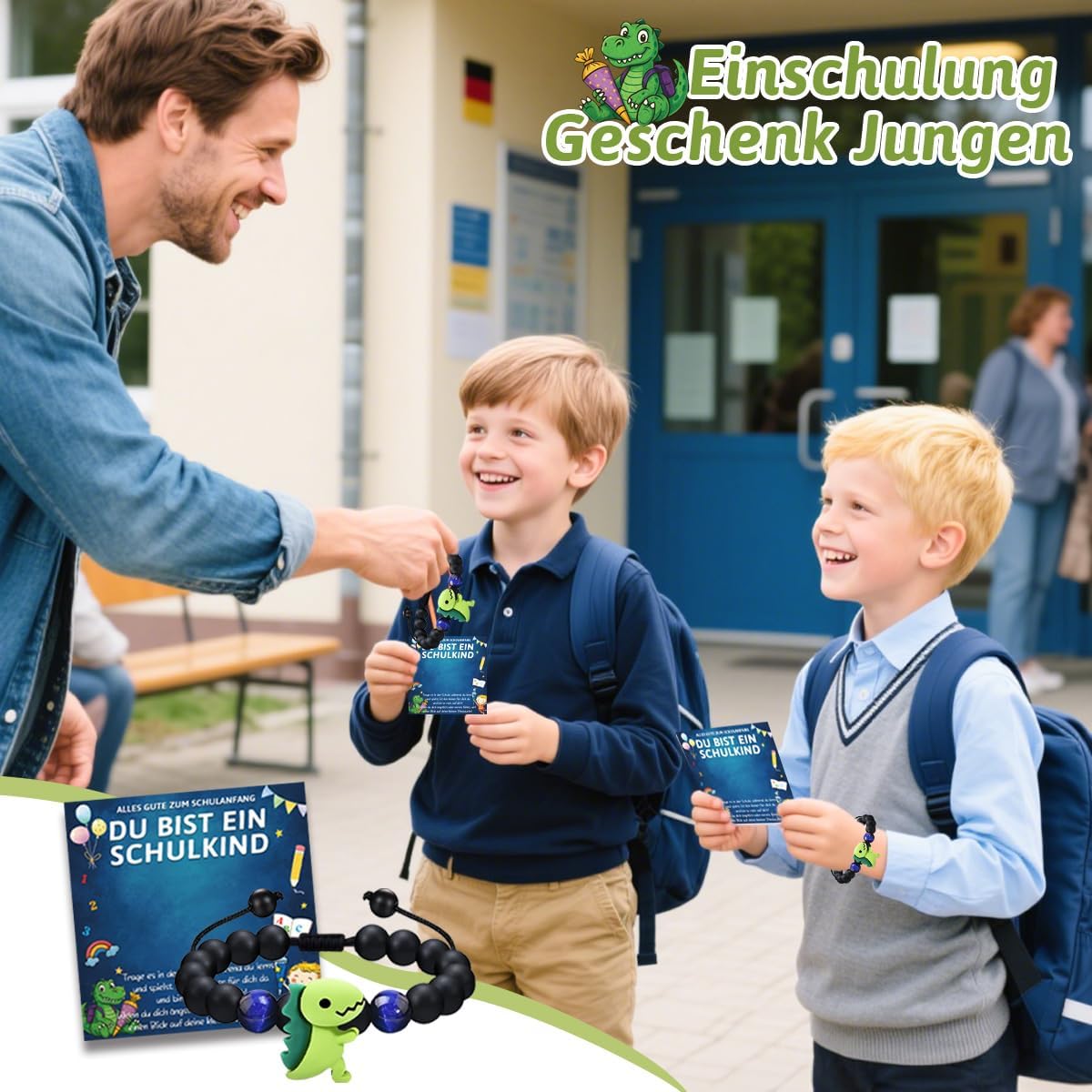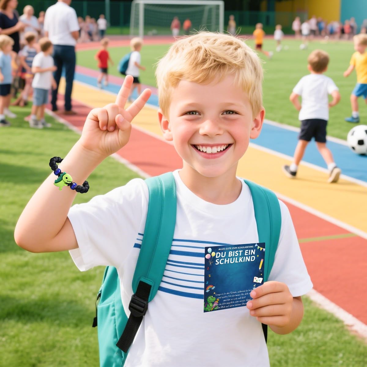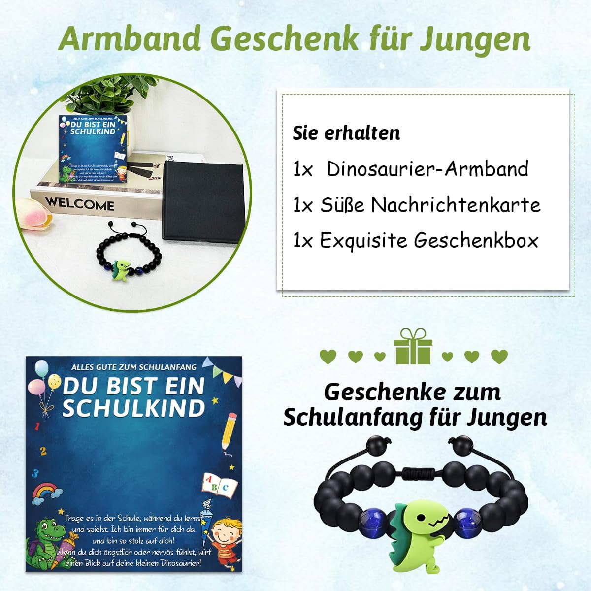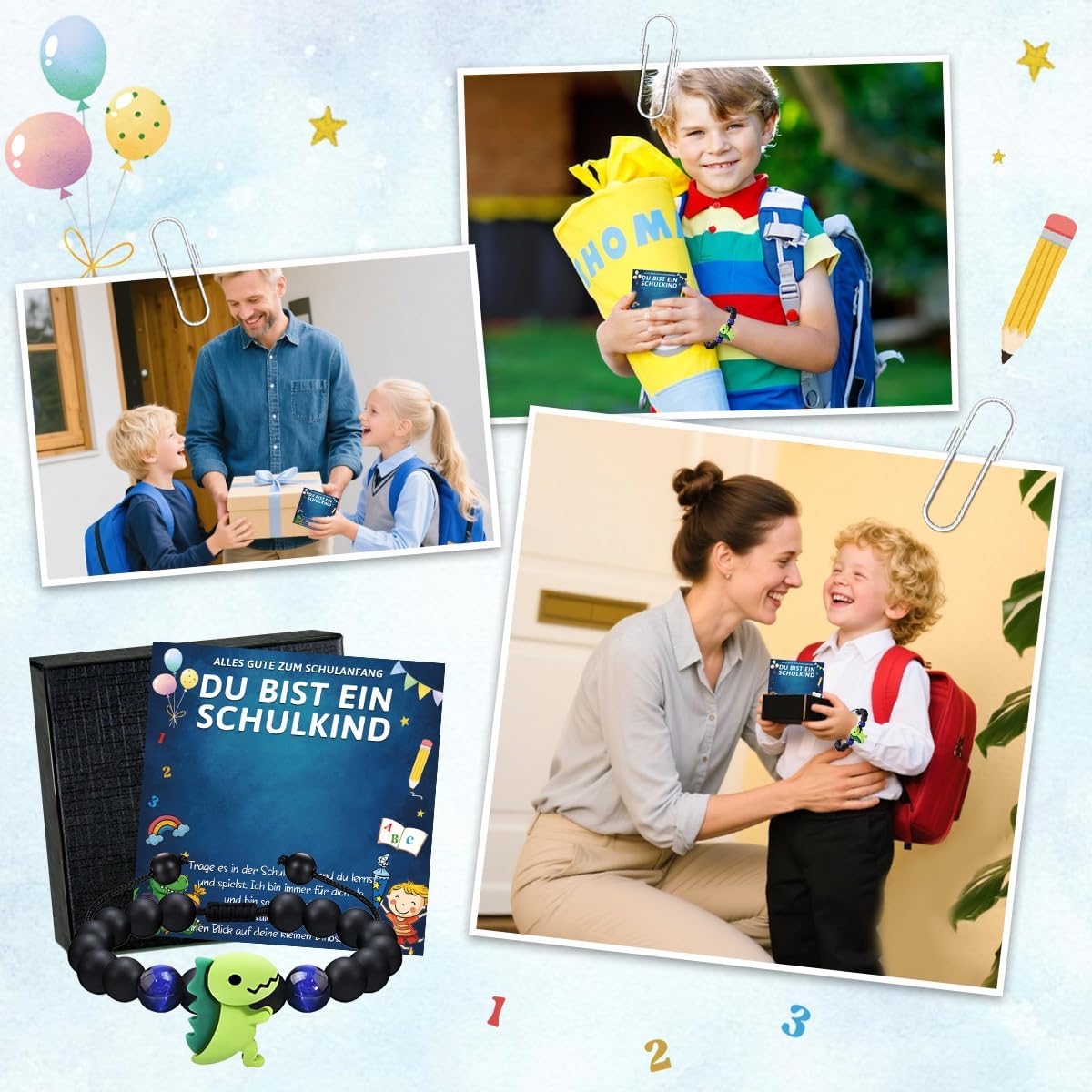 Fantastici regali per il rientro a scuola: questo braccialetto speciale delizierà con un adorabile piccolo dinosauro, ideale per gli appassionati di dinosauri del rientro a scuola. Un ottimo accessorio che darà coraggio ai bambini e migliorerà l'inizio dell'anno scolastico. Bracciale regolabile in ossidiana: realizzato in ossidiana nera di alta qualità, il braccialetto non solo offre un aspetto elegante, ma offre anche un comfort ottimale. Grazie alla sua chiusura regolabile, si adatta facilmente al polso di qualsiasi bambino. Con un adorabile biglietto di coraggio: il biglietto incluso contiene un messaggio motivazionale per il rientro a scuola, perfetto per far sorridere i bambini e accompagnarli nella loro nuova fase della vita. PRONTO DA REGALARE: il set viene fornito in un'elegante confezione regalo nera ed è pronto da regalare: ideale per genitori, nonni, padrini o amici che cercano un regalo speciale per il rientro a scuola. Perfetto per lo zaino della scuola - Un regalo originale e adatto ai bambini che si adatterà perfettamente allo zaino o alla cartella come piccola sorpresa - un portafortuna per il primo giorno di scuola e oltre.
