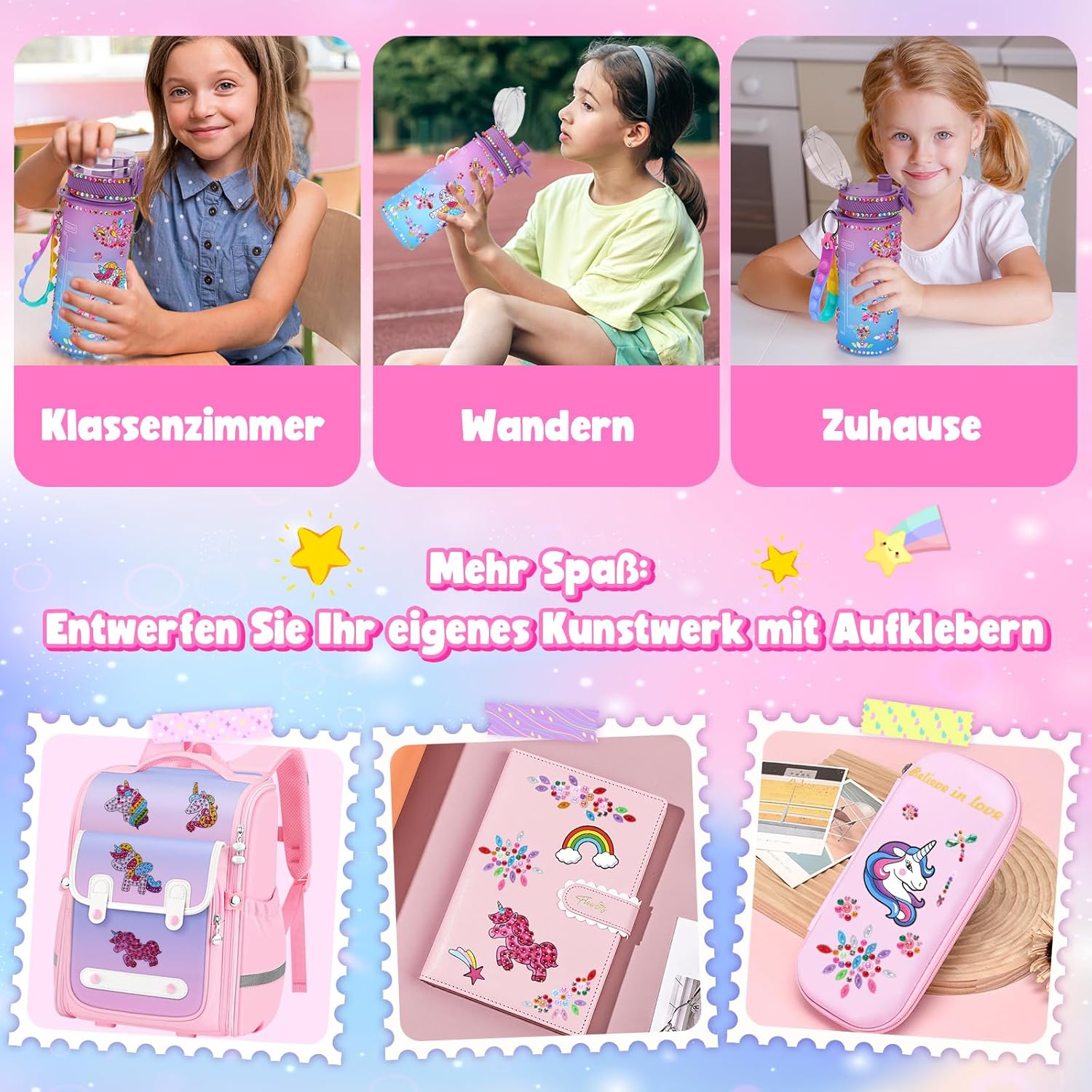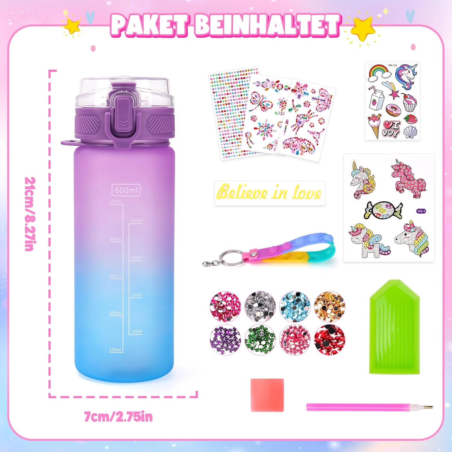 🦄【Decora la tua borraccia】Regalo per ragazze 5 6 7 8 9 10 11 anni. L’acqua è molto importante per la salute umana. Il bellissimo design della bottiglia d'acqua può incoraggiare i bambini a bere di più l'acqua. Il nostro stile di set di giocattoli per unicorno combina elementi popolari di pittura con diamanti e set di adesivi scintillanti per soddisfare le diverse esigenze dei bambini. A scuola o all'aperto, i bambini portano con orgoglio le loro bottiglie d'acqua fatte in casa. 💦 【Facile da aprire e a prova di perdite】 Borraccia da palestra in materiale di alta qualità, priva di BPA e resistente, il coperchio è dotato di un blocco del coperchio, basta premere il pulsante del coperchio per bloccarlo e facile da aprire, il coperchio della tazza è intarsiato con un anello di gomma per evitare perdite d'acqua. L'artigianato fai-da-te per bambini è dotato di portachiavi fidget, portatile e bello. Borraccia sportiva con scala del volume sulla superficie per monitorare facilmente l'assunzione giornaliera di acqua. 🌈【Set artigianale per bambini dai 6 ai 12 anni】Il kit artigianale è un set creativo per bambini e adulti. I bambini non solo possono divertirsi con il fai-da-te, ma anche migliorare le loro abilità pratiche e motorie e ridurre lo stress. Il kit artigianale contiene: bottiglia d'acqua da 600 ml*1, un adesivo per pittura con diamanti con unicorno*1, adesivi con pietre preziose*3, adesivi*1, un set di accessori per pittura con diamanti x1 e una corda per appendere x1. Regali per bambine di 4-5-6-7-8-9 anni. 🎊【Fai da te facile per bambine di 4-11 anni】Regali di unicorno per ragazze di 5 6 7 8 9 anni. Ogni adesivo con pittura con diamanti è stampato con lettere e numeri. Devi solo selezionare il diamante corrispondente e poi incollarlo uno per uno nella posizione corretta, staccare l'adesivo scintillante della pietra preziosa e incollarlo sulla bottiglia sportiva. Gli adesivi per l'artigianato dei bambini possono essere utilizzati anche per decorare quaderni, zaini, astucci, valigie e altri oggetti. 🎁【I migliori regali per ragazze di 5-12 anni】Se tua figlia, tuo figlio o tua nipote amano le attività artigianali, il set creativo di oggetti artigianali sarà uno dei migliori giocattoli di gioielleria per ragazze di 4, 6, 8 anni. Perfetto come regalo di compleanno, regali di Natale, Pasqua, rientro a scuola, diploma di scuola elementare, idee regalo per San Valentino, ecc. (Istruzioni per la pulizia: dopo aver applicato l'adesivo sulla bottiglia d'acqua, lavarla lentamente con le mani per evitare che l'adesivo cada).