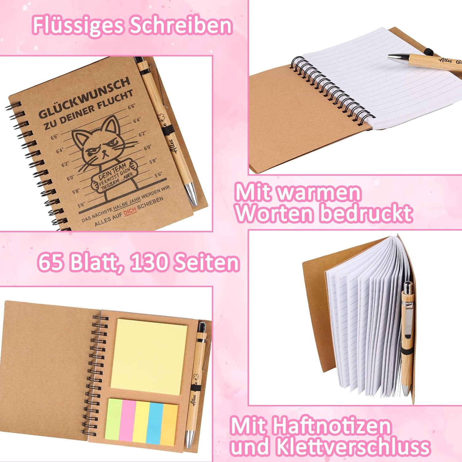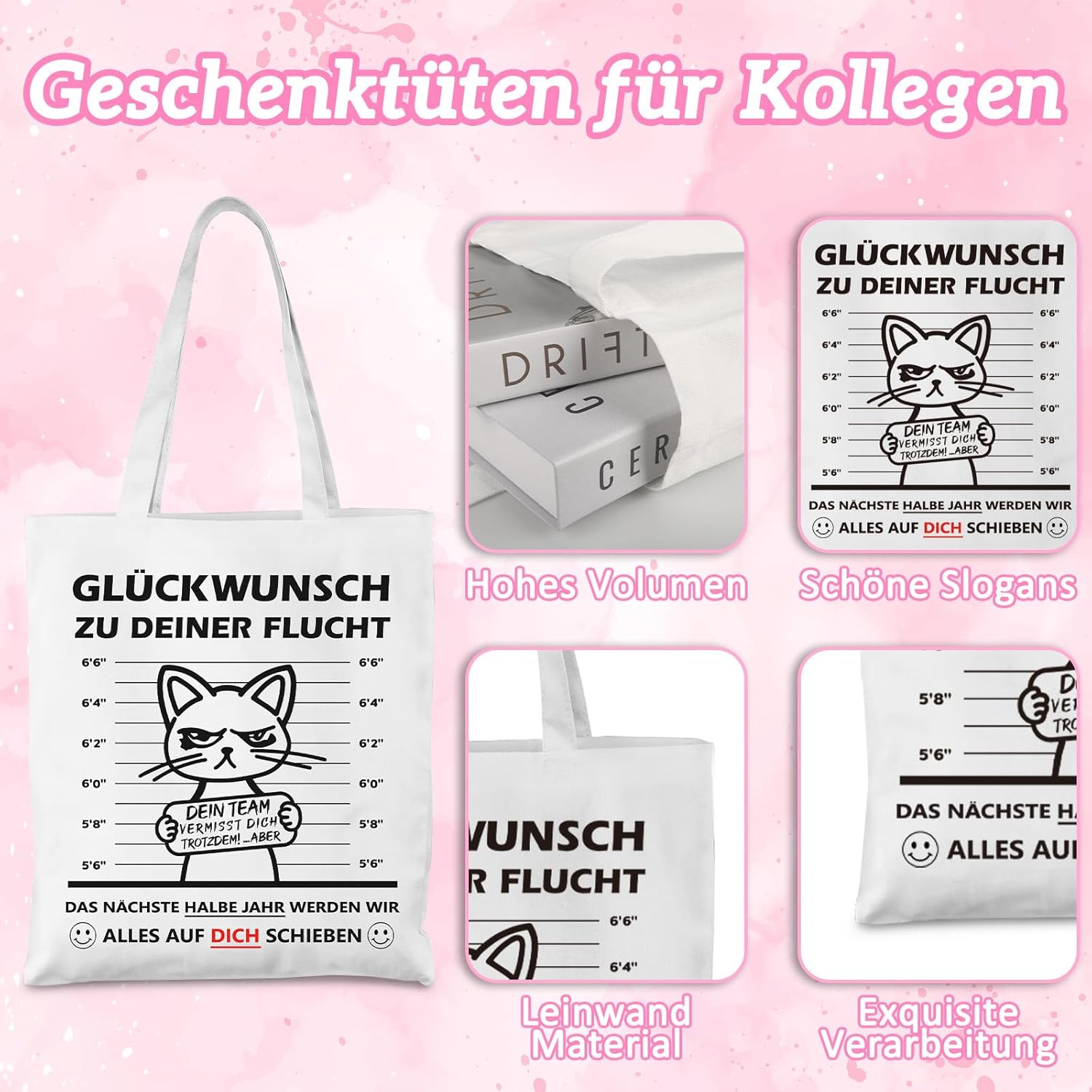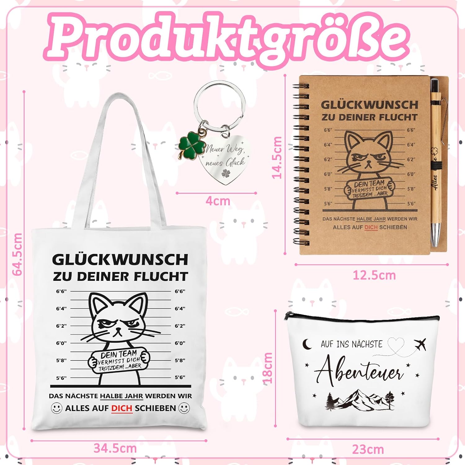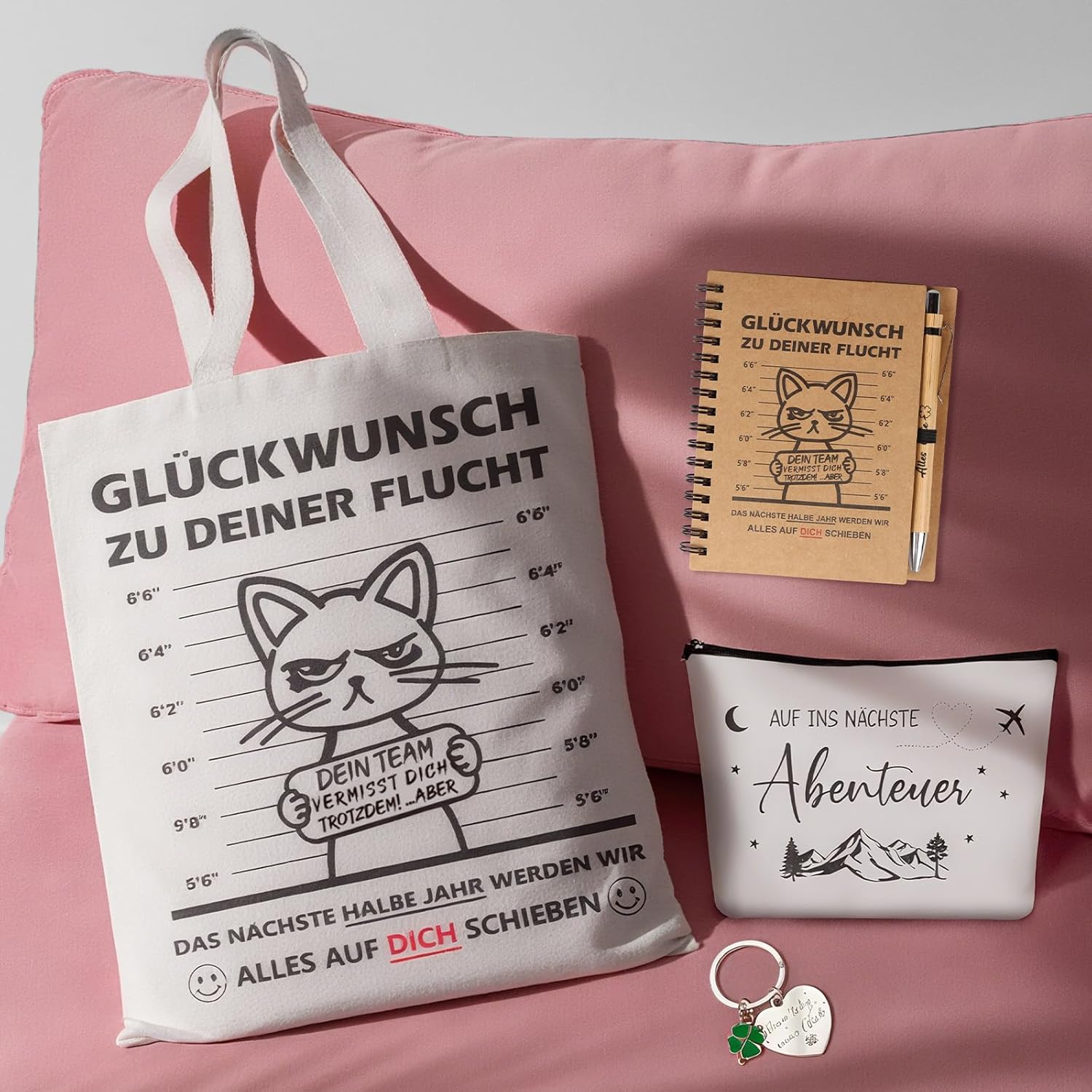 Set regalo di addio premium da 5 pezzi per i colleghi: sorprendi i colleghi in uscita con un set regalo completo (incluso taccuino, penna a sfera retrattile, portachiavi, borsa per cosmetici e borsa in tessuto). Perfetto come regalo di addio per i colleghi per esprimere apprezzamento in modo elegante e pratico. Pratico e riutilizzabile: molto più di un semplice regalo d'addio: la borsa in tessuto di alta qualità e la versatile borsa per cosmetici (ideale per cosmetici, viaggi o conservazione) e l'utile portachiavi accompagnano il vostro collega nella vita di tutti i giorni anche dopo l'addio. Così il ricordo resta vivo! Design suggestivo con ""Congratulazioni per la tua fuga"": le parti principali (taccuino, borsa in tessuto) hanno la stampa divertente e popolare ""CONGRATULAZIONI PER LA TUA fuga"". Un sorriso garantito al momento dell'addio e un ricordo indelebile per il tuo collega. Materiali di alta qualità per un divertimento duraturo: qualità affidabile: taccuino con carta liscia, penna a sfera retrattile facile da scrivere, borsa in tessuto resistente, portachiavi robusto e borsa per cosmetici in materiale resistente. Mostra cura in ogni dettaglio. Idea regalo perfetta per ogni occasione di addio: che si tratti di un cambio di lavoro, di una pensione o semplicemente di un "arrivederci", questo versatile regalo di addio è ideale come piccolo regalo per i colleghi, regalo per il collega preferito o per creare una calda festa di addio. Semplice, elegante e pieno di buon augurio