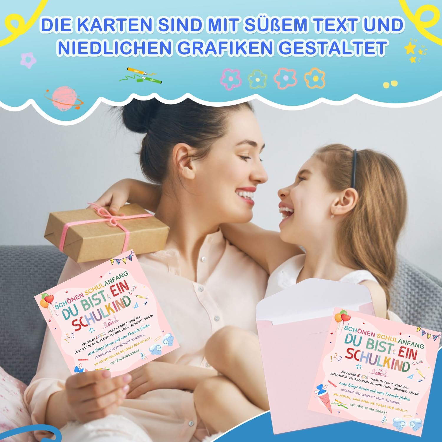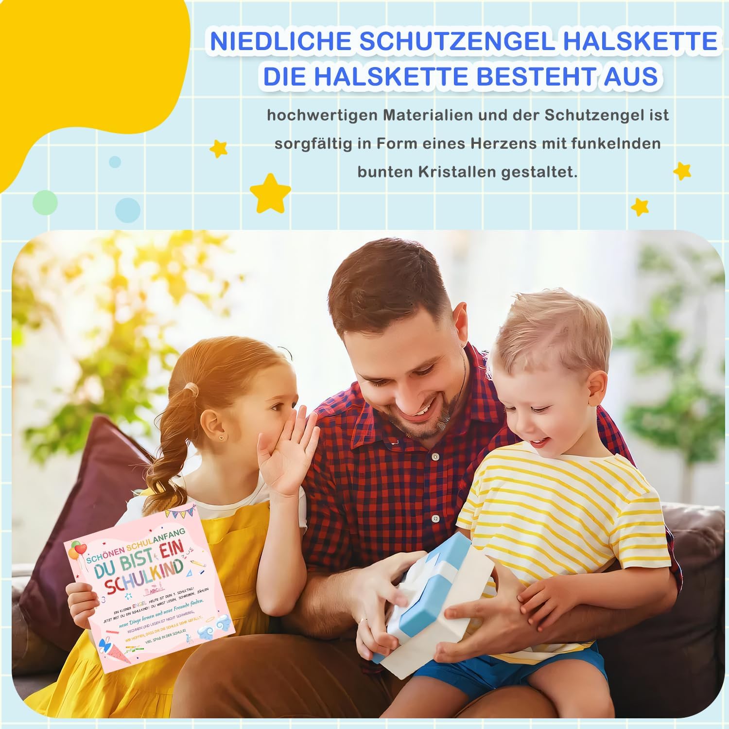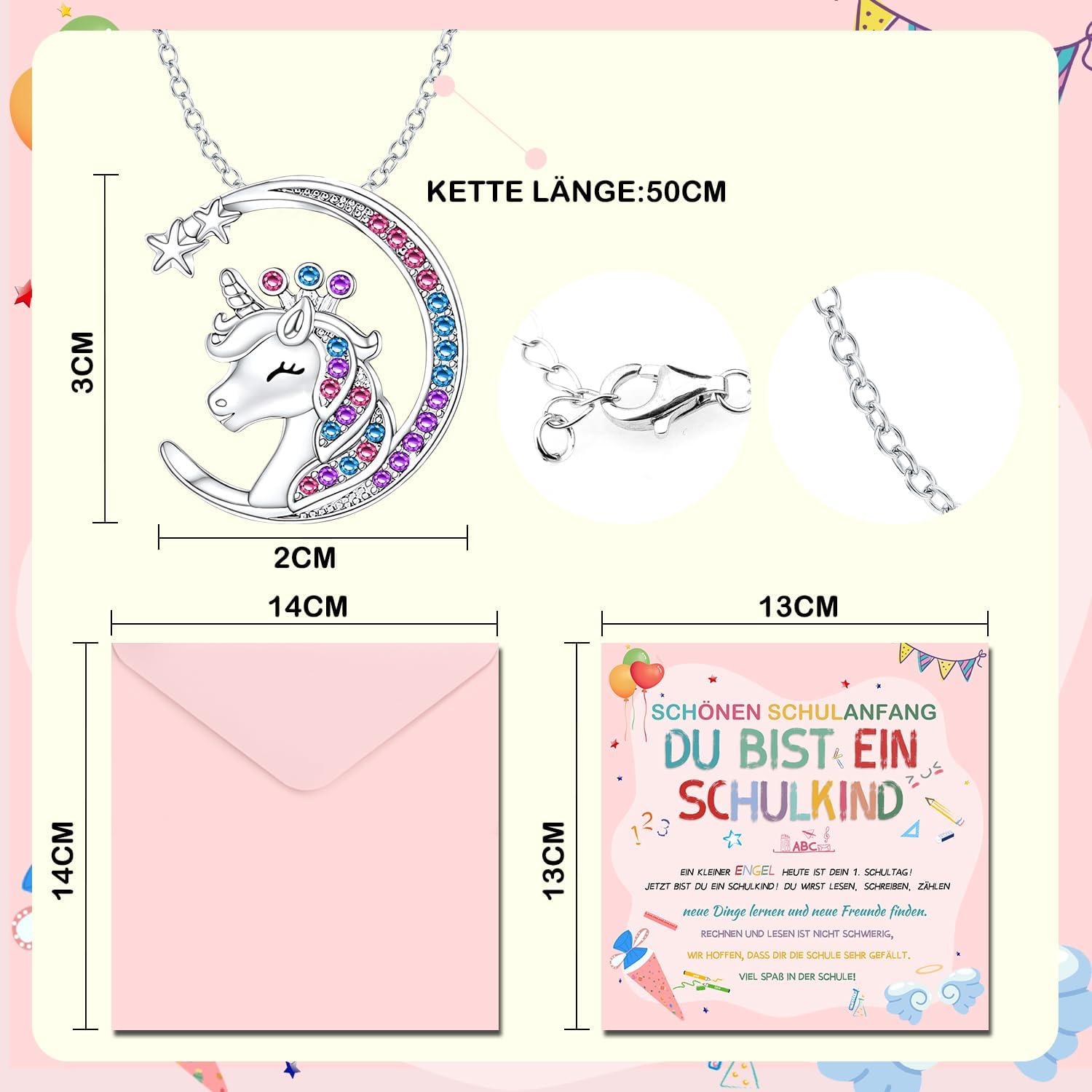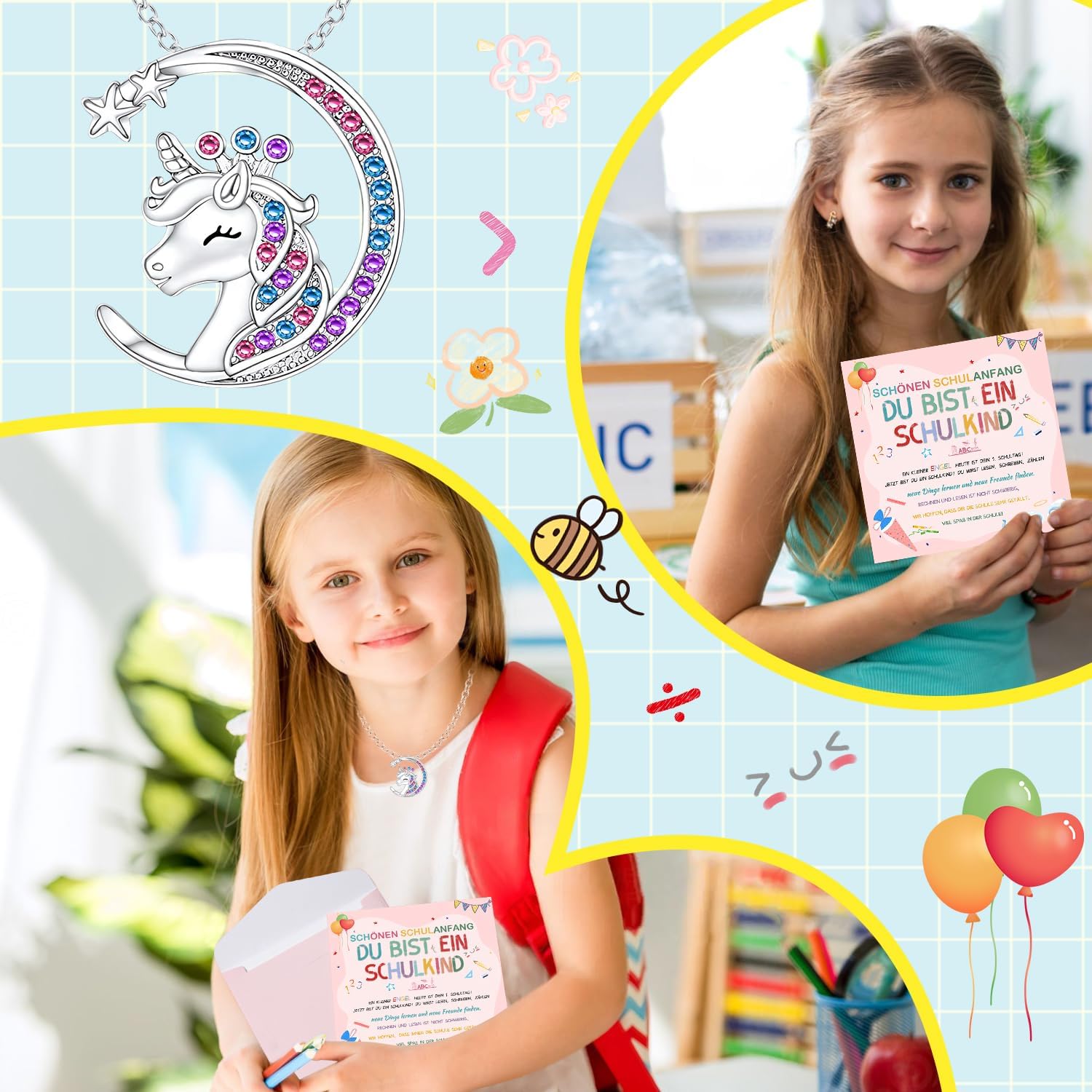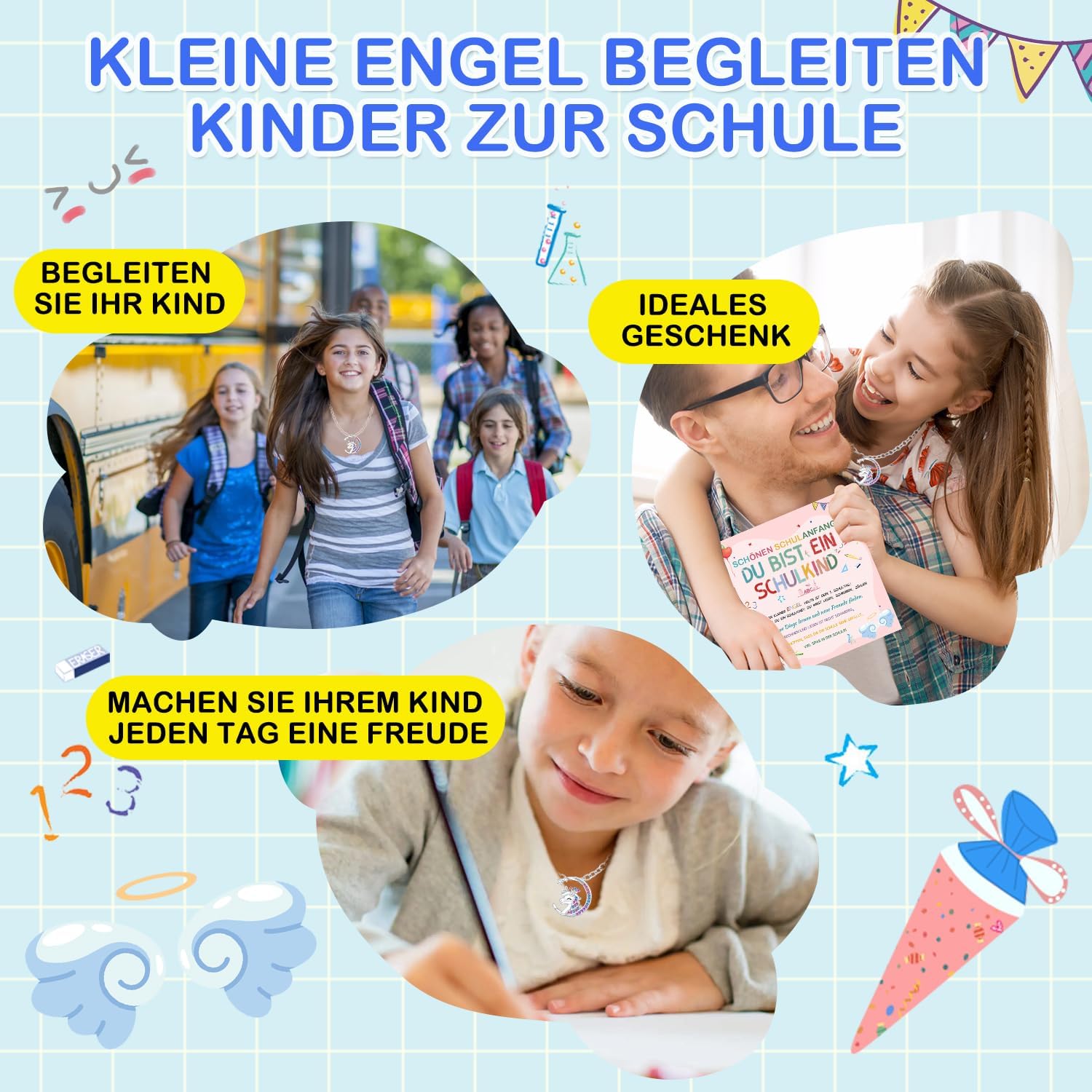 【Regalo per l'iscrizione alla scuola】 Il set per la borsa della scuola contiene una collana con angelo custode, un biglietto di auguri e una busta rosa. Rendi felici i tuoi bambini il primo giorno di scuola e fatti accompagnare a scuola da un angelo custode. Porta con te il tuo portafortuna, renderà sicuramente la festa d'ingresso ancora più divertente! 【Collana con angelo custode】 Questo set di collane portafortuna è realizzato con materiali di alta qualità, l'angelo custode è accuratamente progettato a forma di luna con scintillanti cristalli colorati. Il ciondolo con angelo custode è splendidamente progettato per trasmettere un messaggio di positività, incoraggiamento, protezione e felicità per le scolari del 2024 che stanno iniziando la scuola. 【Biglietti d'auguri per il ritorno a scuola】 Questi graziosi biglietti d'auguri sono progettati appositamente per il ritorno a scuola, utilizzando graziosi disegni grafici e colori vivaci adatti ai bambini e contengono benedizioni e calorosi auguri per i bambini. I regali per il rientro a scuola rendono felici i più piccoli il primo giorno di scuola. 【Regalo ideale】 Il set regalo per il rientro a scuola è adatto a ragazzi e ragazze. Il biglietto di auguri e l'angelo custode sono in colori vivaci e carini, perfetti come regalo di compleanno per ragazzi e ragazze che vanno a scuola! I dolci angeli custodi possono accompagnare i bambini delle scuole elementari a scuola e proteggerli dagli imprevisti. 【Molteplici scenari di applicazione】 Indossa la collana attorno al collo o alle mani dei bambini, appendila agli zaini o alle borse della scuola e lascia che l'angelo custode accompagni sempre i tuoi figli. Che tu sia tu o i figli di amici e familiari, questo adorabile set è un'ottima scelta.