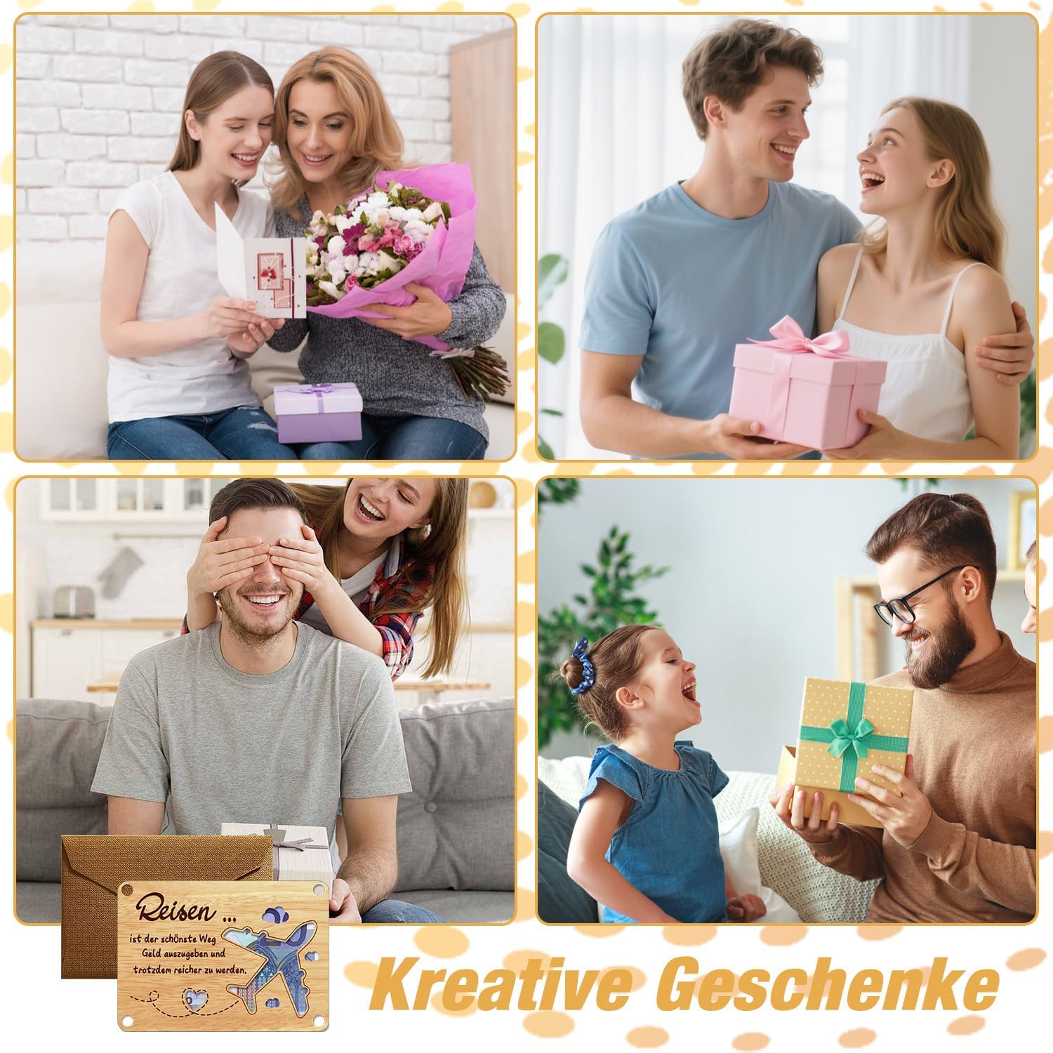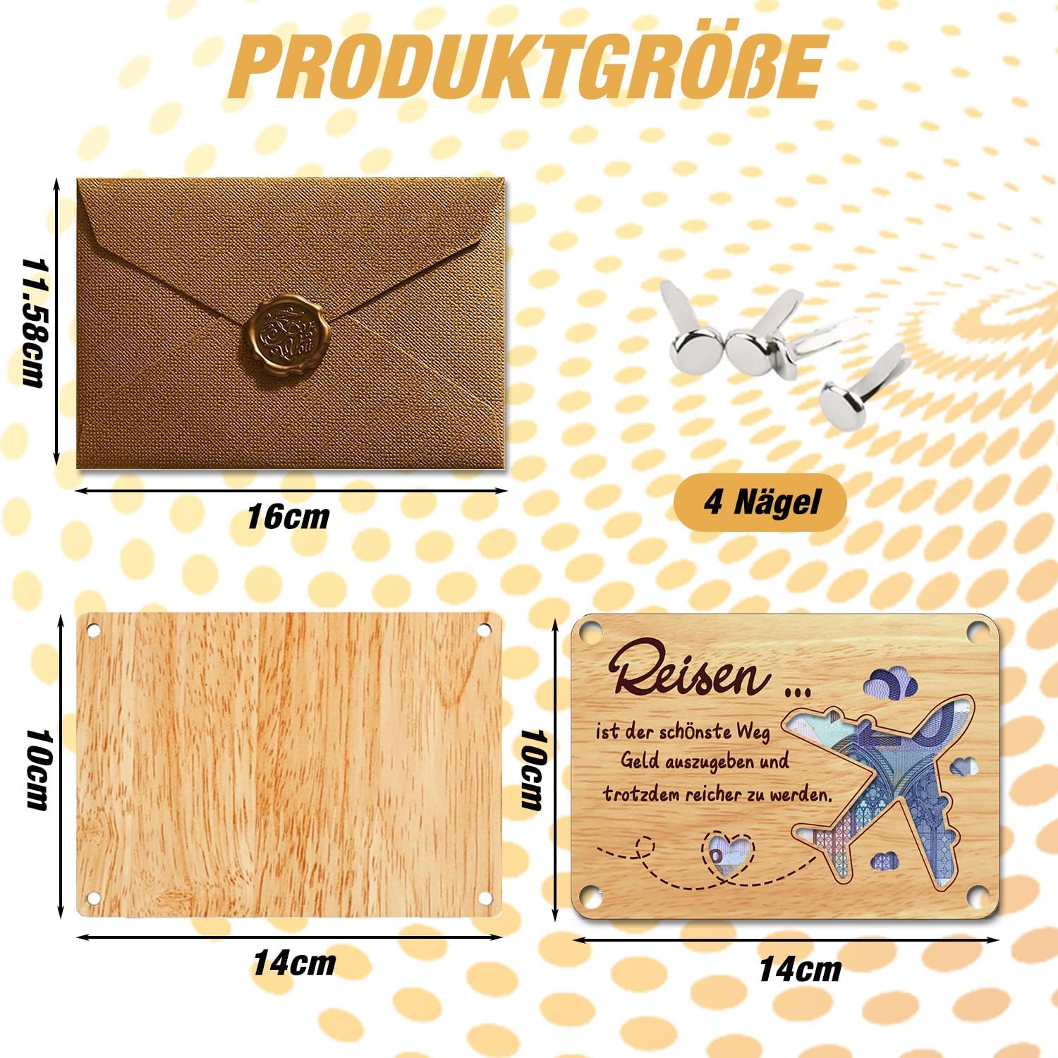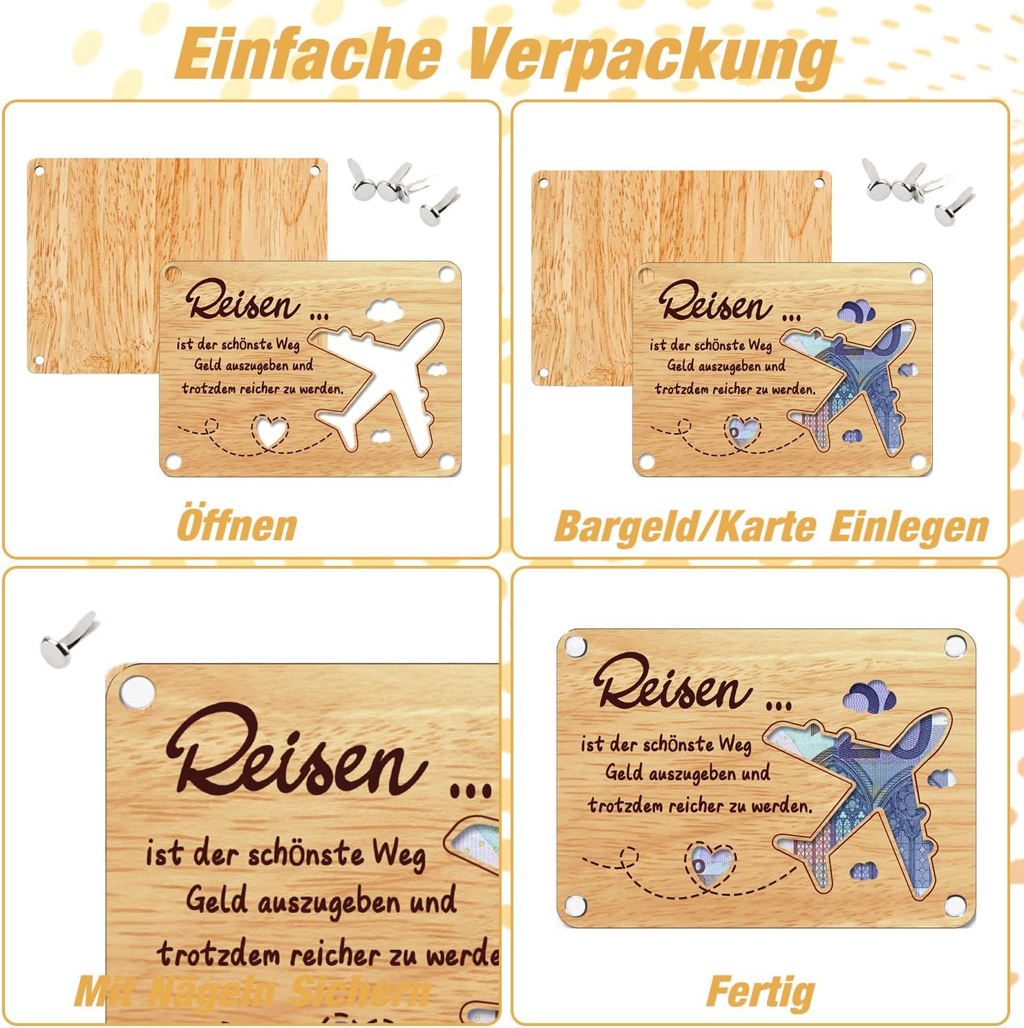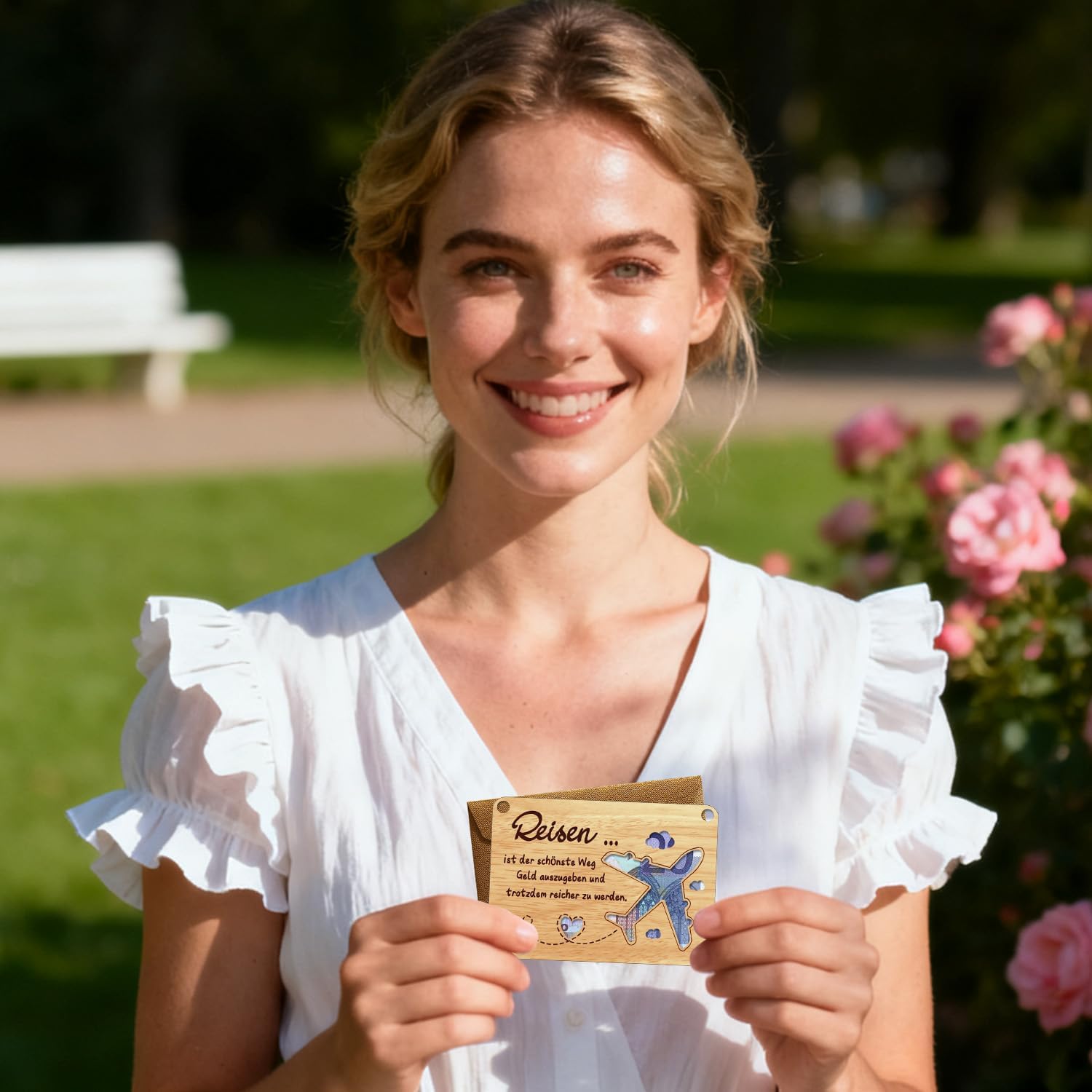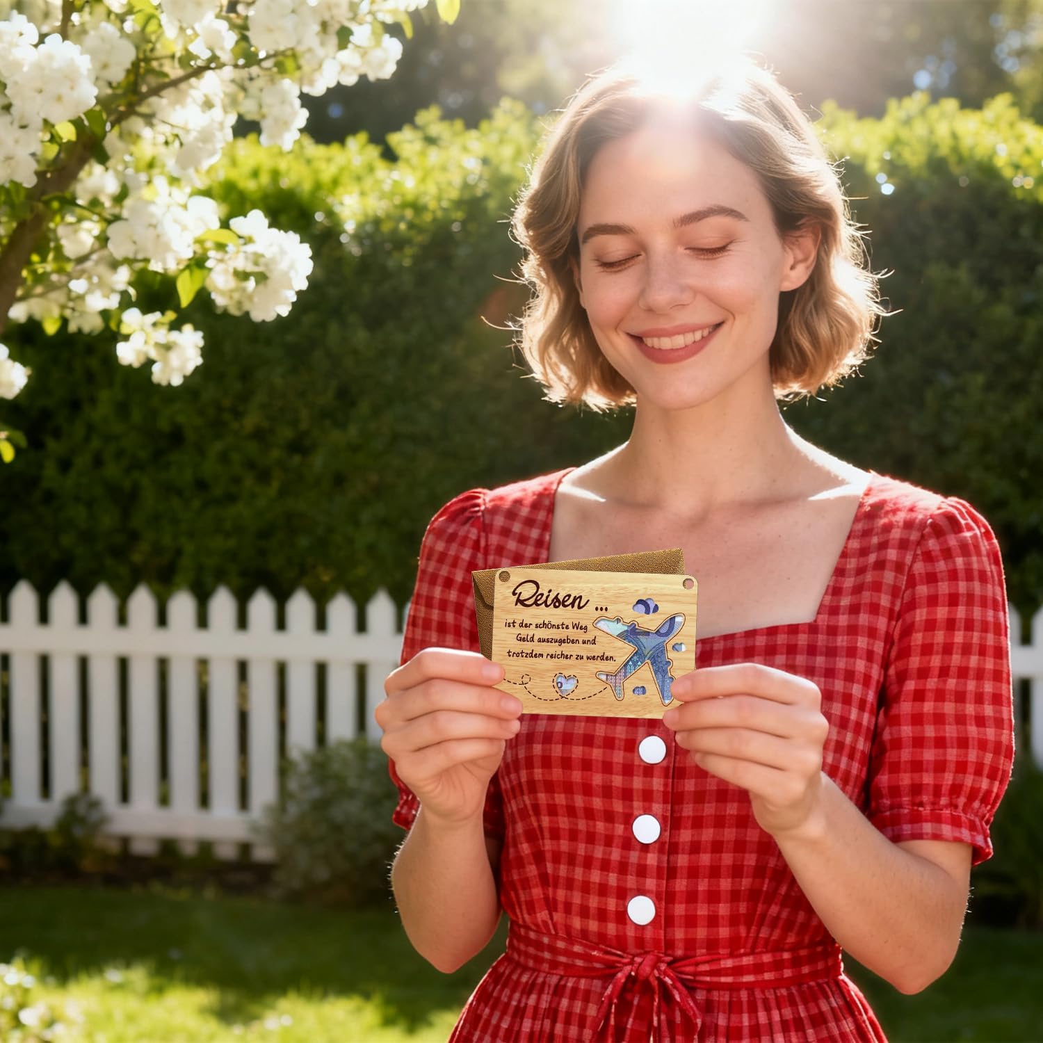 Set regalo da viaggio in legno: riceverai un regalo di compleanno in denaro da viaggio con due placche di legno lunghe 14x10 cm, quattro chiodi, una busta lunga 11,5x16 cm e un piccolo biglietto bianco. In questo modo puoi facilmente confezionare i tuoi desideri di viaggio. Legno naturale: i buoni per realizzare desideri sono realizzati in legno di alta qualità, hanno un colore caldo e naturale e sono resistenti ai danni causati dallo stoccaggio quotidiano. Dopo il viaggio, usali come souvenir dei tuoi soldi di viaggio e dei tuoi desideri. Facile da usare: posiziona i soldi del viaggio o i consigli di viaggio scritti a mano tra le due assi di legno, fissali con i chiodi, scrivi i tuoi desideri sul piccolo buono di viaggio bianco e mettilo nella busta. Versatile: se un amico sta partendo per un viaggio da solo, una famiglia sta pianificando una vacanza in famiglia o una coppia sta preparando un viaggio di coppia, questa confezione di buoni regalo in denaro è il compagno perfetto per i vostri viaggi. Un regalo dal cuore: rispetto al semplice denaro contante, un regalo con un fondo viaggio con un messaggio di viaggio speciale può esprimere meglio la vostra preoccupazione per il viaggio del vostro partner. È più di un semplice regalo; trasmette il tuo desiderio di un viaggio sicuro e di successo.