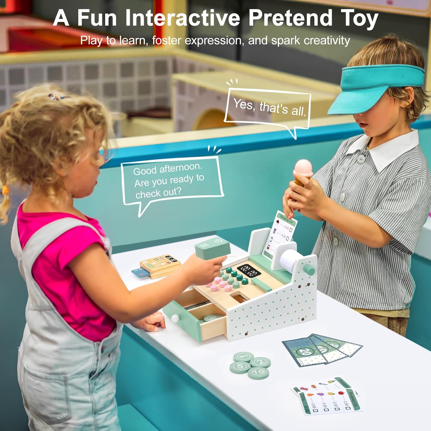🛒【Starter Kit Mini Store Manager】Replica le casse del supermercato con un registratore di cassa, un lettore di carte e 3 liste della spesa. Esercitati nel calcolo delle monete, nella stampa di fatture e nei pagamenti con carta per migliorare le capacità matematiche e comunicative. 🌳【Costruzione sicura in legno】Realizzato in legno sostenibile, levigato a mano per morbidezza e bordi arrotondati. Durevole e rispettoso dell'ambiente, ideale per giochi di ruolo senza fine 📚【Stile britannico per l'insegnamento precoce】Calcolatrice a doppia modalità (suoni di matematica/pianoforte), scanner con luci e suoni e un taccuino. Impara le basi di STEM (matematica, informatica, scienza, tecnologia) mentre pesi e incassi oggetti 🎁【Regalo divertente per i bambini】Include un set completo di accessori come monete, carte di credito e banconote. È sia un giocattolo divertente che uno strumento educativo, perfetto come regalo di compleanno o di Natale per i bambini. I bambini si esercitano a scansionare e dare il resto per sviluppare abilità finanziarie in sessioni giornaliere di 20 minuti