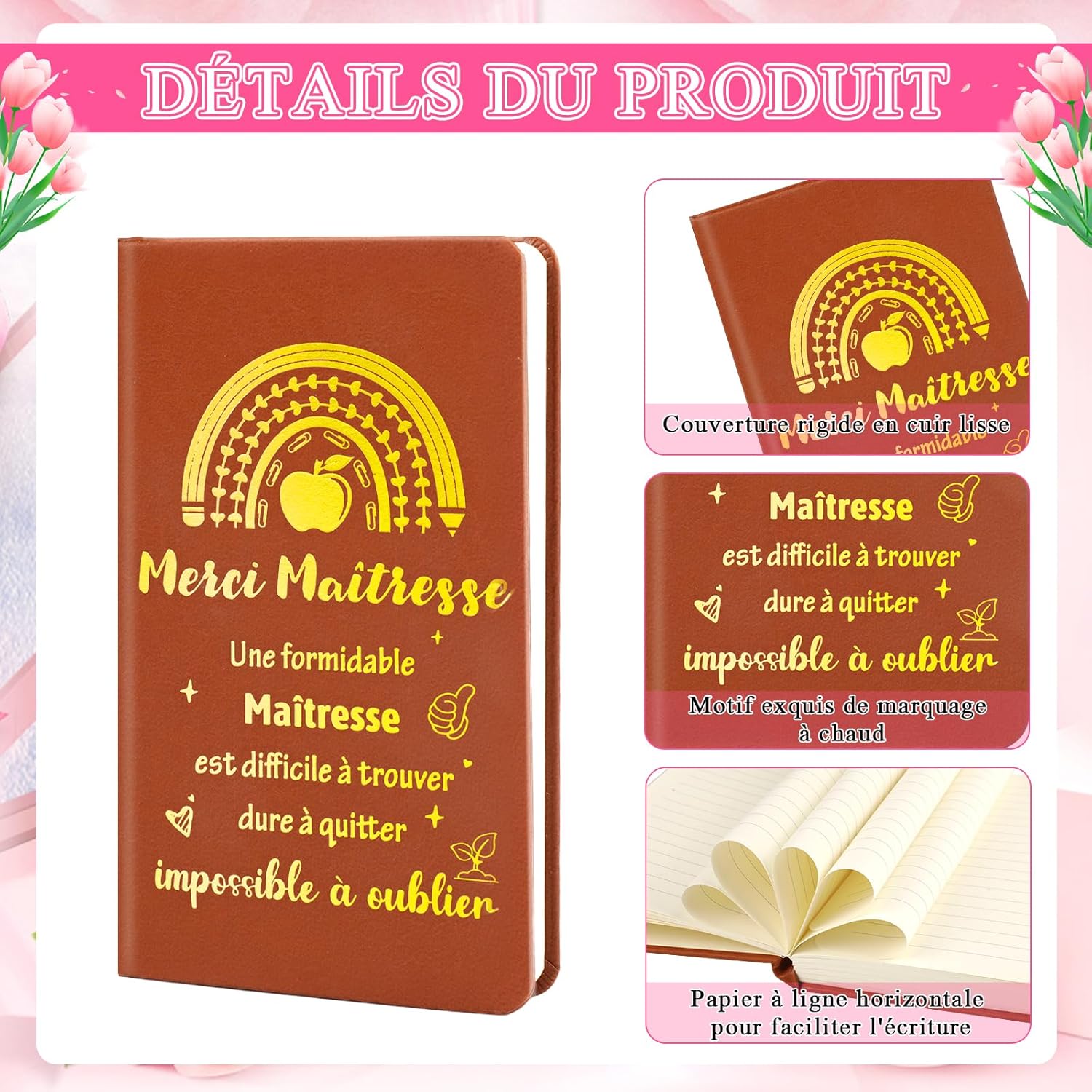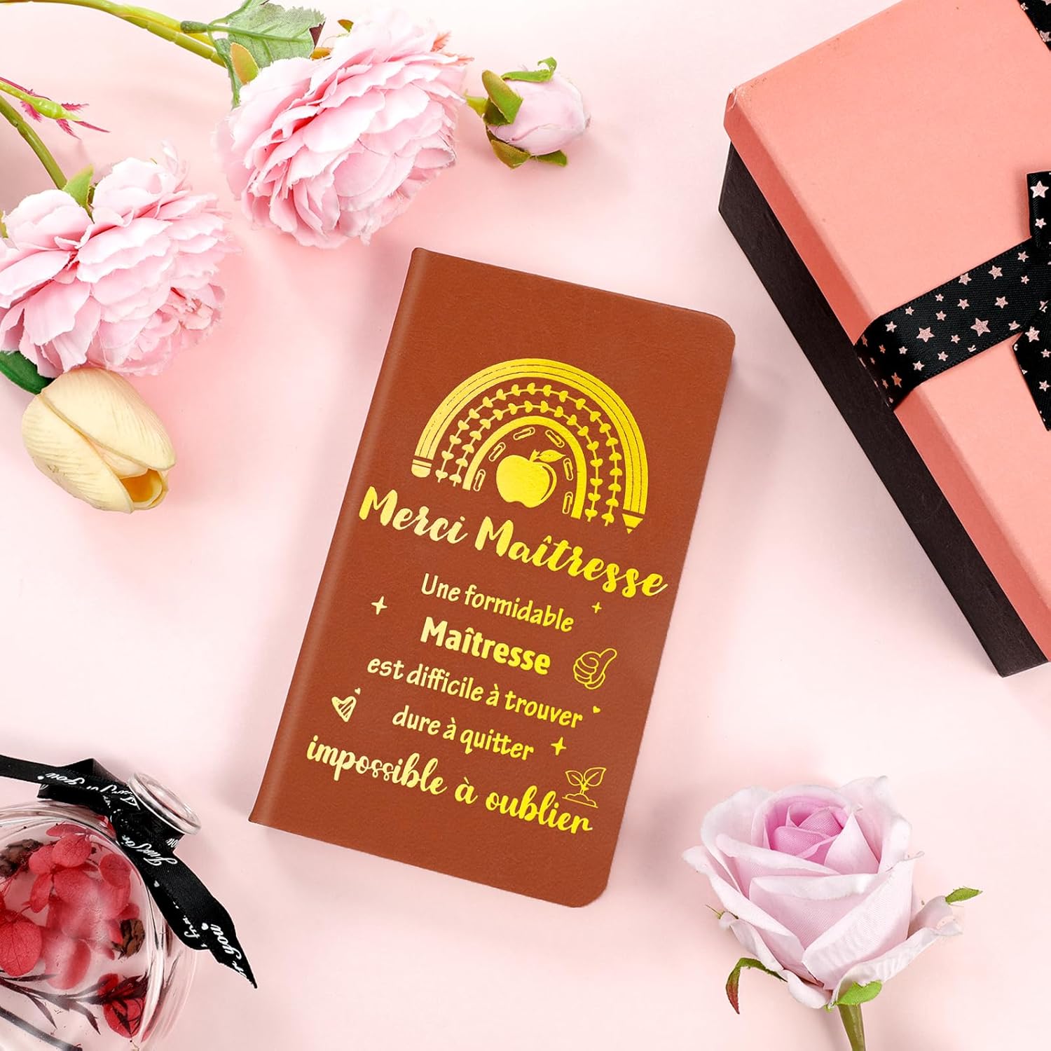 Regalo per insegnanti di scuola: questo set include 1 taccuino per insegnanti, progettato con cura per esprimere gratitudine e apprezzamento per gli insegnanti, rendendolo un set perfetto per la Giornata degli insegnanti, regali di addio o occasioni di apprezzamento degli insegnanti. Progettato per gli insegnanti: il nostro taccuino per insegnanti scolastici presenta una copertina in pelle decorata con disegni in rilievo e parole accorate che esprimono gratitudine agli insegnanti. La goffratura dorata aggiunge un tocco di eleganza al taccuino, rendendolo un accessorio visivamente accattivante e significativo per gli insegnanti. Qualità del prodotto: avvolto in pelle, questo taccuino trasuda raffinatezza e resistenza, garantendo longevità. Le pagine interne sono a righe per prendere appunti organizzati, offrendo una carta di qualità raffinata che garantisce un'esperienza di scrittura fluida e piacevole. Con i suoi 100 fogli (200 pagine), offre un perfetto equilibrio tra bellezza e funzionalità. Regalo Merci Maitresse: che sia per Natale, la fine dell'anno scolastico, un compleanno o semplicemente per mostrare la tua gratitudine, questa scatola versatile è adatta a tutti gli educatori: insegnanti, badanti, presidi scolastici o maestre dell'asilo. Un modo intramontabile e sofisticato per celebrare il proprio impegno quotidiano. Acquista con fiducia: non esitare a contattarci se hai dubbi o domande su School Teacher Gift, ti risponderemo non appena ne verremo a conoscenza. Altri regali per insegnanti di scuola, biglietti di ringraziamento per insegnanti, portachiavi per insegnanti, visita la vetrina Howaf.