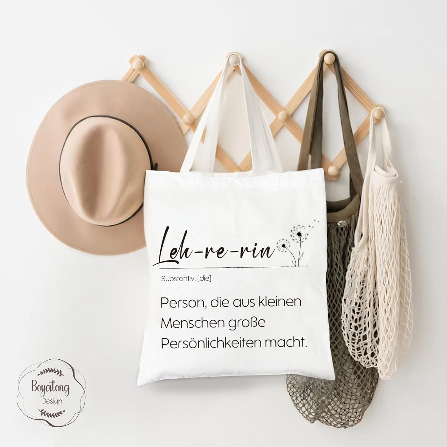 Der Beutel ist sehr schön, um ein Weihnachts- oder Abschiedsgeschenk für eine Lehrerin zu verpacken. Das Material ist schön, die Verarbeitung der Tasche ist ebenfalls sehr gut. Von uns gibt es allerdings einen Punkt Abzug, da auf der Rückseite der Tasche zwei stilisierte Pusteblumen abgebildet sind. Wir kennen diese Symbolik eher aus der Trauerarbeit und nicht als Symbol für "Wachsen" und "Gedeihen" oder "Bildung erfahren", aber das ist vermutlich Geschmackssache.