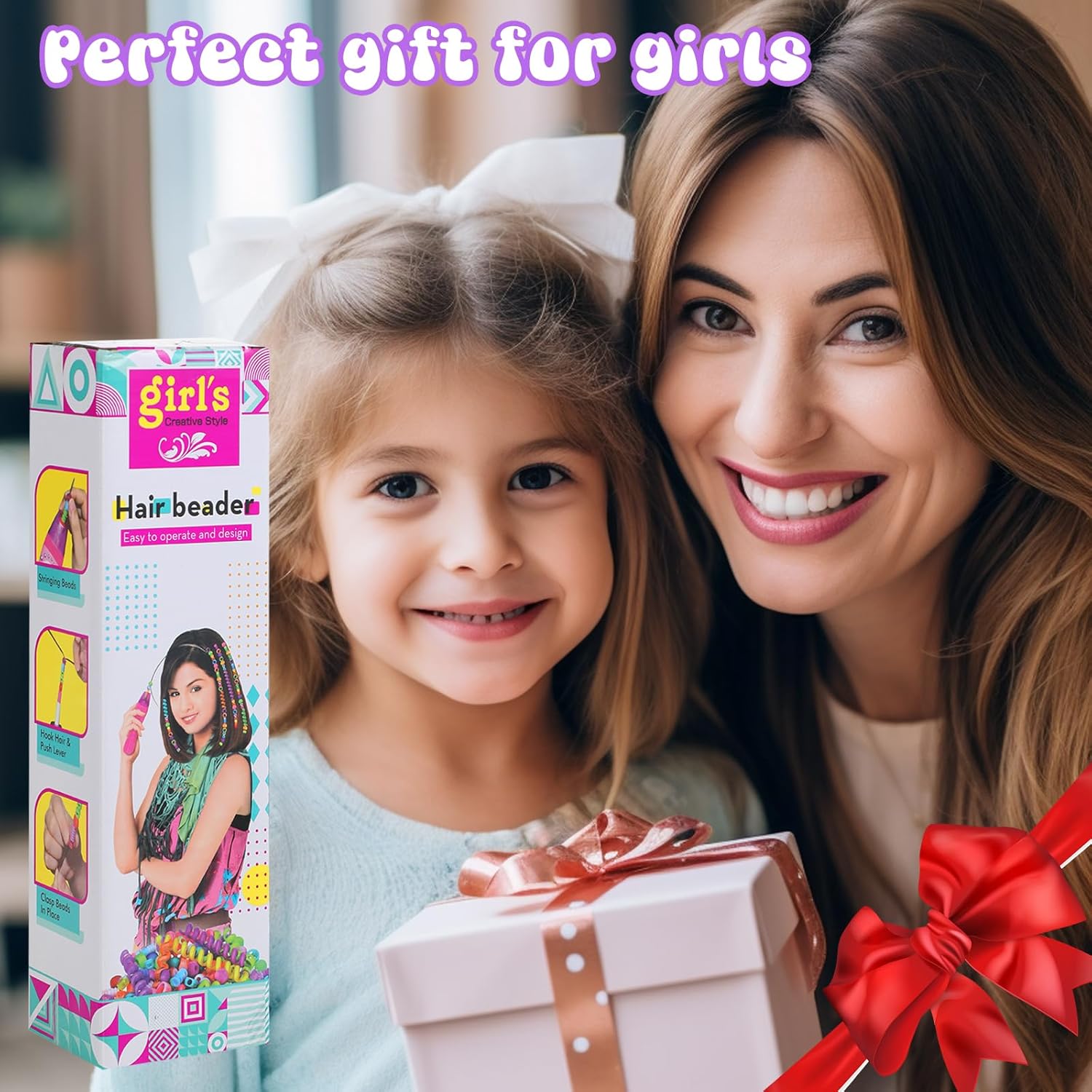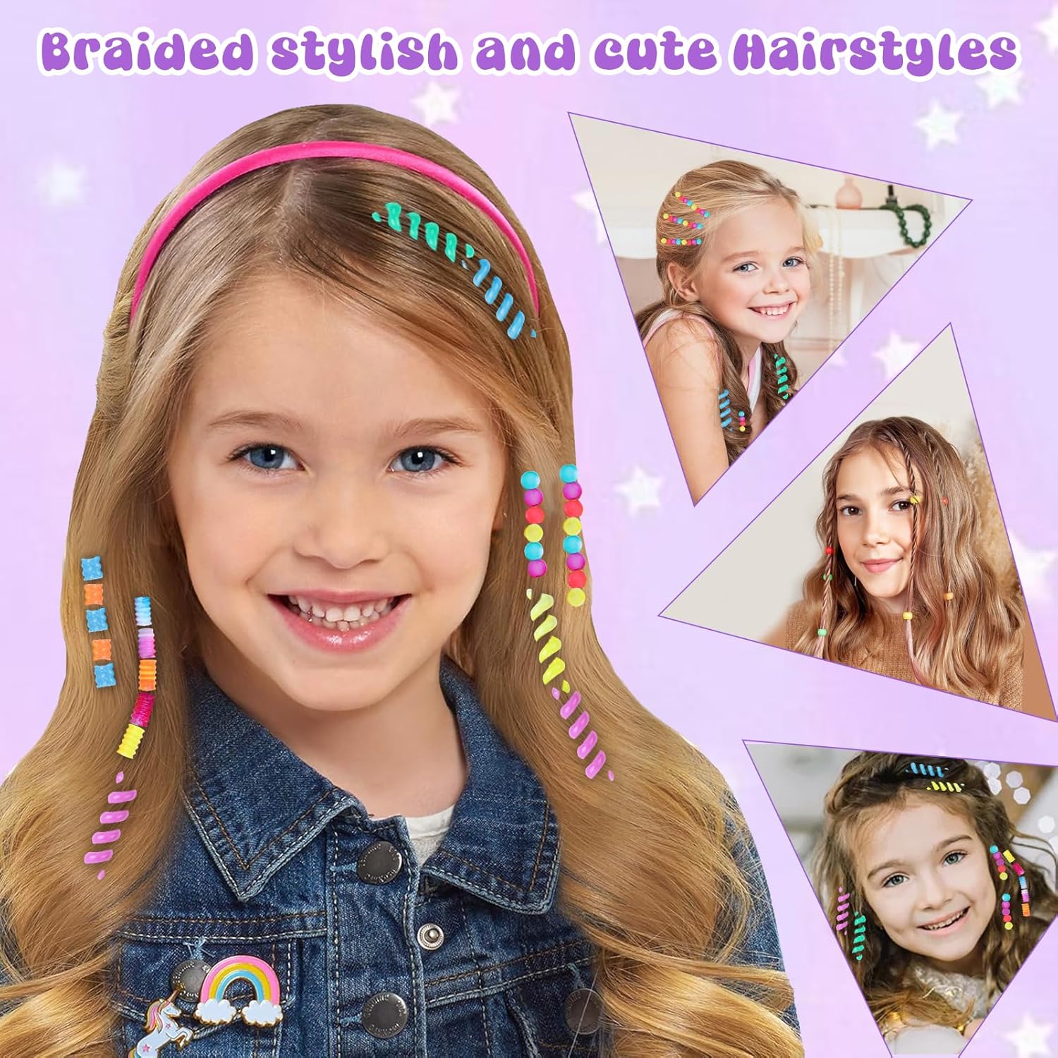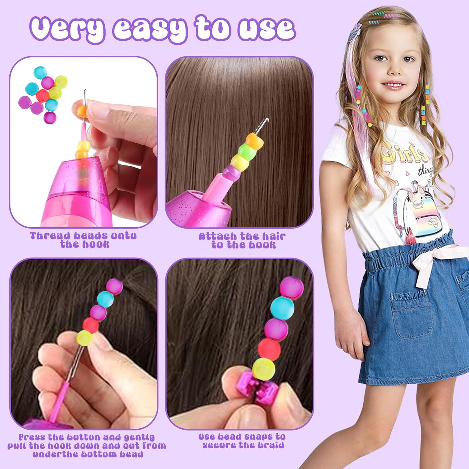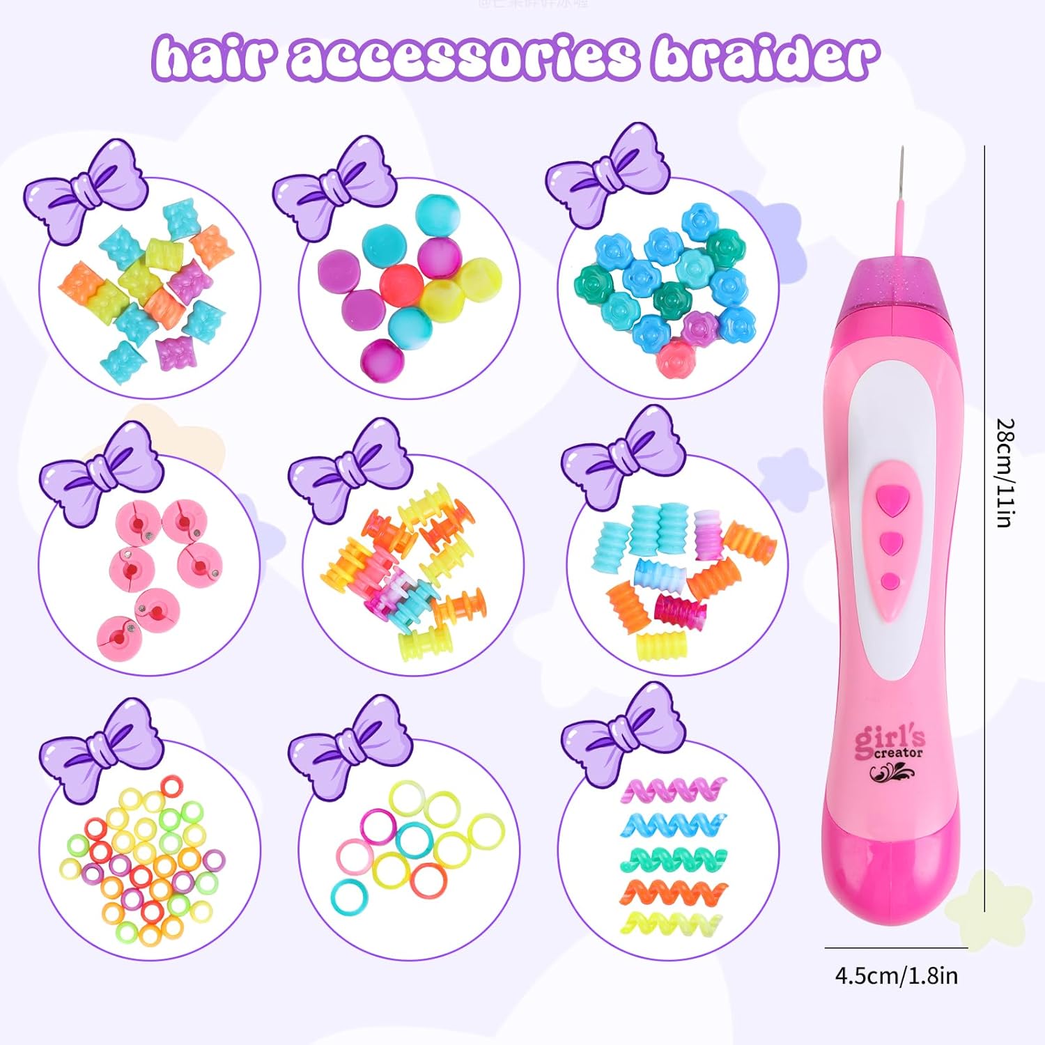 Accessori per capelli per ragazze - Questo set di accessori per capelli include una treccia per capelli, perline colorate e un pettine. Le ragazze possono combinare le perline secondo le proprie preferenze per creare acconciature bellissime e individuali. Giocattolo per bambine dai 5 anni in su - Il set per trecciare i capelli è ideale per feste e travestimenti. Aiuta a sviluppare il pensiero creativo, l'abbinamento dei colori e le abilità estetiche e promuove l'abilità artistica delle ragazze. REGALO PERFETTO PER LE RAGAZZE - Le perline per capelli delle ragazze in diversi colori consentono alle ragazze di modellare le proprie acconciature secondo le proprie idee. Ciò dà ai bambini una sensazione di soddisfazione e realizzazione. Macchina per intrecciare i capelli per bambini - Questa macchina per intrecciare i capelli per bambini è adatta per capelli lisci o ricci ed è lo strumento perfetto per capelli medi o lunghi. Le ragazze possono variare le loro acconciature quotidiane a seconda del loro outfit e del tema. Facile da usare: con la macchina per intrecciare i capelli, i bambini possono indossare rapidamente le perline. Infilare le perline sull'uncinetto, lasciando spazio per i capelli, premere il bottone, fissare la perlina e fissare la treccia con un elastico o bottoni di perle.