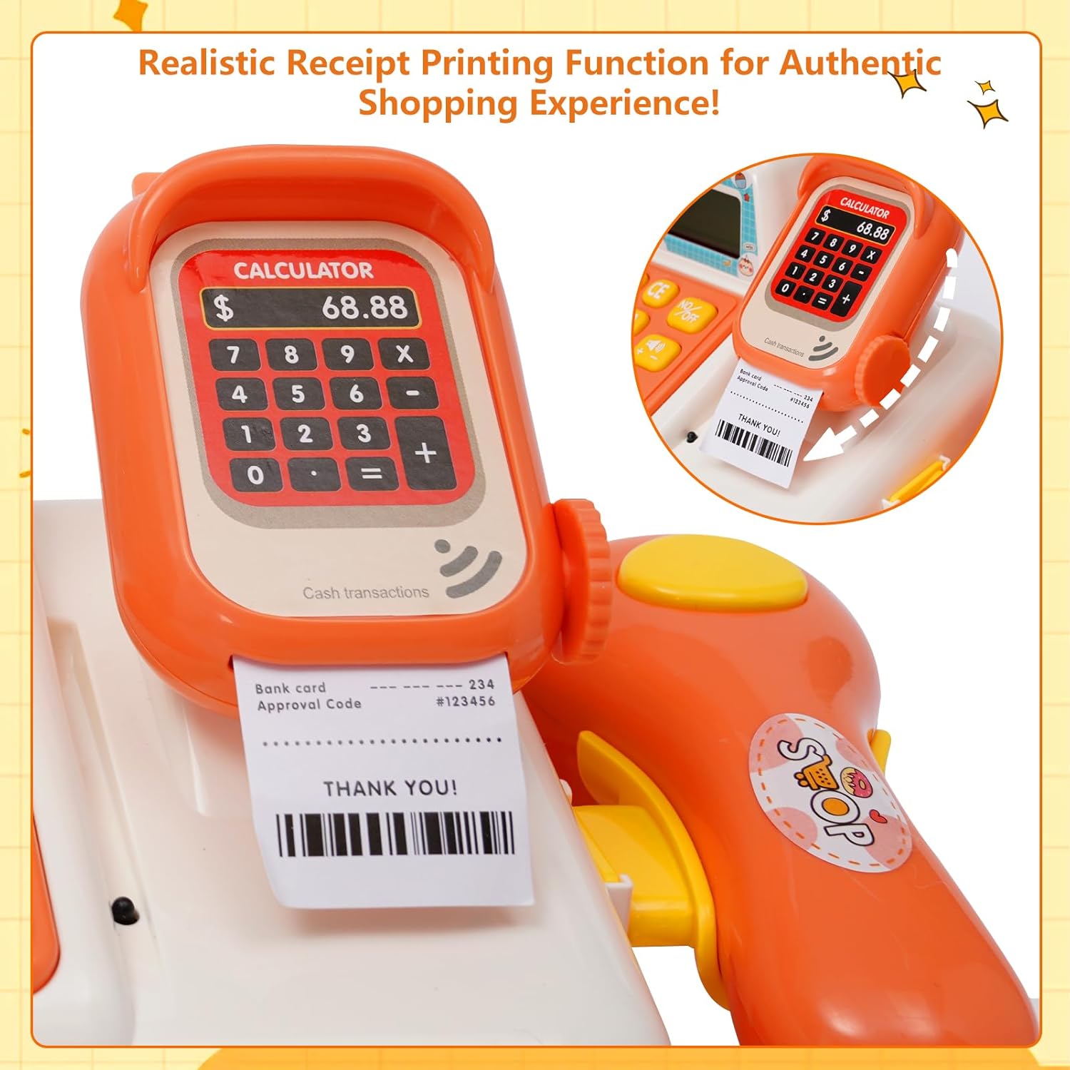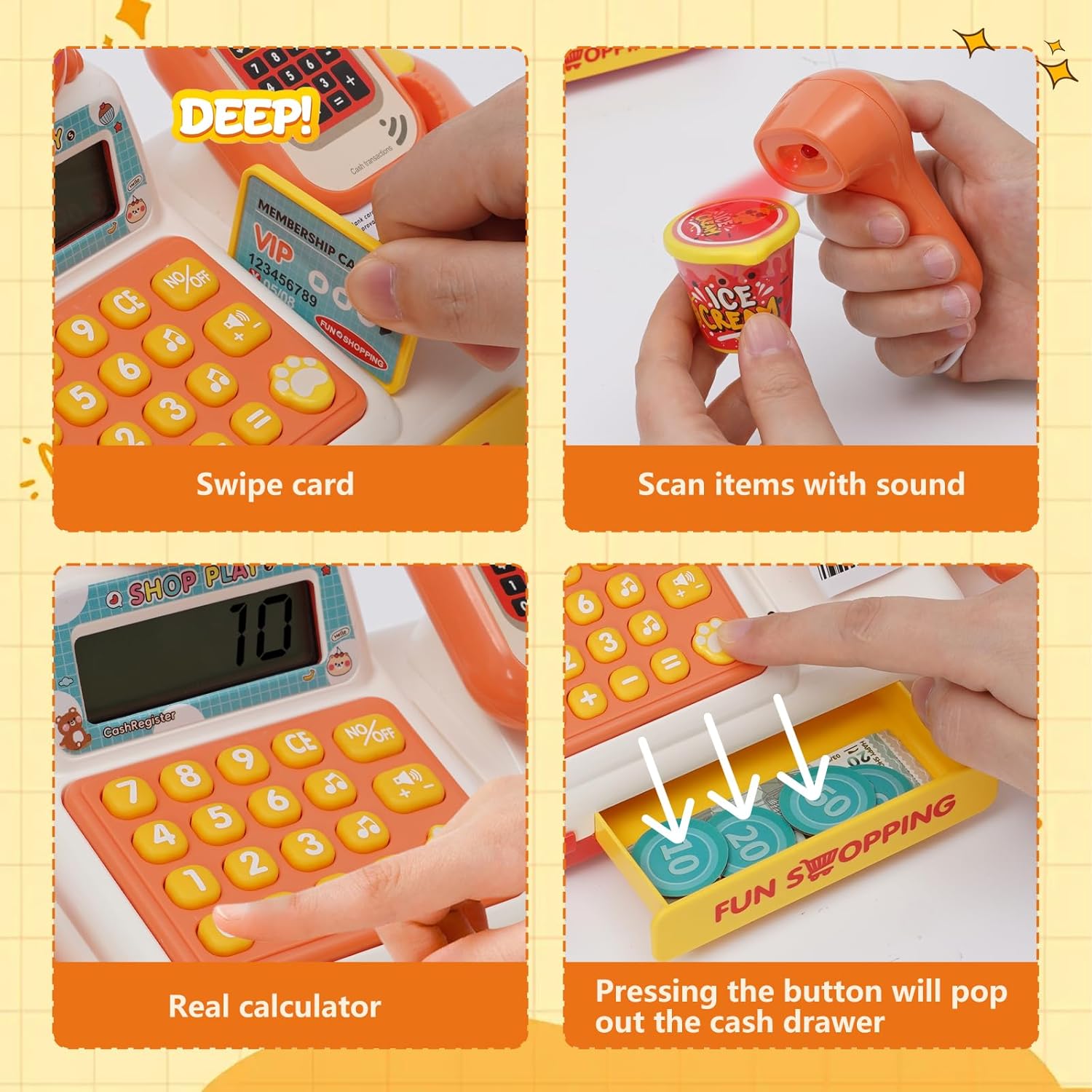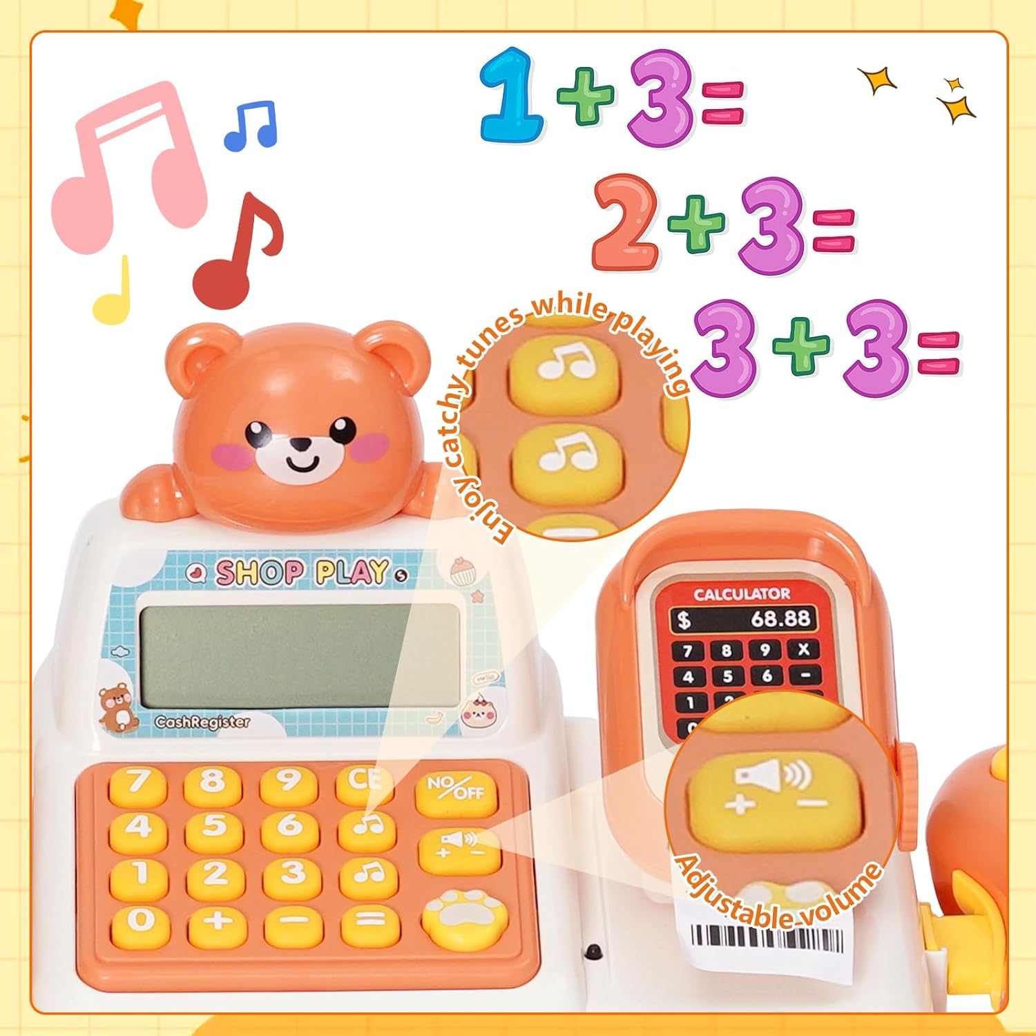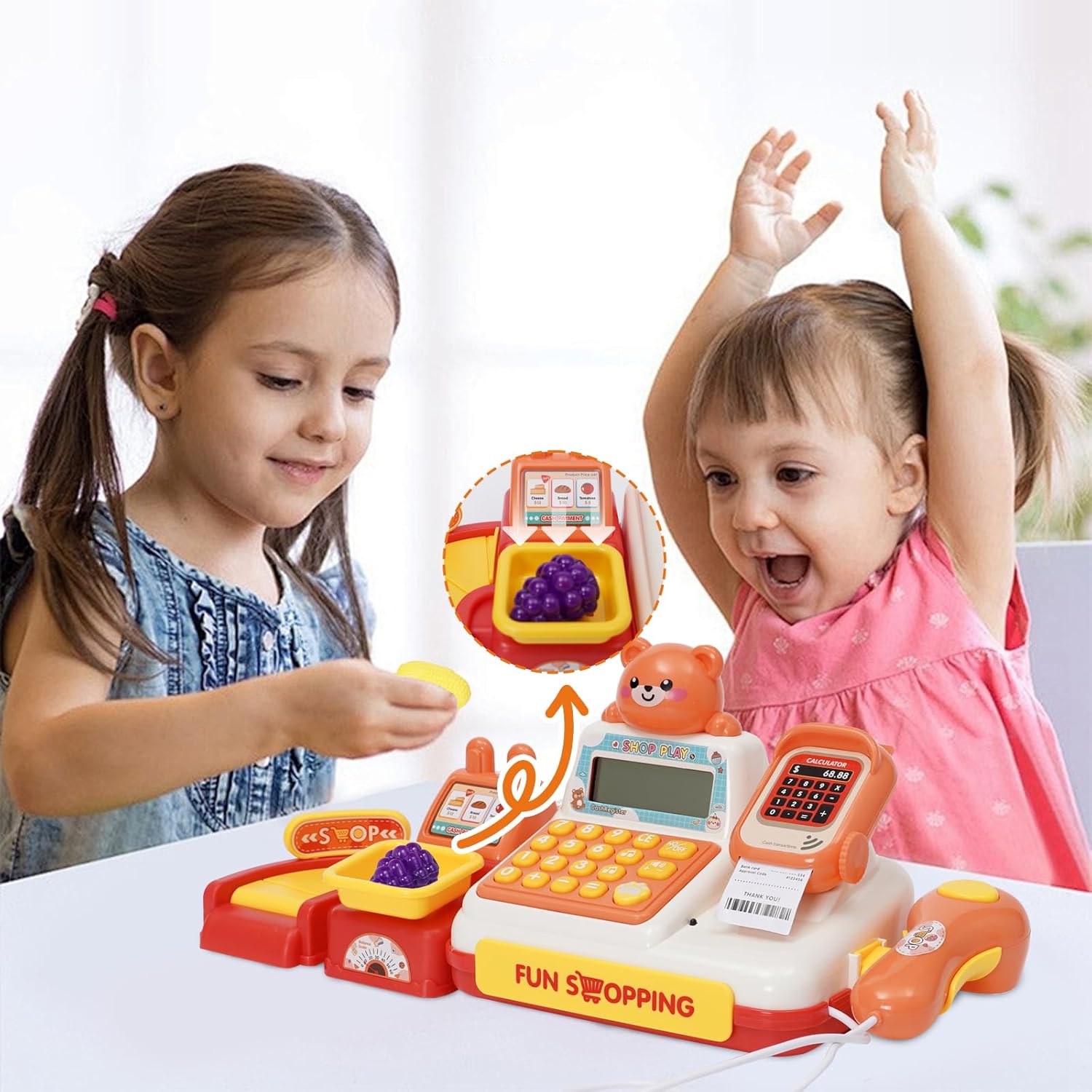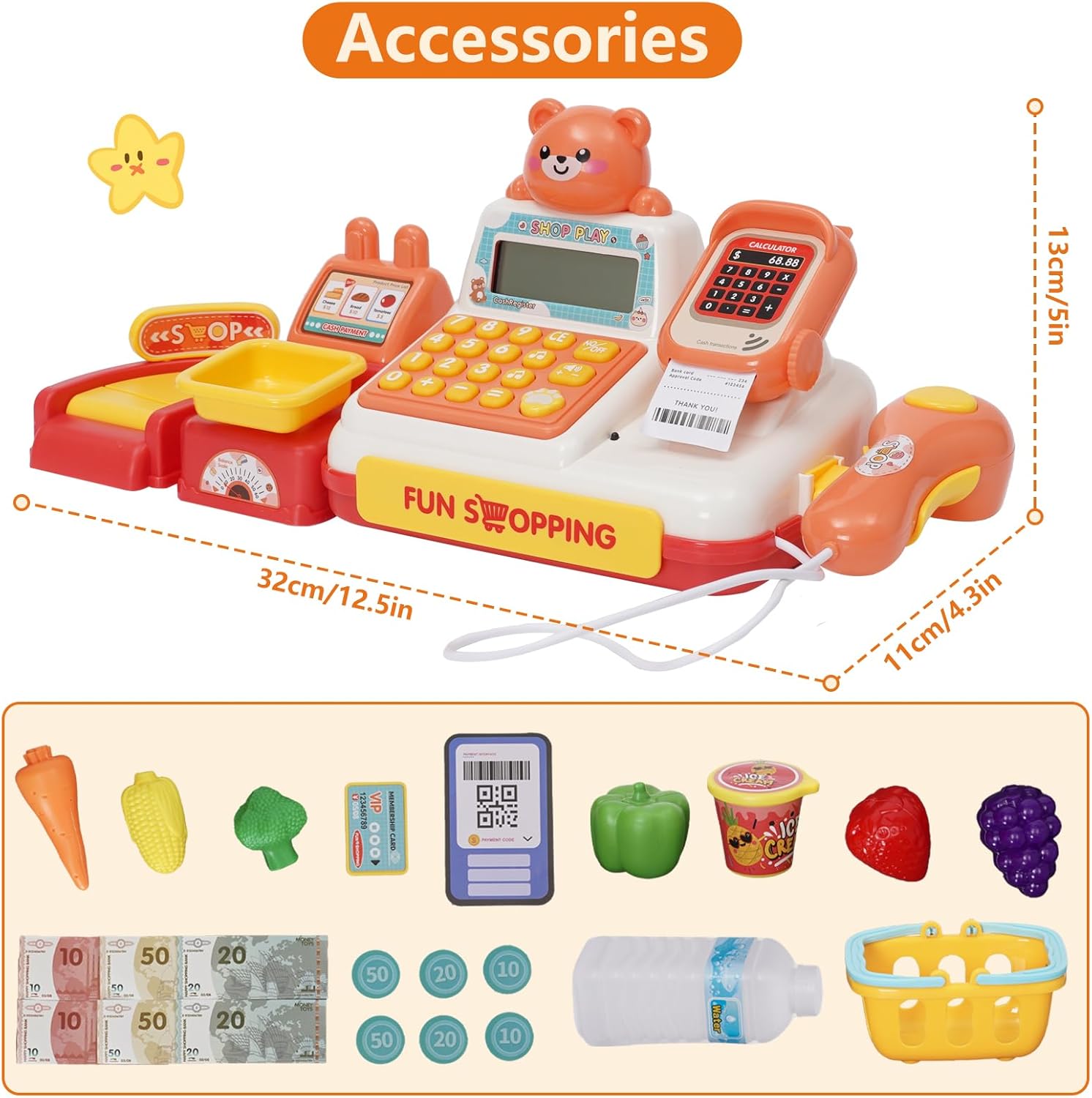 Gioco del registratore di cassa giocattolo: grazie alla loro funzione realistica, i registratori di cassa giocattolo incoraggiano l'uso della matematica e del denaro e promuovono l'immaginazione. Gioca con i tuoi figli a giochi di ruolo sullo shopping e sul pagamento, trascorri del tempo di qualità con la famiglia e rafforza la tua relazione. Paga, scansiona, pesa, stampa ricevute e ALTRO: questo set di registratori di cassa giocattolo offre funzioni molto vicine a quelle di un vero registratore di cassa. 4 verdure, 2 frutta, gelato, acqua, carrello, soldi finti, carta di credito e 6 monete speciali. Paga con la tua carta o monete. Un dolce suono risuona ogni volta che fai scorrere la carta, apri il cassetto o scannerizzi i dolcetti. Due pulsanti sulla calcolatrice consentono la riproduzione musicale: semplicemente geniale! Giocattoli interattivi e di sviluppo: i bambini possono giocare con amici o genitori, migliorare le loro capacità comunicative ed evitare di restare soli con i dispositivi elettronici. I bambini sviluppano anche le loro capacità cognitive, la coordinazione occhio-mano, le capacità di risoluzione dei problemi e l'immaginazione. Durevole: realizzato in materiale ABS di alta qualità, concentrato sulla sicurezza dei bambini. Grazie ai bordi senza sbavature e alla plastica robusta, questo registratore di cassa giocattolo educativo può resistere all'uso quotidiano. GRANDE REGALO PER IL PRIMO SVILUPPO EDUCATIVO: questo registratore di cassa giocattolo STEM è un regalo ideale per bambini, ragazzi, ragazze e bambini in età prescolare durante vacanze, compleanni, feste o festival (Pasqua, Natale, Halloween, Ringraziamento e Capodanno). I bambini adoreranno questo registratore di cassa con i suoi colori vivaci e il simpatico motivo a orsetti.