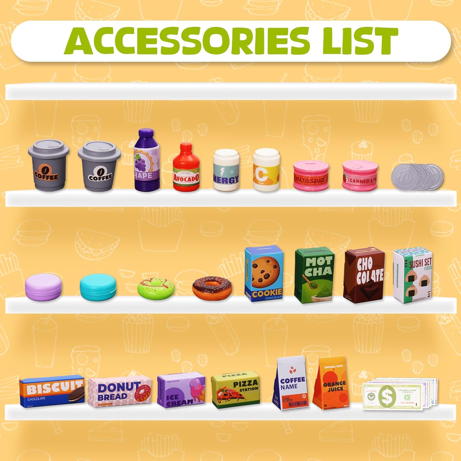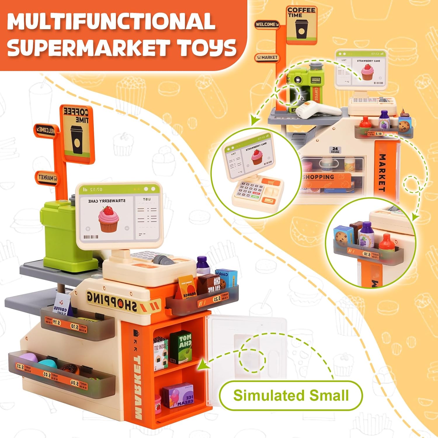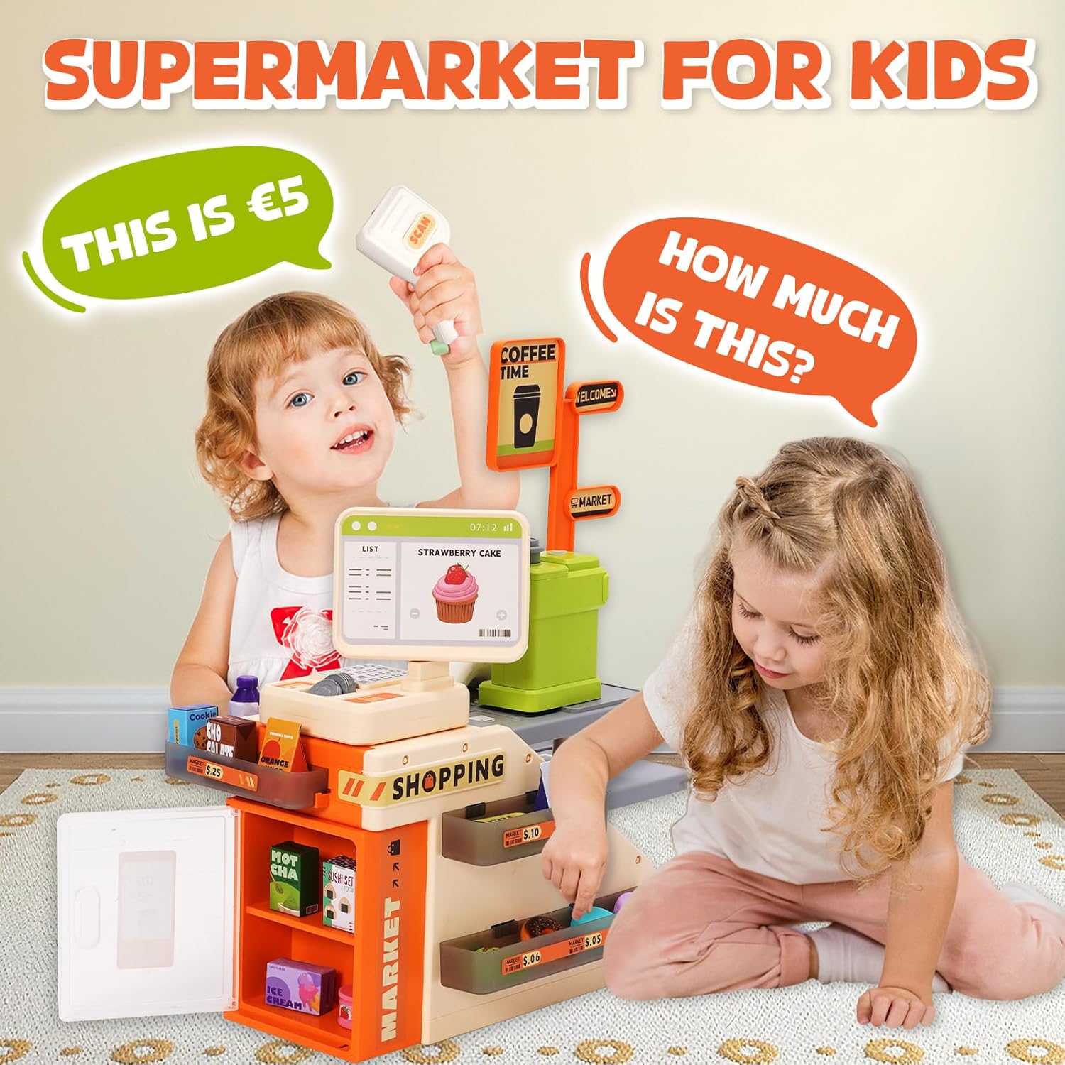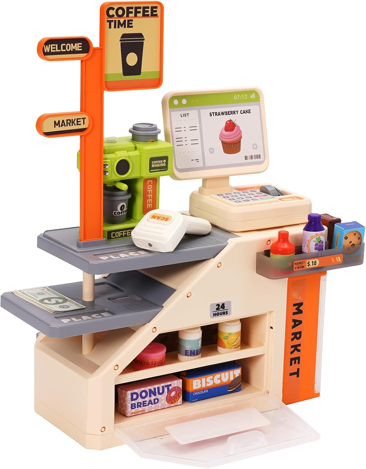 Registratore di cassa giocattolo per bambini: il registratore di cassa per bambini combina registratore di cassa, macchina per il caffè e frigorifero, offre una vera esperienza di acquisto e simula scene di shopping reali. Permette ai bambini di sperimentare il piacere dello shopping, arricchire le proprie conoscenze quotidiane e allenare le proprie abilità pratiche e sociali. Con questo registratore di cassa giocattolo per bambini, i bambini potranno rievocare lo shopping e giocare di ruolo con amici e familiari. Set di giocattoli per giochi di ruolo da 46 pezzi: il registratore di cassa include 46 accessori, include uno scanner, macchine da caffè, registratori di cassa e altri accessori, valuta del gioco (contanti e monete) e altri alimenti (sushi, bevande, caffè, ecc.). Offre ai bambini tutto ciò di cui hanno bisogno per il gioco fantasioso e il divertimento. Registratore di cassa per bambini: questo registratore di cassa giocattolo è dotato di uno scanner con luci ed effetti sonori realistici. Una volta che il cassiere ha scansionato un codice a barre, lo scanner si illumina ed emette un segnale acustico. Con il registratore di cassa giocattolo i bambini possono simulare giocosamente le transazioni come in un vero supermercato e comprendere così meglio il buon senso. Gioco di ruolo al supermercato: i bambini possono giocare con gli amici o i genitori, liberare la loro immaginazione e migliorare le capacità sociali e motorie. I giochi di ruolo aiutano a sviluppare la comunicazione e le abilità pratiche dei bambini distraendoli dai dispositivi elettronici. Giocattoli per bambini: questo registratore di cassa per bambini è realizzato in resistente plastica ABS con bordi lisci e senza sbavature, garantendo sicurezza durante il gioco. È un regalo di Natale per bambini dai 3 anni in su, che può migliorare le capacità di gestione, organizzazione e conservazione dei fondi dei bambini