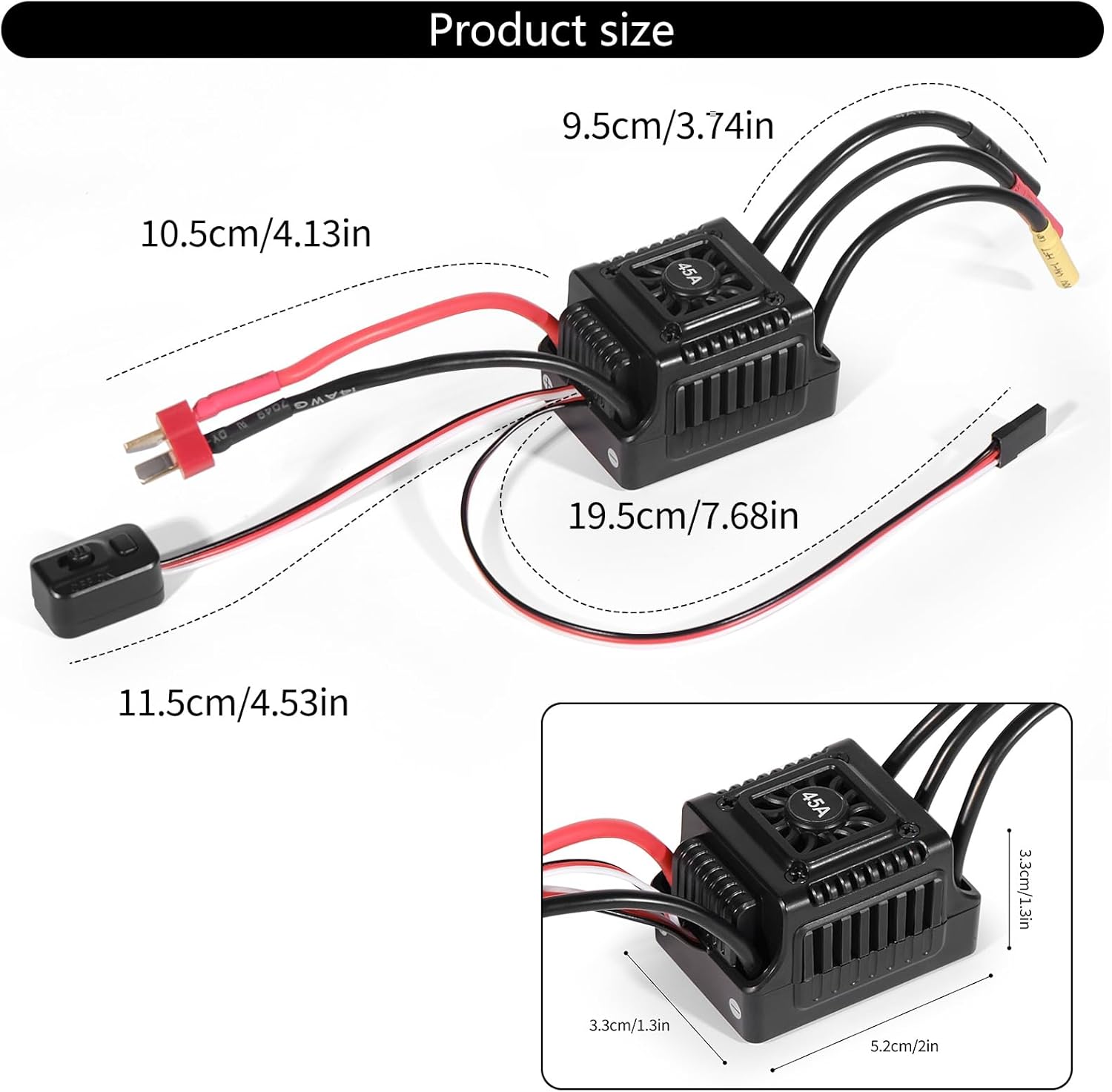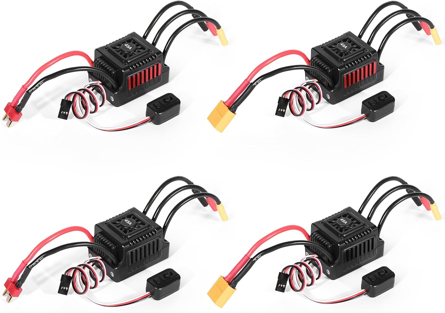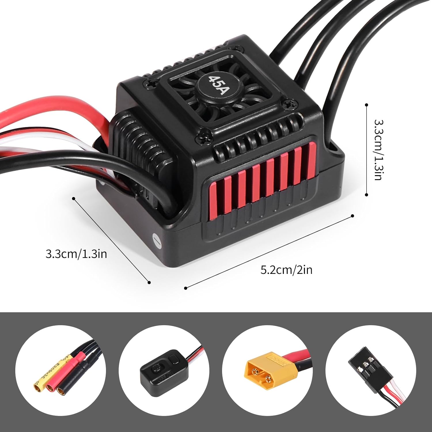 Impermeabile, adatto per ambienti umidi e sport all'aria aperta, offre un ampio scenario applicativo, regolatore di velocità elettronico senza sensori e senza spazzole. Semplifica la fase di installazione, riduce la difficoltà di funzionamento; con connettori XT60/T, convenienti per il collegamento e lo smontaggio rapidi, migliorano la comodità dell'utente Capacità di carico fino a WSDT 45A, adatta per la maggior parte delle auto elettriche, quadricotteri e altri modelli. Una resistenza interna piuttosto bassa migliora l'efficienza, riduce la generazione di calore e prolunga la durata. Varie funzioni di protezione, come protezione da sovracorrente, surriscaldamento, bassa tensione, per proteggere l'apparecchiatura e la batteria.