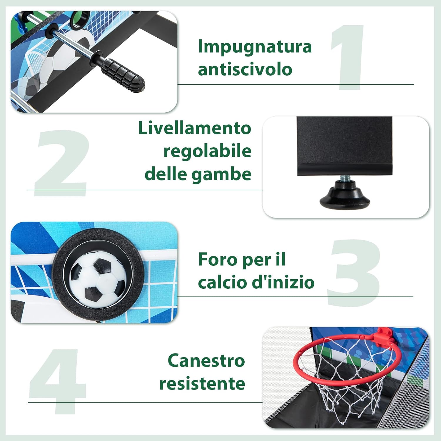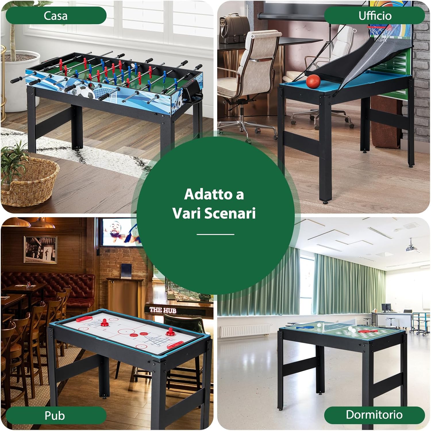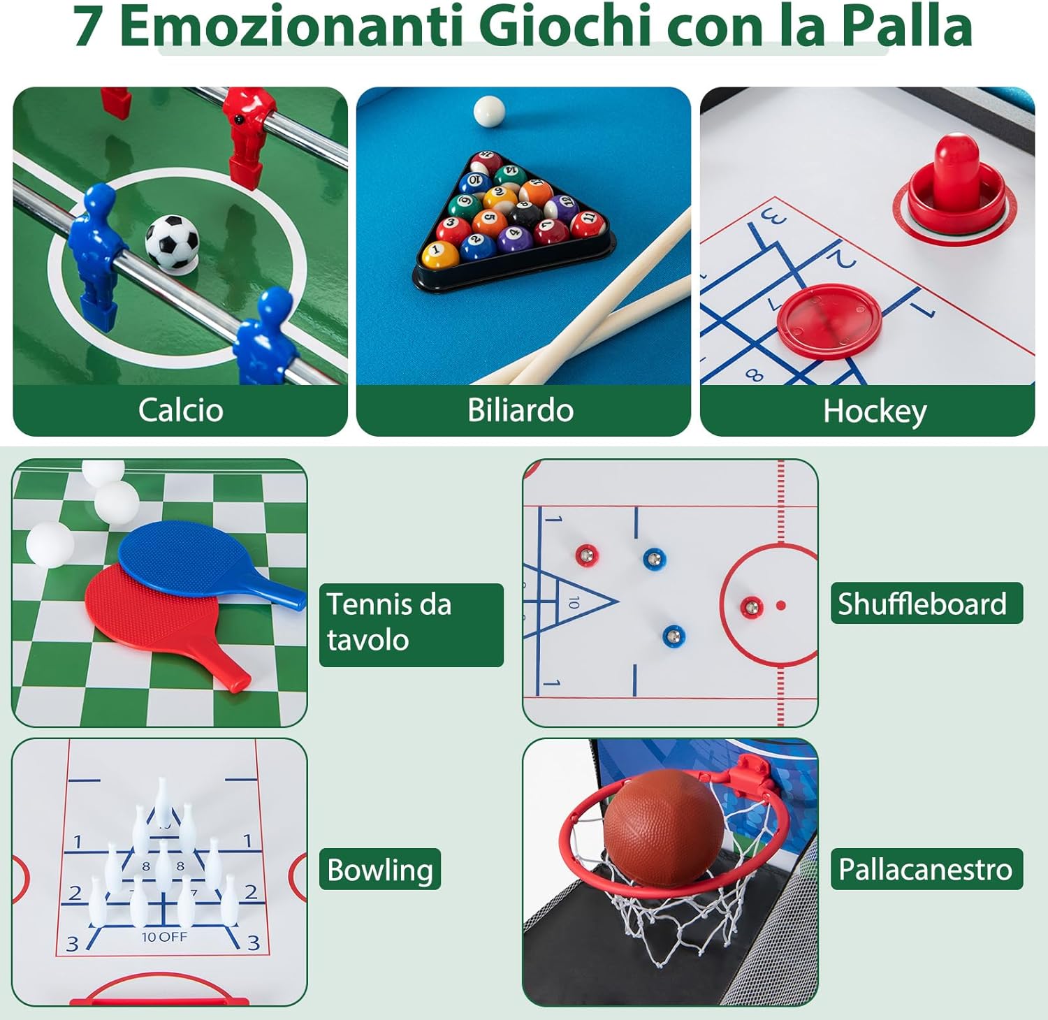 ★Tavolo Multigioco 14-in-1★ Con 7 emozionanti giochi con la palla, 5 giochi da tavolo e 2 giochi di lancio, tra cui calcetto, hockey, biliardo, ping pong, bowling, shuffleboard, scacchi, backgammon, dama, poker & dadi, lancio dell'anello, ferri di cavallo, basket e tris. Questo set da tavolo 14-in-1 ti offrirà sicuramente un divertimento senza fine. ★Adatto a Diverse Situazioni★ Questo tavolo multigioco è perfetto per qualsiasi ambiente, che sia casa, bar, ufficio o ristorante. Porta il divertimento con te ovunque vai e offri una vasta gamma di opzioni di gioco che intratterranno tutta la famiglia. ★Design Facilmente Impilabile★ Il design impilabile geniale di questo set da gioco risparmia spazio prezioso. Basta impilare tutti i piani del tavolo quando non sono in uso, facilitando il passaggio tra le diverse superfici di gioco e garantendo una conservazione senza problemi. ★Materiale Resistente e Struttura Robusta★ Realizzato in materiale MDF di alta qualità e supportato da gambe robuste, questo set da tavolo è costruito per durare. Il robusto canestro da basket e i piedini regolabili forniscono stabilità e durata aggiuntive. ★Dettagli Ancora più Pensati★ Questo set da gioco 14-in-1 va oltre con comodi segnapunti per tenere traccia dei tuoi giochi, impugnature antiscivolo e un foro di partenza per un miglior controllo della palla. Inoltre, è dotato di giocatori ben realizzati e motivi a tema calcio che offrono un'esperienza di gioco realistica.