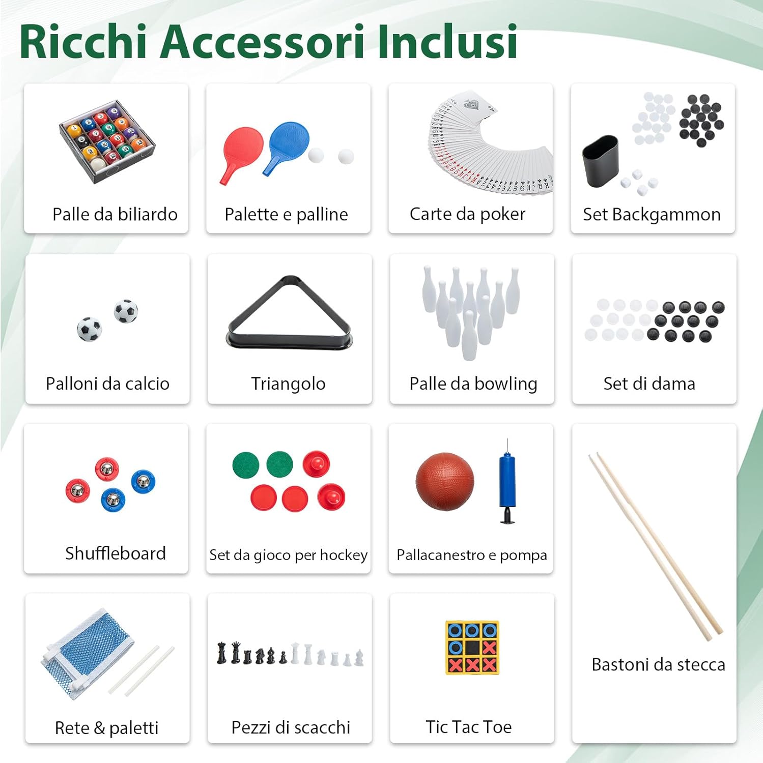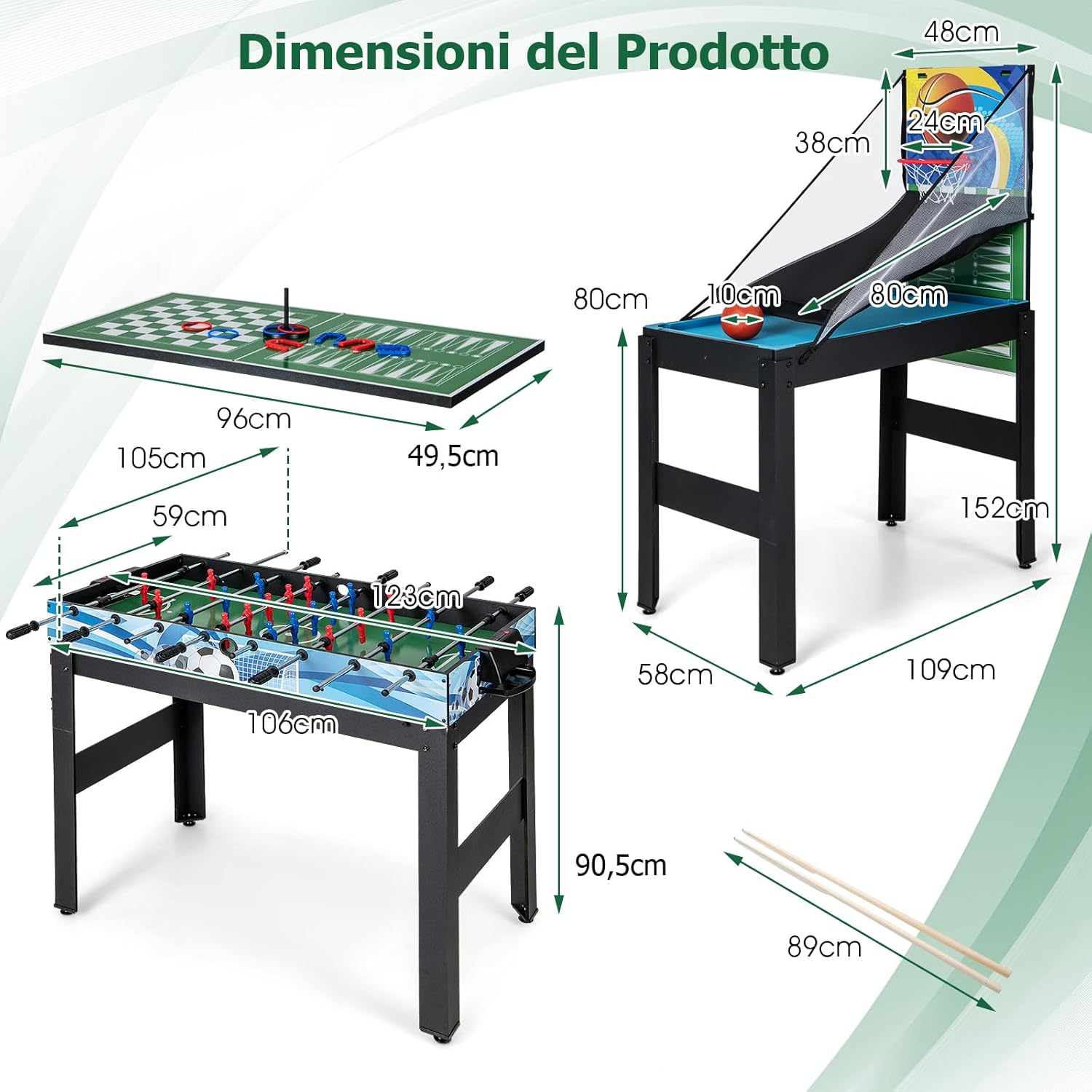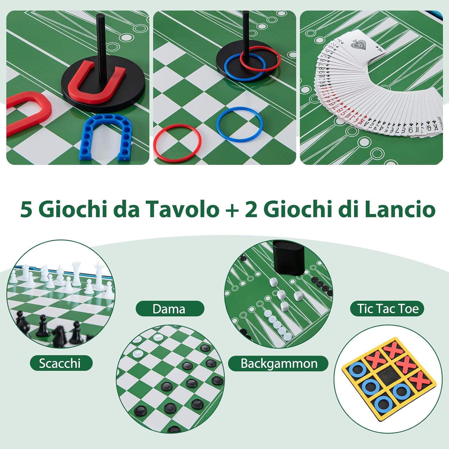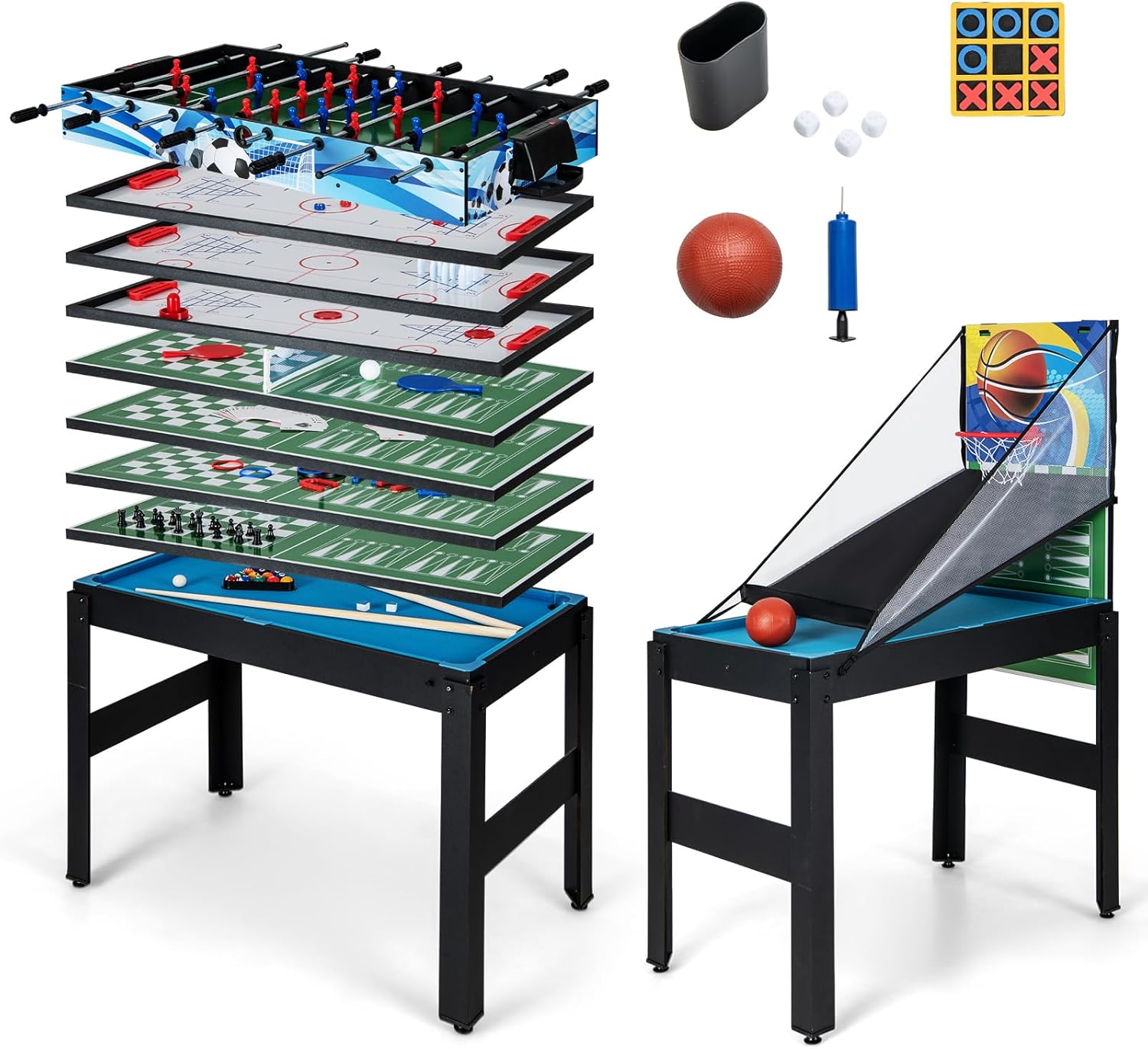 ★Tavolo Multigioco 14-in-1★ Con 7 emozionanti giochi con la palla, 5 giochi da tavolo e 2 giochi di lancio, tra cui calcetto, hockey, biliardo, ping pong, bowling, shuffleboard, scacchi, backgammon, dama, poker & dadi, lancio dell'anello, ferri di cavallo, basket e tris. Questo set da tavolo 14-in-1 ti offrirà sicuramente un divertimento senza fine. ★Adatto a Diverse Situazioni★ Questo tavolo multigioco è perfetto per qualsiasi ambiente, che sia casa, bar, ufficio o ristorante. Porta il divertimento con te ovunque vai e offri una vasta gamma di opzioni di gioco che intratterranno tutta la famiglia. ★Design Facilmente Impilabile★ Il design impilabile geniale di questo set da gioco risparmia spazio prezioso. Basta impilare tutti i piani del tavolo quando non sono in uso, facilitando il passaggio tra le diverse superfici di gioco e garantendo una conservazione senza problemi. ★Materiale Resistente e Struttura Robusta★ Realizzato in materiale MDF di alta qualità e supportato da gambe robuste, questo set da tavolo è costruito per durare. Il robusto canestro da basket e i piedini regolabili forniscono stabilità e durata aggiuntive. ★Dettagli Ancora più Pensati★ Questo set da gioco 14-in-1 va oltre con comodi segnapunti per tenere traccia dei tuoi giochi, impugnature antiscivolo e un foro di partenza per un miglior controllo della palla. Inoltre, è dotato di giocatori ben realizzati e motivi a tema calcio che offrono un'esperienza di gioco realistica.