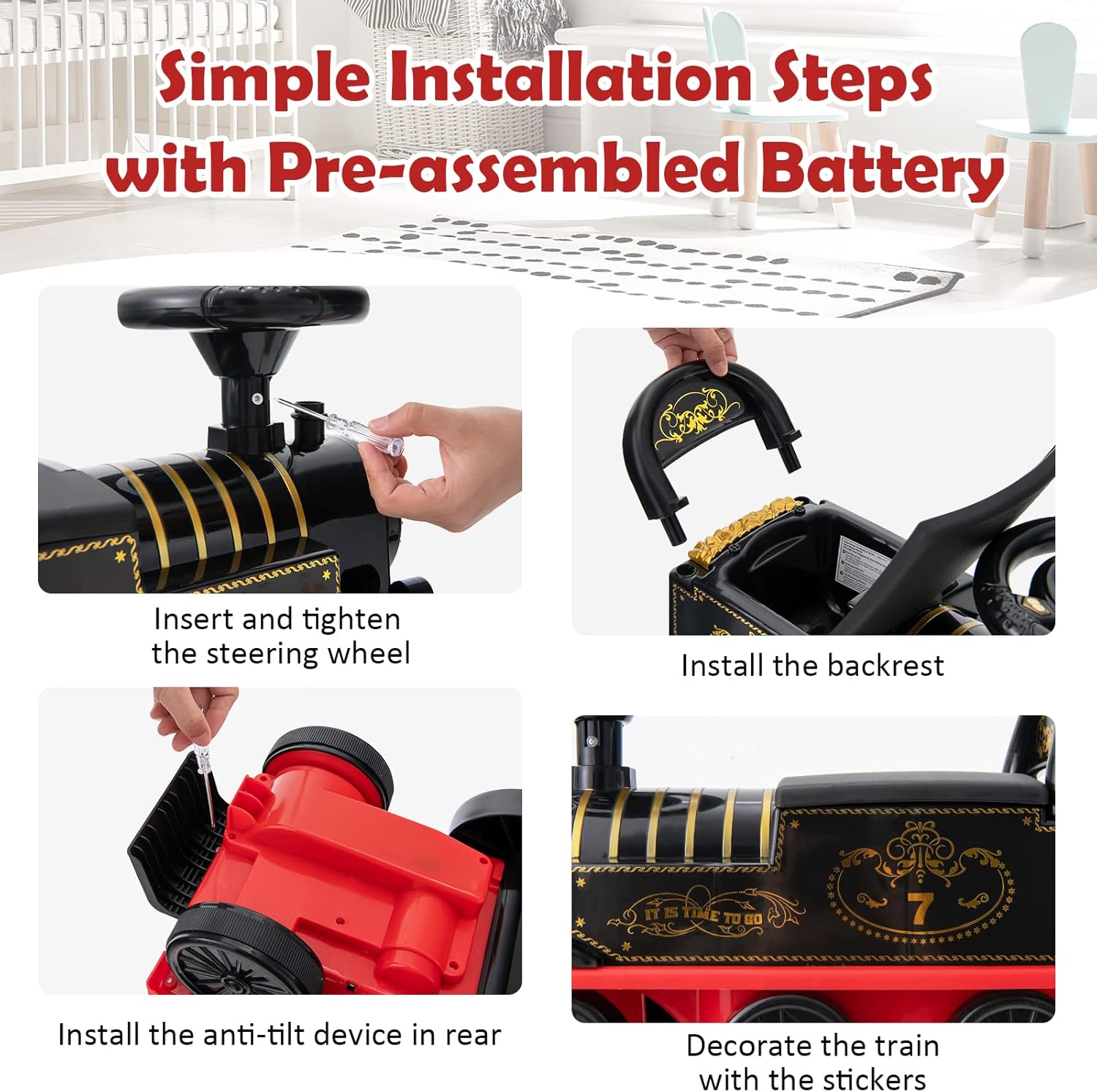 ★Doppia Modalità di Guida-Su Rotaia e a Terra★Questo trenino elettrico per bambini, con il suo design ispirato ai treni, include un binario circolare del diametro di 220 cm. Il bambino può guidare in totale sicurezza all'interno del percorso prestabilito, ideale per i più piccoli. Allo stesso tempo, il trenino può essere utilizzato liberamente sul pavimento di casa. ★ Volante +2 pulsanti intuitivi★ ✓ Pulsante sinistro: attiva l'autentico fischio del treno con allegre luci colorate e musica ✓ Pulsante destro: regola il movimento (premi per partire, rilascia per fermare) Tasto melody integrato per riprodore simpatiche canzoncine con luci danzanti ★ Binari Modulari & Gioco Realistico★ Comprende 16 sezioni di binari facili da assemblare per:✓ Corse libere su qualsiasi superficie liscia ✓ Avvincenti percorsi su rotaie come un vero trenino. Pedane ergonomiche regolabili per il massimo comfort dei piccoli piloti ★ Sicurezza Rafforzata a 6 Ruote★ ✓ Straordinaria stabilità su ogni terreno ✓ Durata nel tempo ✓ Schienale protettivo anti-caduta ✓ Stabilizzatore posteriore anti-ribaltamento ✓ Gomme speciali antiscivolo per ogni superficie ★ Portaoggetti Nascosto & Design Festoso★ Comodo ripostiglio segreto sotto la seduta per: ✓ Conservare i giocattoli preferiti ✓ Trasportare i tesori dei bambini Stile allegro e colorato, ideale per: ✓ Regali di Natale ✓ Feste di compleanno ✓ Occasioni speciali ★ Montaggio Rapido & Divertimento in Famiglia★ Pronto in pochi semplici passi:Fissa il volante/Monta lo schienale/Applica lo stabilizzatore. Inclusi adesivi decorativi per:✓ Personalizzare insieme il trenino ✓ Stimolare la creatività dei bambini.