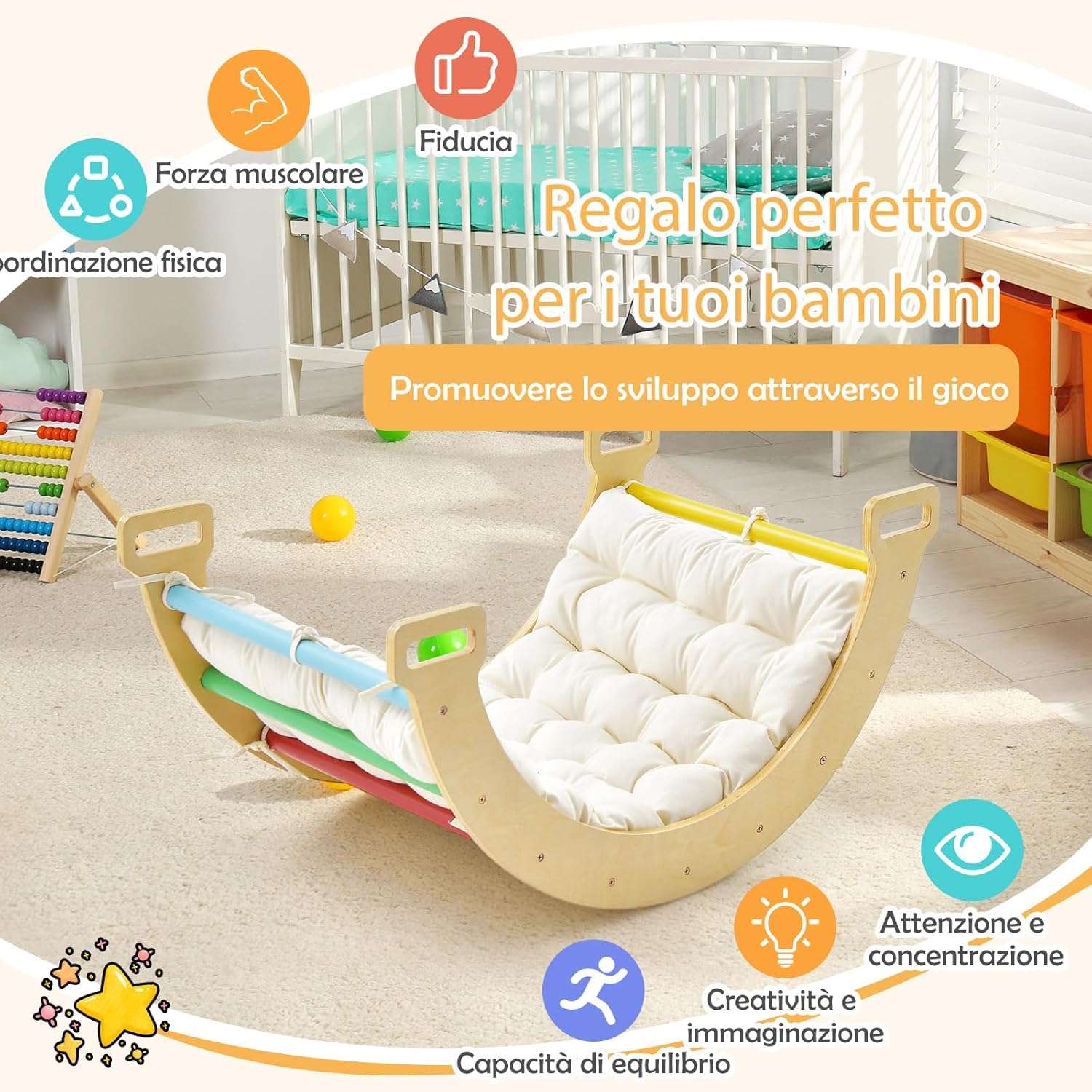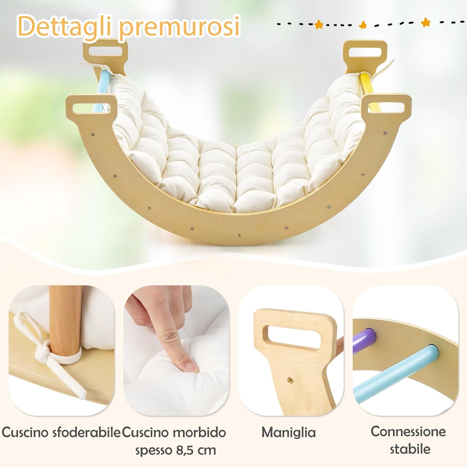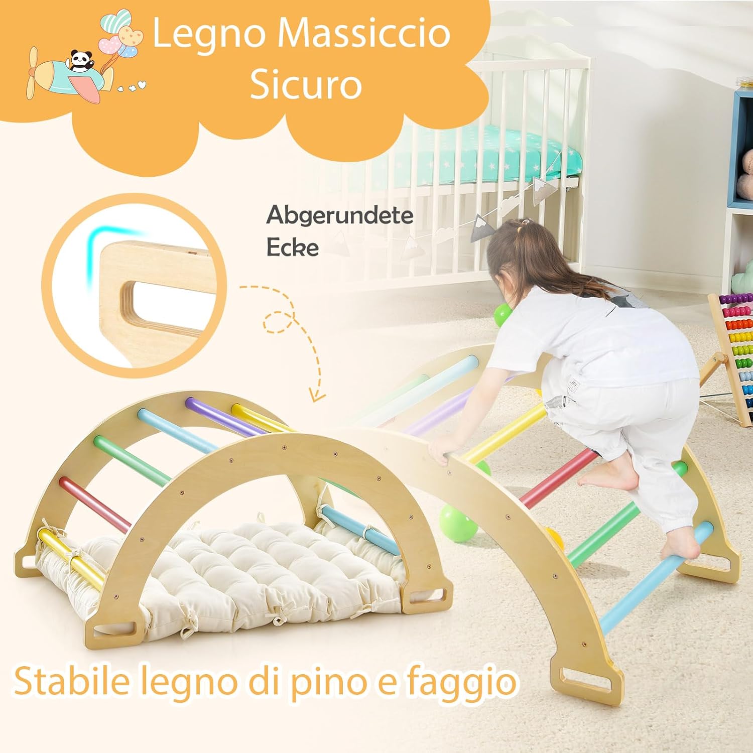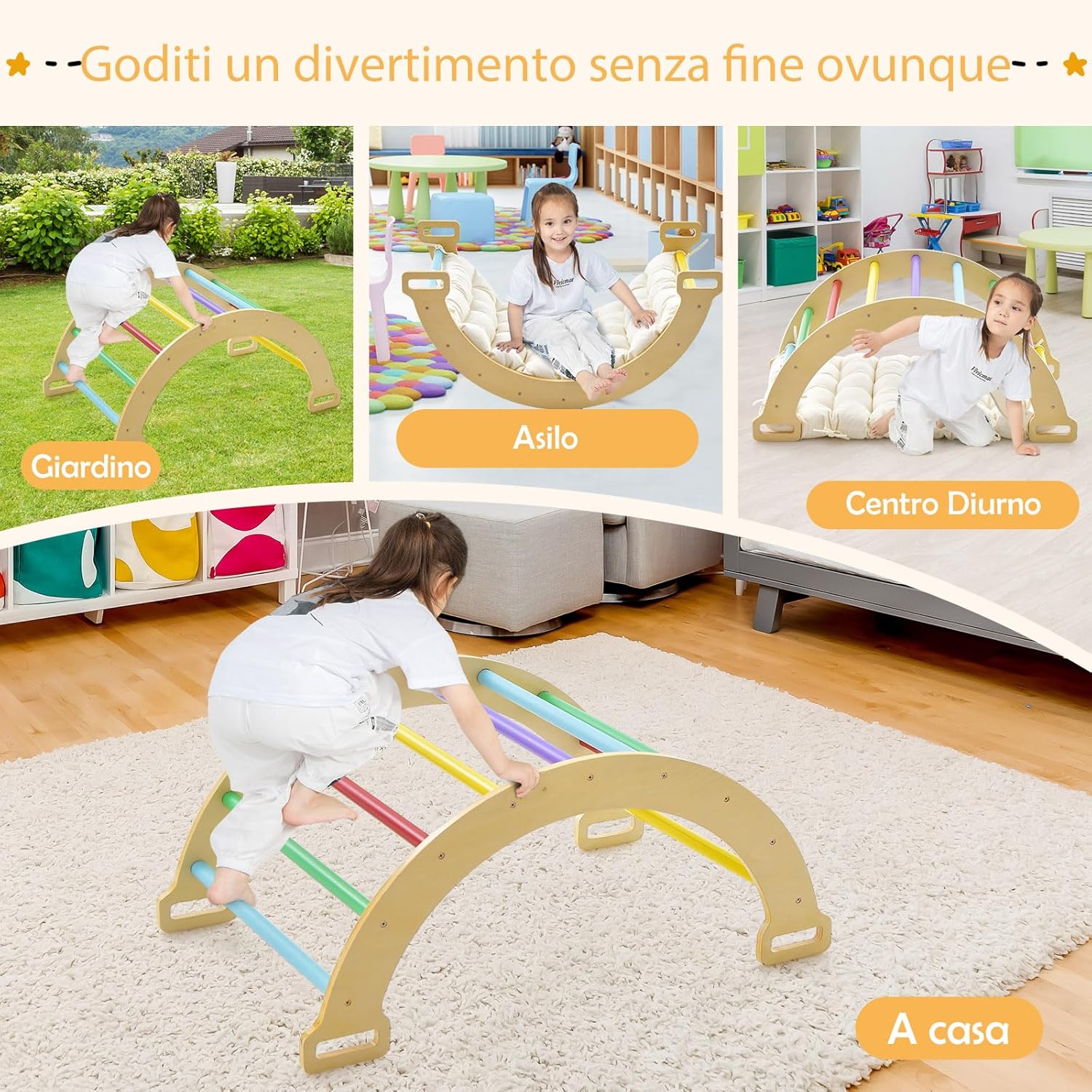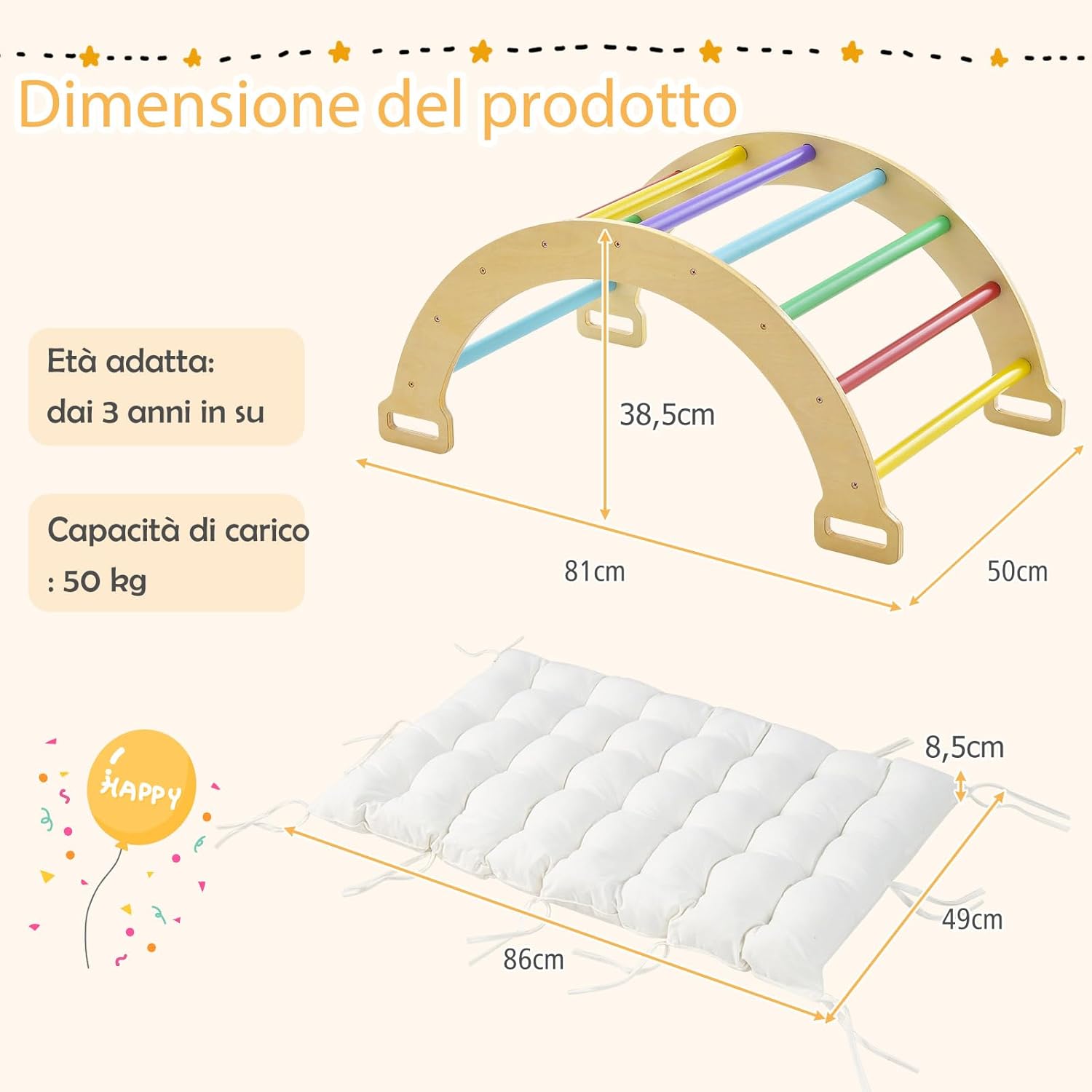 ❤️★Arco da Arrampicata 3 in 1★ Questo arco da arrampicata può essere utilizzato come scala per arrampicarsi o tunnel per sviluppare coordinazione ed equilibrio dei bambini, o come sedia a dondolo per rilassarsi. 🏆★Cuscino Morbido e Confortevole★ Il cuscino morbido, imbottito in cotone, può essere fissato saldamente alla sedia a dondolo con cinghie e offre un comfort extra al tuo bambino. 💪★100% Legno Naturale e Pittura Ecologica★ La scala è realizzata in legno naturale,aumentando la durata. La vernice ecologica e sicura non danneggerà la salute dei bambini. I bordi lisci e arrotondati non graffieranno i bambini. Capacità di carico massima di 50KG. 🌈 ★Dimensioni Compatti★ Misurando 81 x 50 x 38,5 cm, questo giocattolo da arrampicata salvaspazio è il complemento ideale per diversi ambienti interni. Il tuo bambino può usarlo nella sua camera da letto, nella stanza dei giochi, nel soggiorno o all’asilo. 🎁 ★Facile da Montare e Pulire★ Grazie alle istruzioni dettagliate, i pezzi pre-forati e gli accessori completi, è facile completare l’installazione in poco tempo. Il tappetino e la superficie impermeabile sono facile da pulire. Il miglior regalo per i piccoli avventurieri!!!