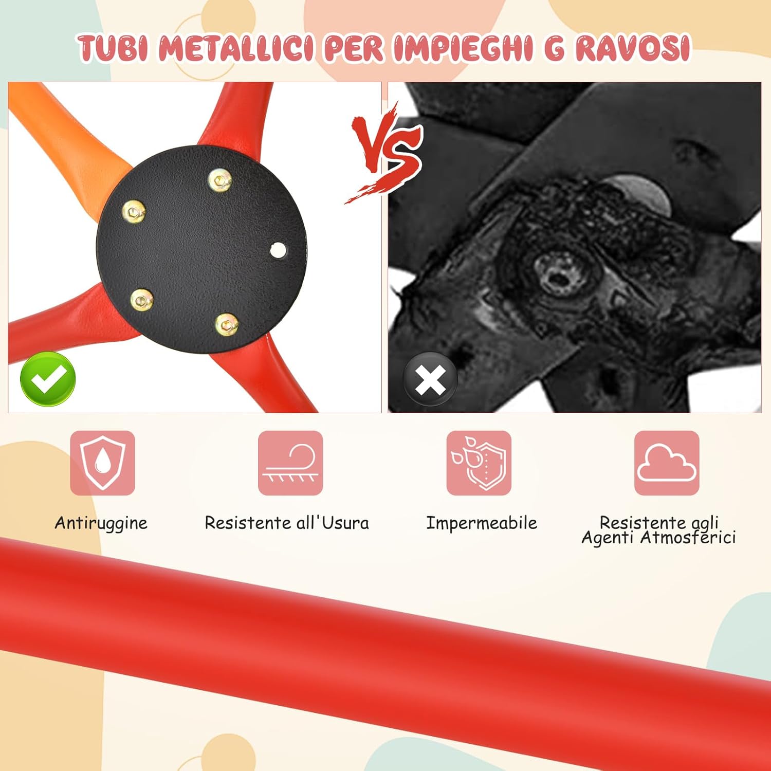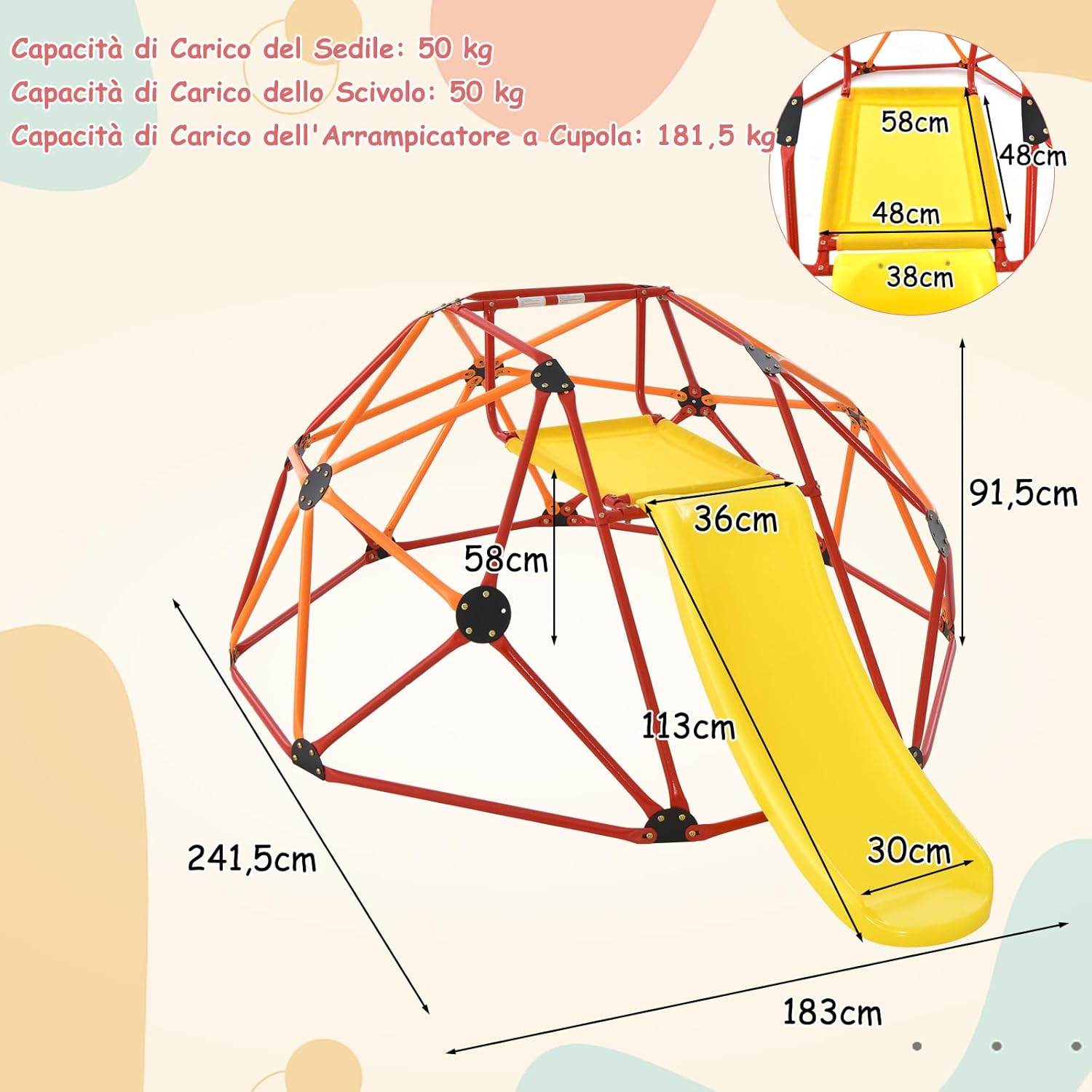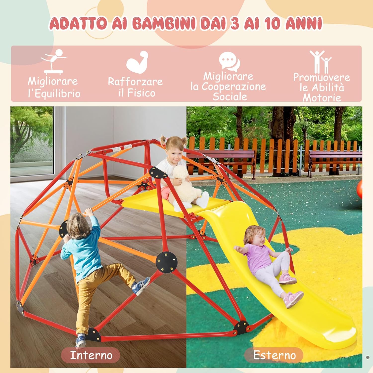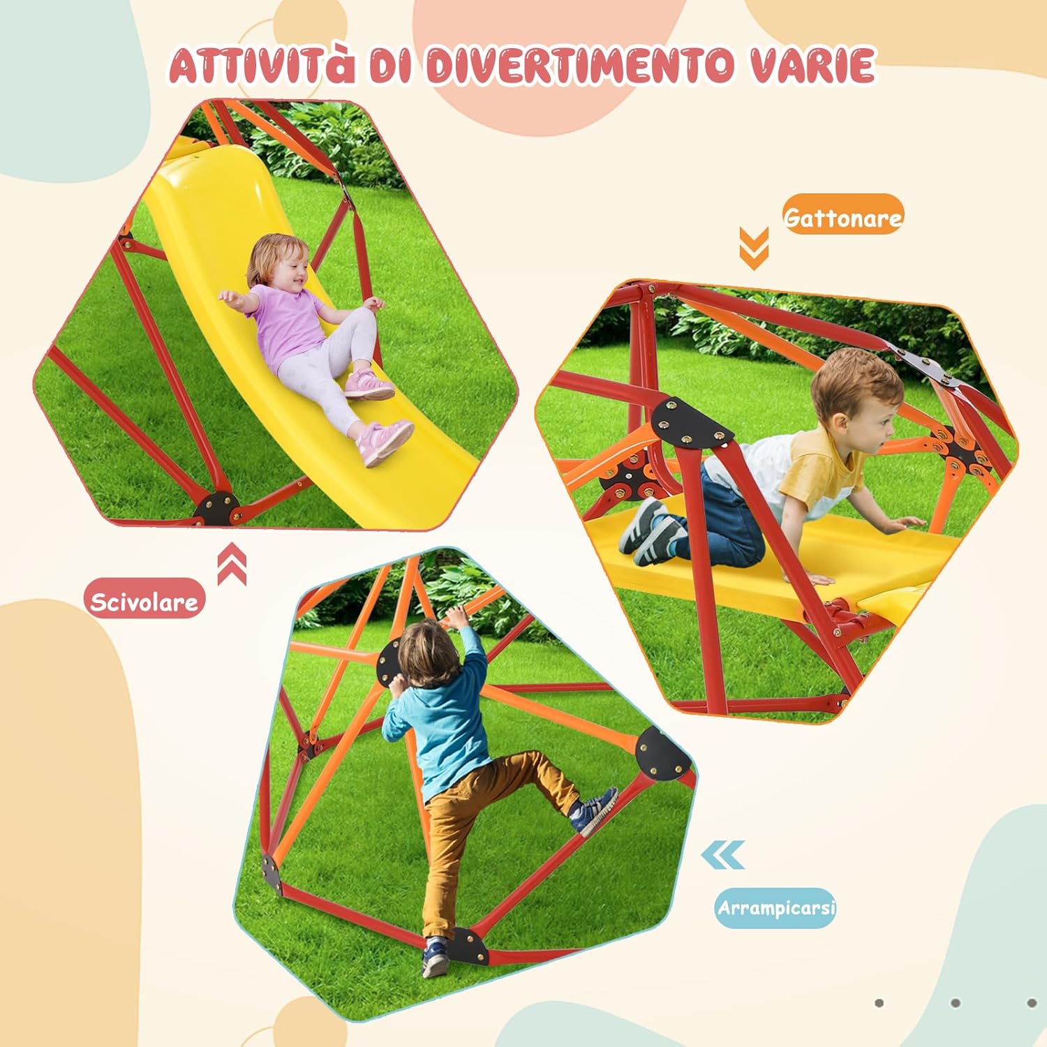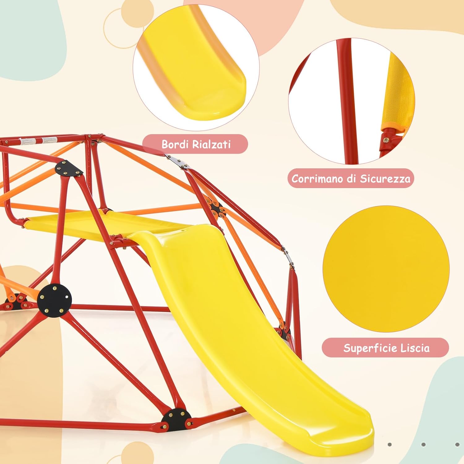 ★Centro giochi multifunzionale★ la nostra struttura da arrampicata emisferica offre ai bambini un'esperienza di gioco arricchente. I bambini possono arrampicarsi e scivolare. ★Materie di alta qualità★ Questa cupola da arrampicata per bambini è realizzata con tubi in acciaio di alta qualità, resistenti alla ruggine, all'usura e agli agenti atmosferici. ★Costruzione robusta e stabile★ La forma triangolare della struttura lo rende più robusto e stabile, permettendogli di sostenere un carico fino a 180kg e lo scivolo e la piattaforma un carico di 50kg. ★Design adatto ai bambini★ la struttura robusta del telaio da arrampicata garantisce che i bambini possano giocare in sicurezza. I corrimano rialzati su entrambi i lati dello scivolo assicurano. ★Facile da assemblare★ Ti forniamo istruzioni di montaggio dettagliate in modo che il montaggio di questo parco giochi per bambini non sia complicato. Questo è il regalo perfetto per i bambini dai 3 ai 10 anni.