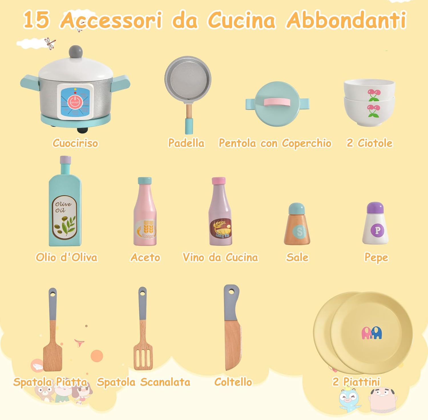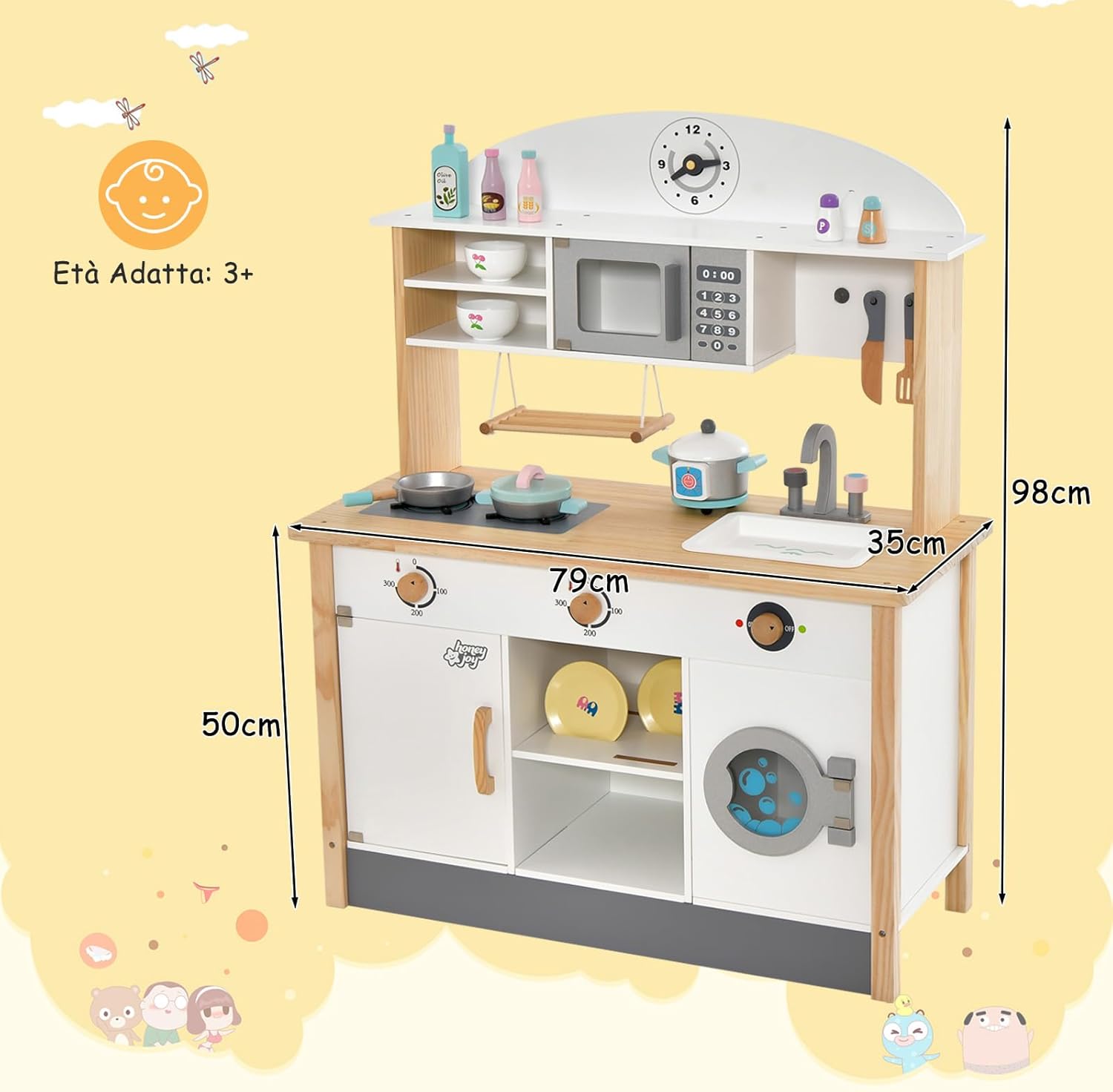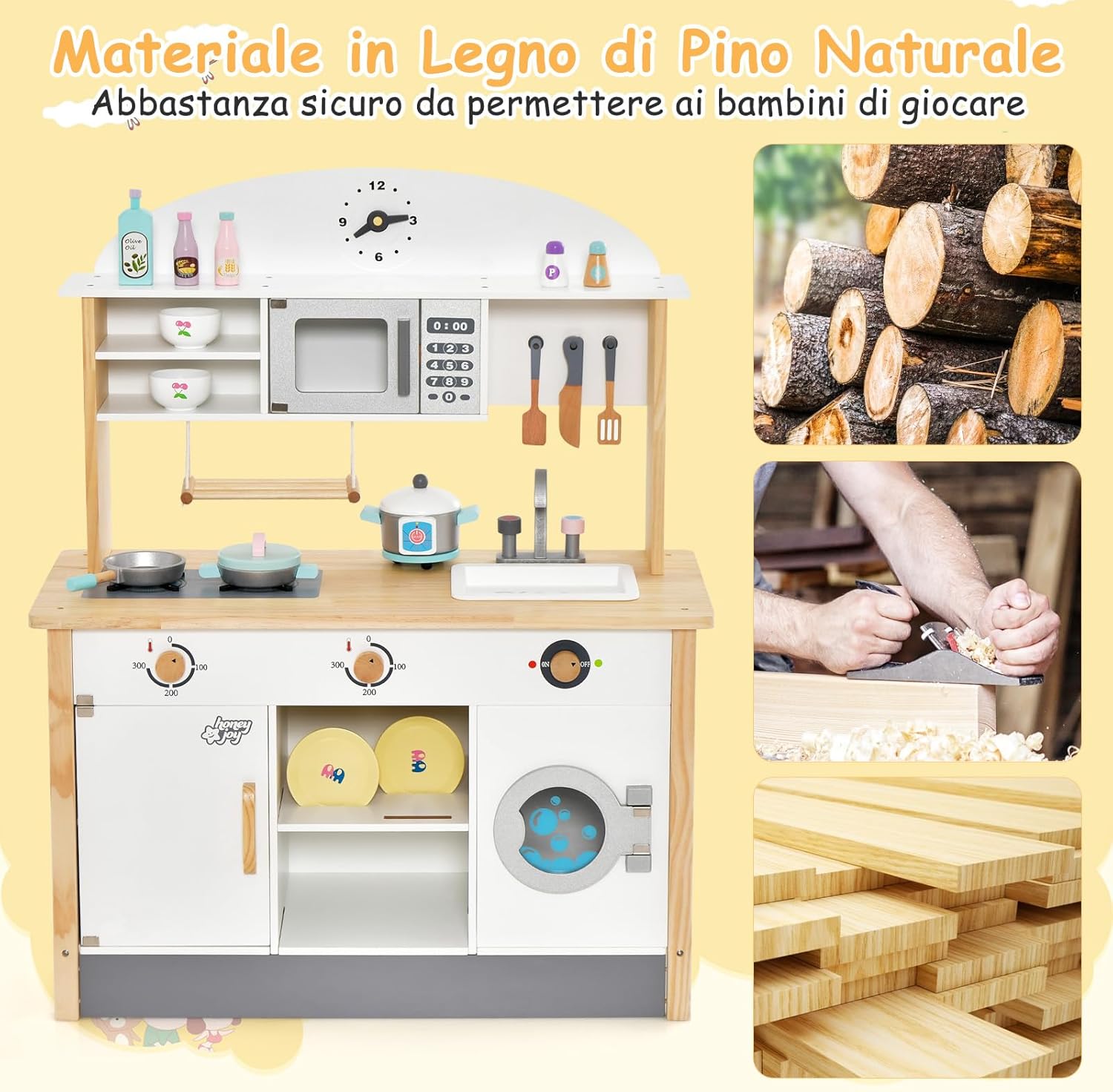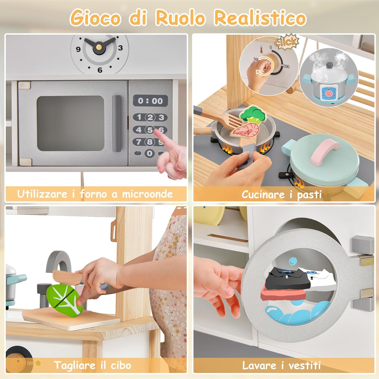 ✅★Mini Cucina★ Questa cucina giocattolo è dotata di forno, fornelli, cappa, microonde e lavatrice per simulare una vera cucina. Indossando grembiule e cappello, il piccolo può imparare a lavare, tagliare e cucinare, come il real chef. ✅★Materiali Atossici e Sicuri★ Realizzata in legno massello e pannello MDF di qualità, la cucina giocattolo ha una struttura robusta. Il rivestimento con vernice ecologica è sicuro e inodore. Angoli levigati per evitare graffi. ✅★Ampio Spazio di Archiviazione★ La credenza e lo scolapiatti consentono di riporre piatti, tazze e utensili da cucina ecc. Il frigorifero apribile può essere utilizzato per conservare "frutta e formaggio". Inoltre, il piano di lavolo spazioso permette ai bambini di cucinare insieme. ✅★Accessori Completi★ Comprende 17 accessori cucina per stimolare il loro interesse per la cucina: 1 cuociriso, 1 padella, 1 pentola con coperchio, 1 coltello, 1 spatola piatta, 1 spatola scanalata, 2 ciotole e 2 piattini, 1 olio d'oliva, 1 aceto, 1 vino da cucina, 1 pepiera e 1 saliera ✅★Ottimo Come Idea Regalo★ I giochi di ruolo influenzano positivamente la creatività e contribuiscono allo sviluppo del bambino. È il regalo perfetto per compleanni, Natale e altre feste.