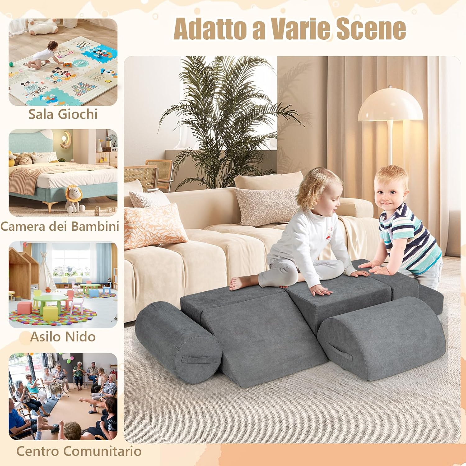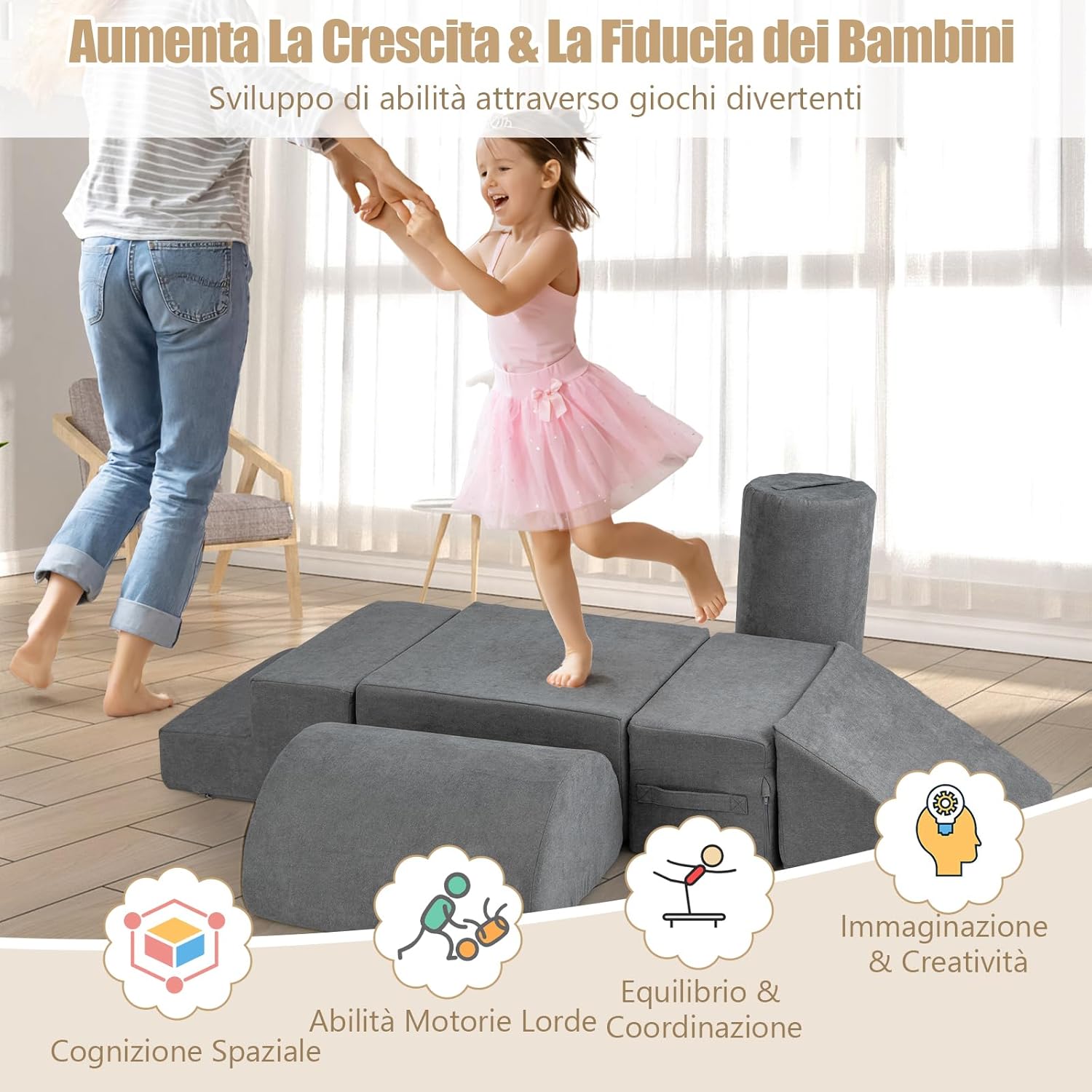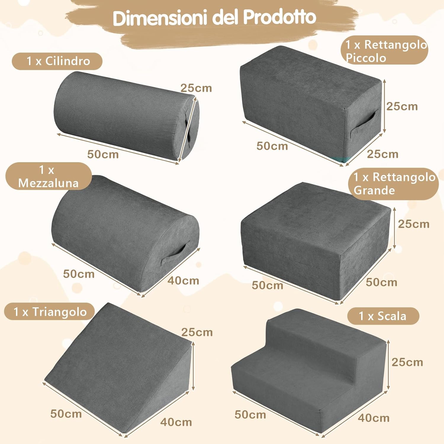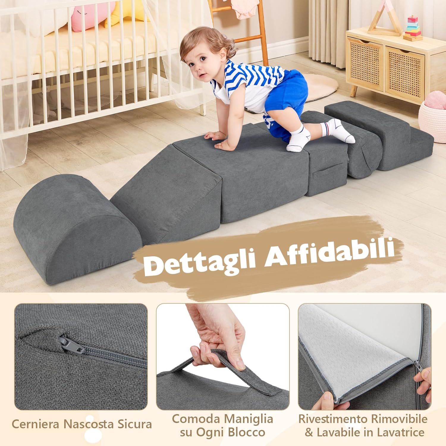 ★Set di Arrampicata da 6 Pezzi★ Progettato per ispirare piccoli arrampicatori ed esploratori, questo set include una varietà di forme: un gradino, un grande rettangolo, un piccolo rettangolo, un cuneo, una mezza luna e un cilindro. È un regalo per stimolare la creatività e lo sviluppo delle abilità motorie nei bambini da 1 a 3 anni. ★Schiuma ad Alta Densità Superiore★ Riempito con schiuma ad alta densità 30D, i blocchi da arrampicata offrono una sensazione accogliente ma di supporto, creando un'area di gioco sicura per i tuoi bambini. Inoltre, la costruzione in schiuma spessa e morbida protegge i bambini dagli impatti. ★Materiale di Sicurezza Premium★ Questo set da arrampicata e strisciamento di 6 pezzi è ricoperto da tessuto ciniglia a contatto con la pelle, che offre un tocco morbido per il comfort durante il gioco. ★Facile Manutenzione e Cura★ I blocchi da arrampicata per bambini sono dotati di coperture lavabili per una facile manutenzione, mantenendoli freschi e puliti con poco sforzo. Attendere 48 ore per un completo recupero e soffiare con un asciugacapelli o battere con le mani per accelerare il processo. ★Design Portatile e Utilizzo Versatile★ Ogni blocco è dotato di una maniglia per un facile trasporto e riorganizzazione. Che si tratti di riorganizzare la nursery o portare un pezzo in un'altra stanza, questi blocchi leggeri favoriscono un'area di gioco coinvolgente in qualsiasi parte della casa.