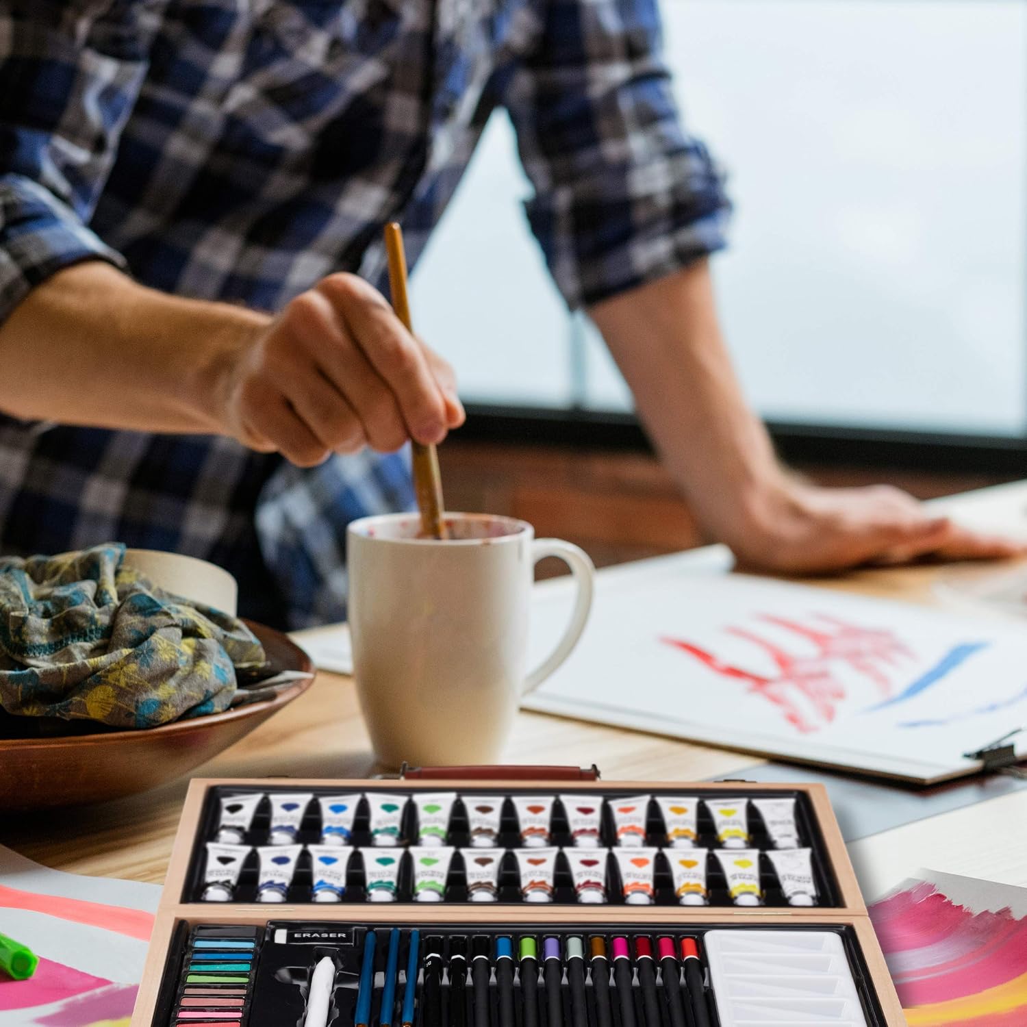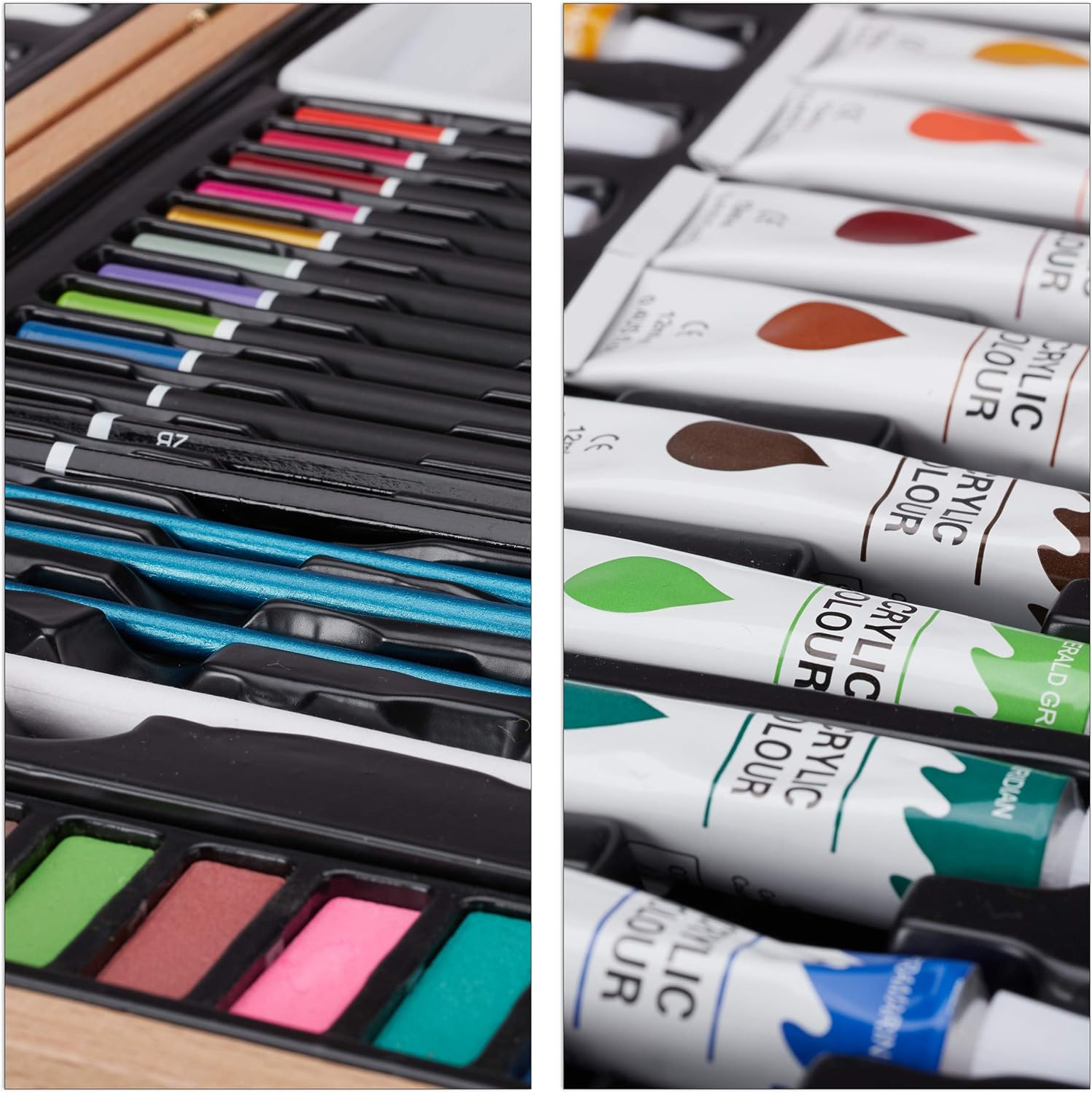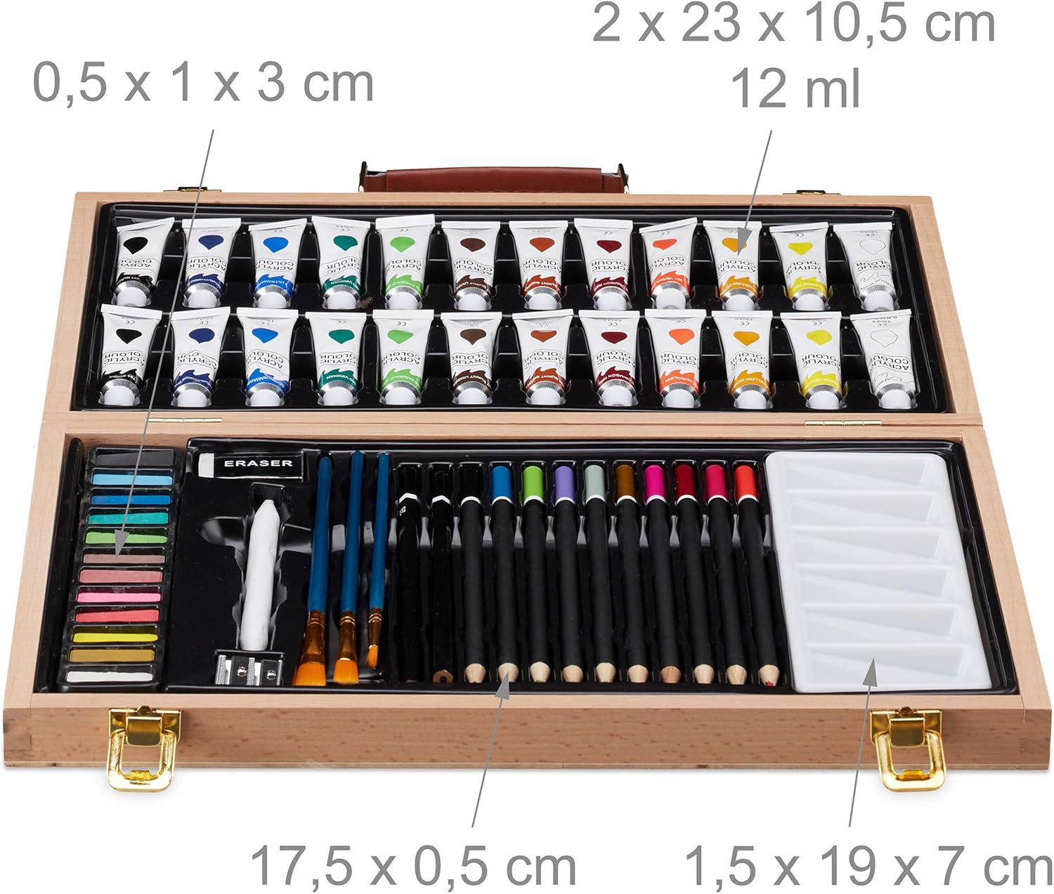 Da pittura: il kit contiene 3 pennelli, 12 colori ad acqua, 1 tavolozza e 1 gamma di colori acrilici Da disegno: il set include 10 matite colorate, 2 matite, una gomma, un temperamatite e uno sfumino In set: valigetta di legno che contiene 56 componenti - ideale per artisti principianti e amatoriali Pennelli: con 3 tipi di pennelli - 2 piatti per le linee più grosse e uno rotondo Creatività: set per artisti per non porre limiti alla fantasia - per disegnare e dipingere