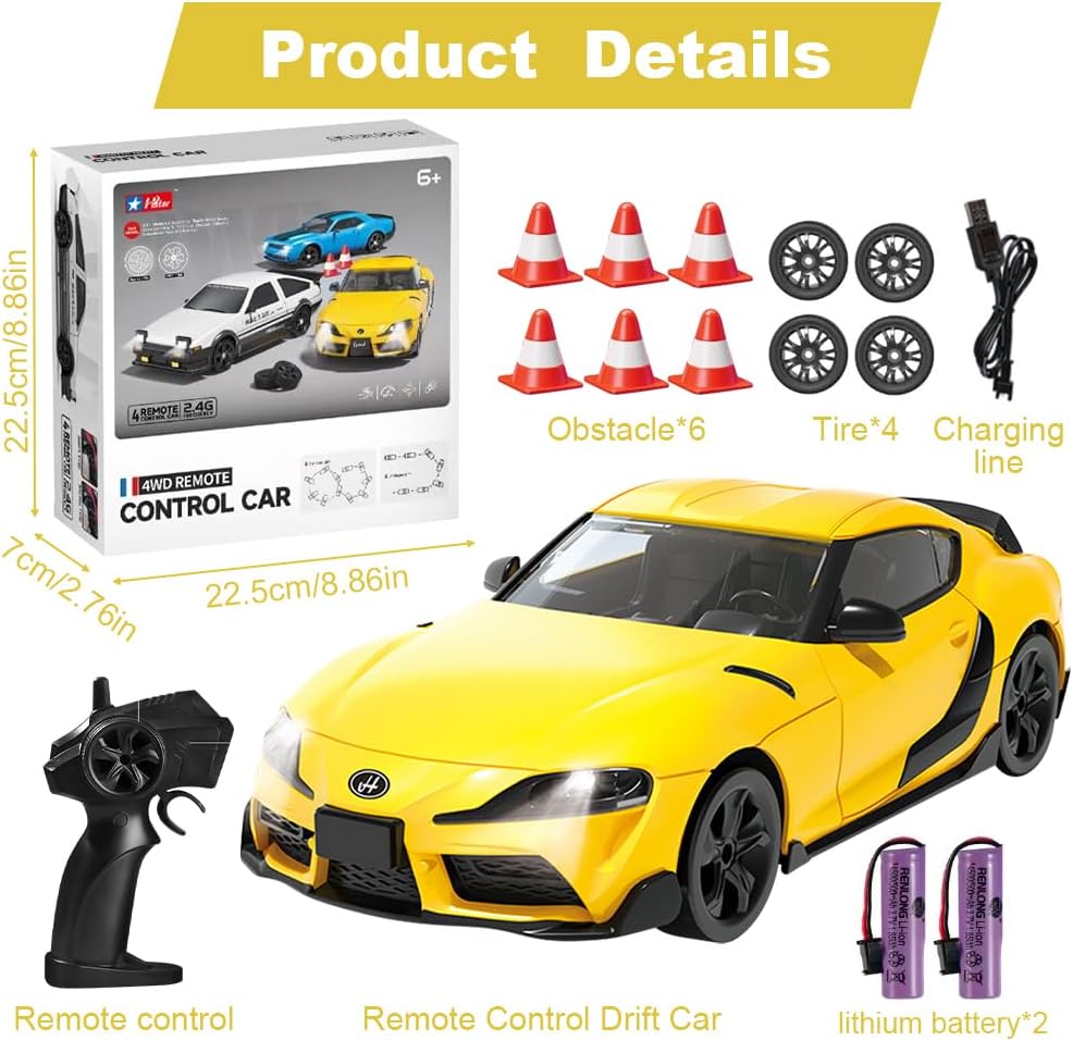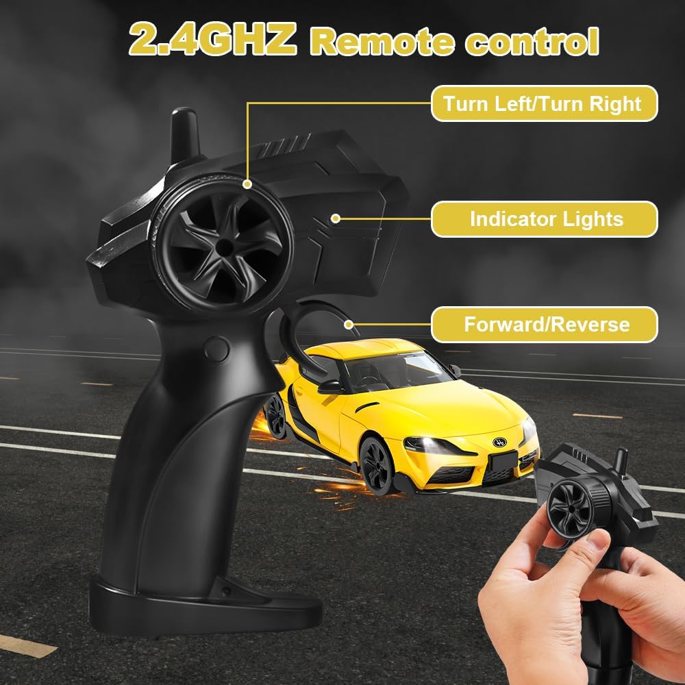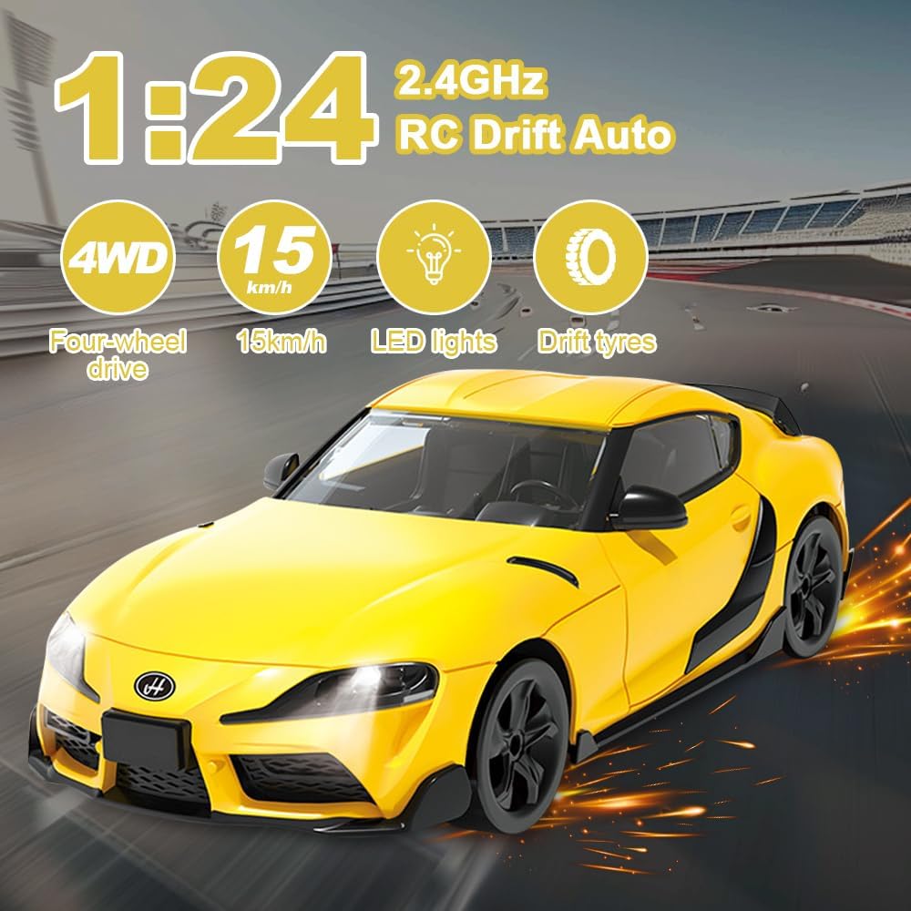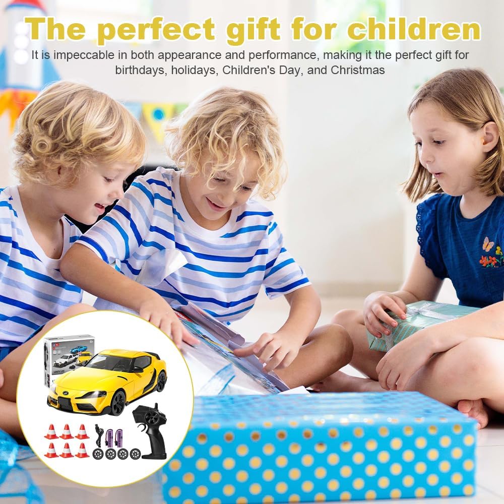 ✨【Resistente, realistico e fresco di notte】: questa Macchina Telecomandata riproduce il modello di auto da corsa in scala 1:24. La scocca esterna è realizzata in PVC, un materiale flessibile e antiurto che non si danneggia facilmente in caso di impatto. L'auto da drift telecomandata è dotata di fari che si accendono quando l'auto è in movimento. Anche quando giochi all'aperto di notte, puoi trovare rapidamente la macchinina telecomandata in movimento anche al buio. ✨【Rotazione a 360° e controllo di precisione wireless a 2,4 GHz】: la Remote Control Car può ruotare di 360° per aumentare la velocità di guida, regolare l'interruttore di velocità in senso antiorario per ridurre la velocità di guida e girare e ha una tecnologia anti-interferenza stabile a 2,4 GHz integrata per uno sterzo sensibile e preciso. ✨【Accessori completi e funzionamento semplice】: la Remote Control Car è dotata di 4 pneumatici e 6 blocchi stradali per soddisfare diverse modalità di guida e requisiti di difficoltà. Il telecomando portatile a forma di pistola è semplice e facile da usare (il telecomando richiede 2 batterie AA), così anche i principianti possono imparare rapidamente a giocare e divertirsi. ✨【Telecomando e durata della ricarica】Questa tecnologia di controllo remoto della Remote Control Car ha un segnale stabile, una lunga distanza di controllo e supporta più persone che giocano contemporaneamente senza interferire tra loro. Questa mini auto RC da 2,4 GHz con luce LED è dotata di una batteria al litio integrata ad alta capacità e di un cavo di ricarica USB, che può garantire ore di intrattenimento continuo grazie alla resistenza della carica. ✨【Regalo perfetto】: Macchina Telecomandata è un regalo perfetto per bambini dai 5 anni in su per compleanni, Halloween, Natale, Ringraziamento e altre festività importanti, che può aiutare i bambini a sviluppare le loro capacità motorie e la coordinazione occhio-mano divertendosi, consentendo ai bambini di provare il divertimento di guidare un'auto.