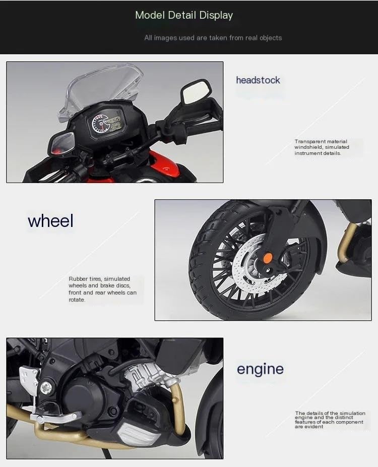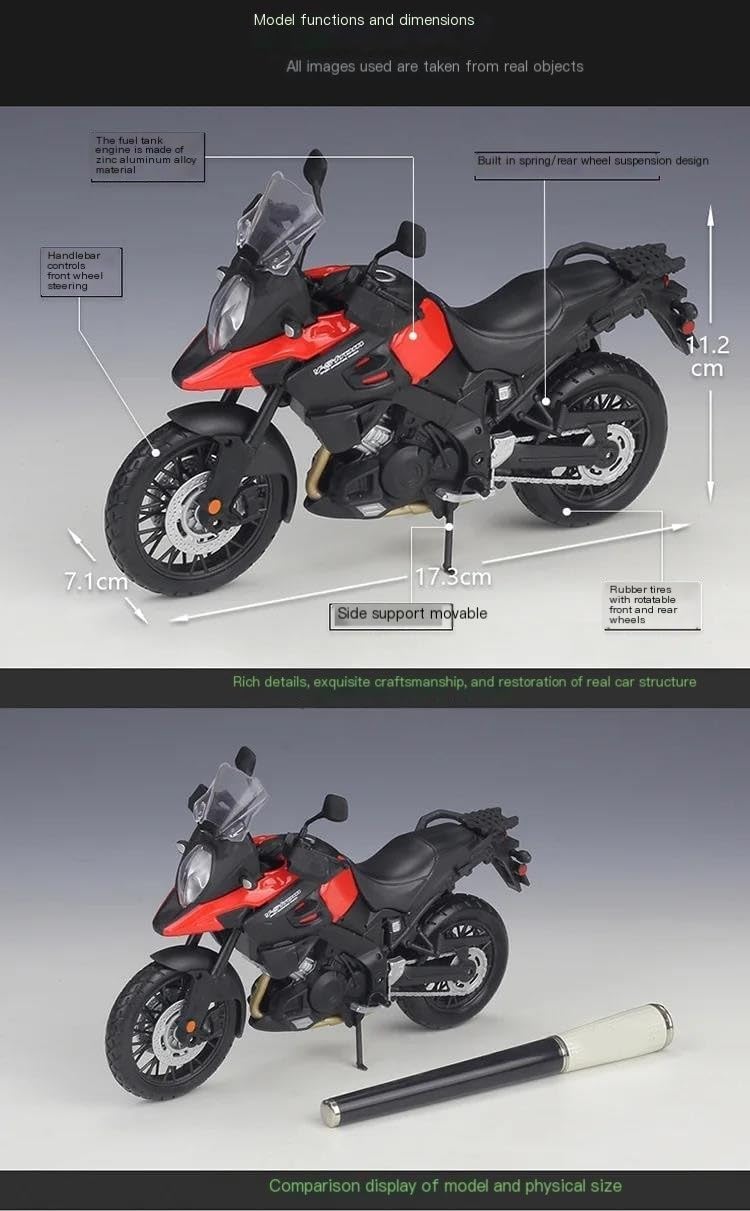 Modello di motocicletta per V-Storm Modelli di motociclette giocattolo in scala 1:12, parti squisite progettate secondo le proporzioni originali dell'auto, cruscotto, pedali del freno e dell'acceleratore sono progettati per essere realistici e precisi. la modalità di simulazione della motocicletta è piena di personalità, così bella. Le ruote anteriori e il manubrio possono oscillare da un lato all'altro. Porta-attività, Sospensione posteriore a molla, Ruota libera La finitura liscia e senza sbavature e la vernice lucida e uniforme dimostrano una maestria artigianale eccezionale. Questo modello incarna lo stile di una motocicletta, soddisfacendo l'amore degli appassionati per i modelli nostalgici.