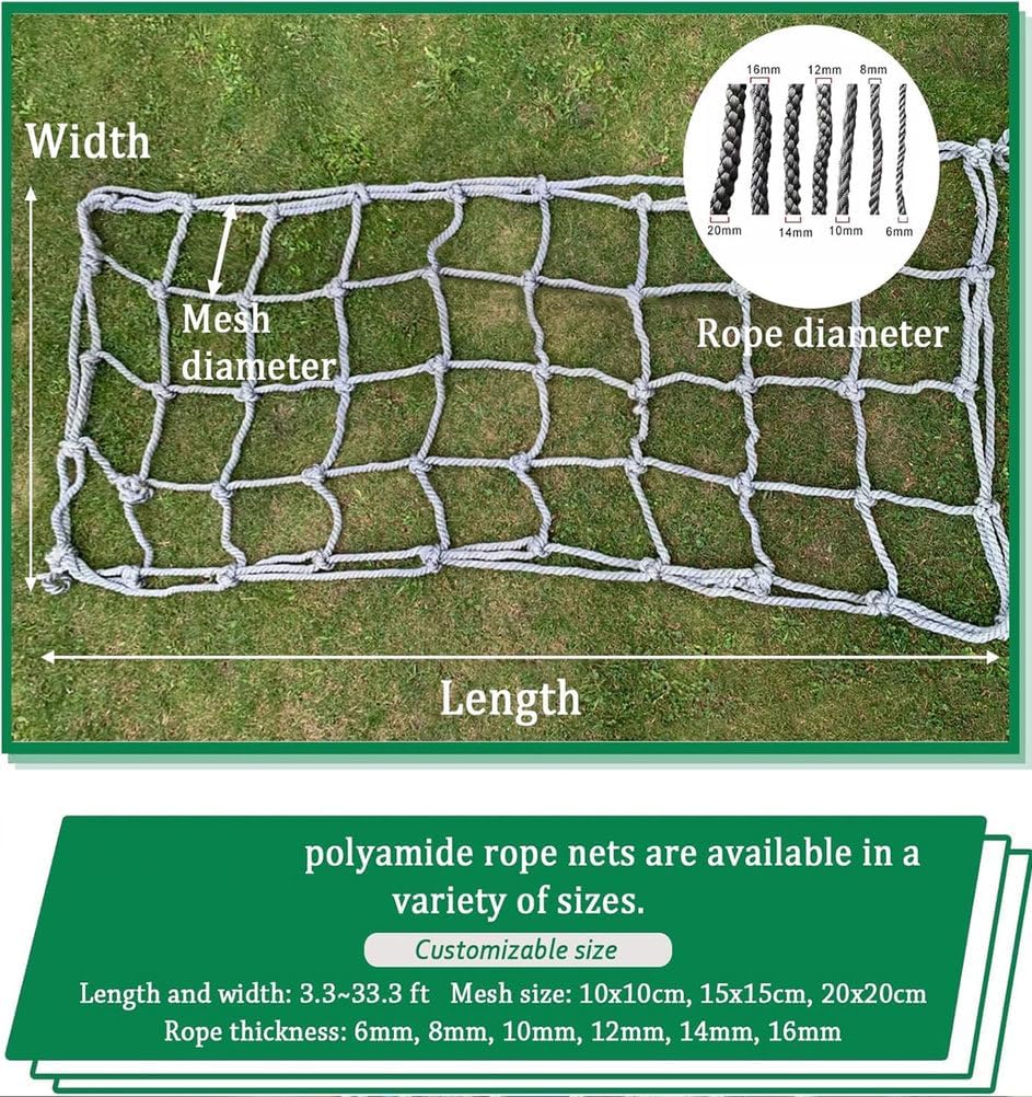 Sperimenta una maggiore sicurezza con il nostro supporto resistente da 399,6 kg, perfetto per arrampicata in famiglia e sicurezza sul balcone. Questa soluzione robusta offre stabilità per 4+ utenti, rendendola una scelta eccellente per riunioni o attività all'aperto. Affidati alla sua resistenza e durata per garantire che i tuoi cari siano al sicuro durante ogni salita o momento di svago. Design ottimizzato per la sicurezza: la nostra rete da 20 x 20 cm con corde da 10 mm è perfetta per l'allenamento dell'equilibrio e il miglioramento della coordinazione nei bambini. Ideale per sviluppare le capacità motorie garantendo sicurezza durante il gioco. Versatile ed efficace, questo strumento di allenamento è adatto per varie attività, rendendolo una preziosa aggiunta alla tua routine di fitness o al tempo di gioco dei bambini. Kit pronto all'uso: questo versatile accessorio da campeggio include 1 rete e 1 corda per legare, progettato per una facile installazione e una conservazione efficiente. Perfetto per le avventure all'aperto, questo kit compatto si arrotola senza sforzo, rendendolo un'aggiunta essenziale alla tua attrezzatura da trekking. Goditi comodità e funzionalità con questo affidabile compagno di viaggio, ideale per tutte le tue esigenze all'aperto. All-in-One Play & Protect:: Utilizzare come rete da carico da arrampicata, barriera per parco giochi, amaca e altro ancora Kit pronto all'uso: include 1 rete e 1 corda per legare, si arrotola facilmente per riporla.